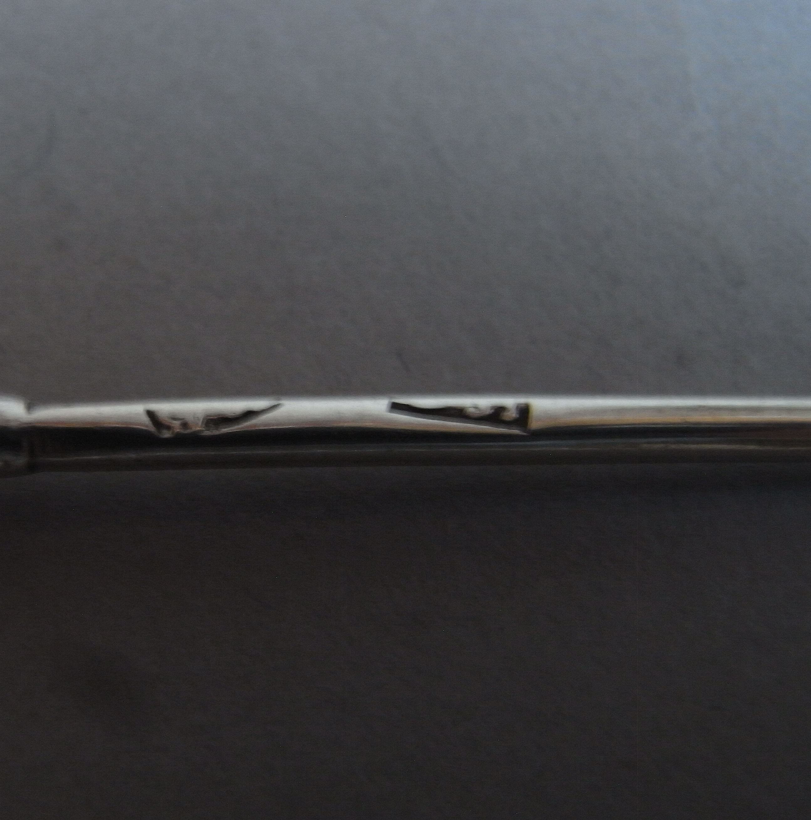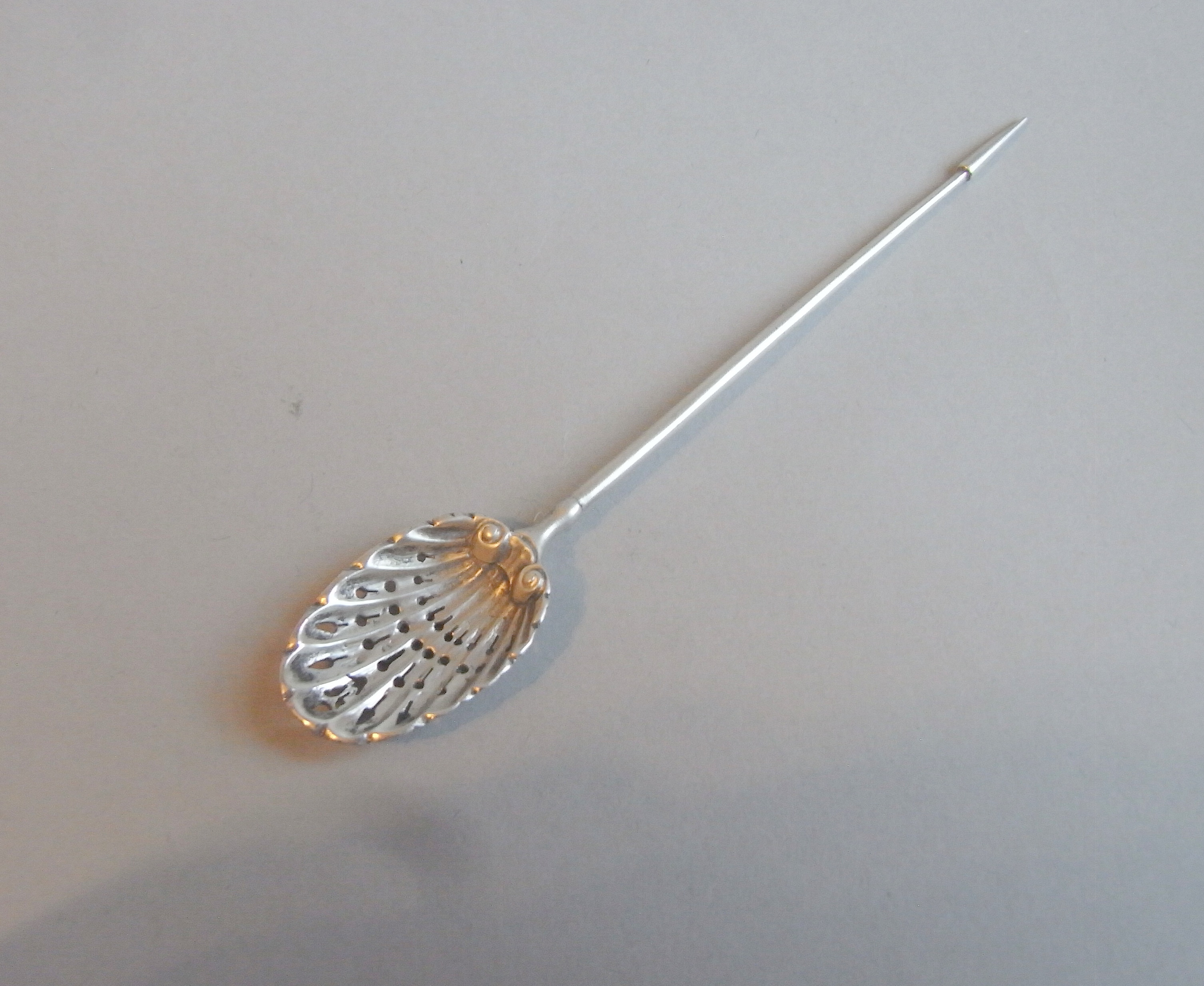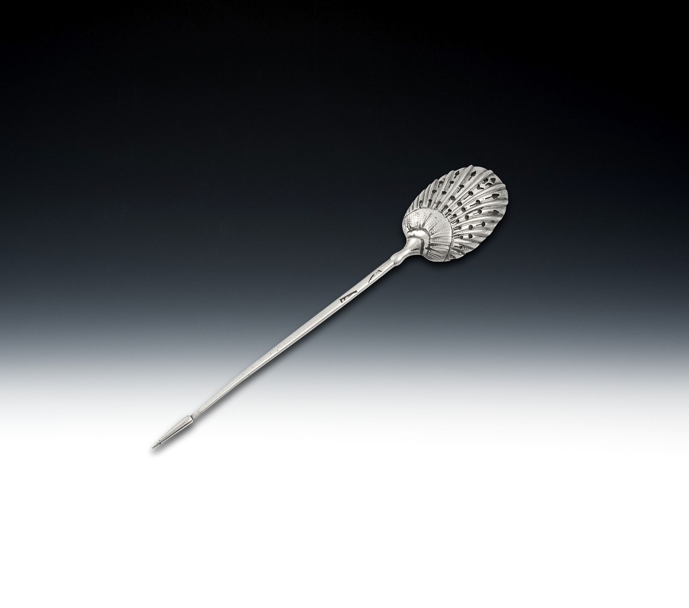 This rare George II mid 18th century cast silver Mote Spoon is of a unusual small size and made in the Rococo style, the plain tapering handle with diamond point finial. It was almost certainly made in London circa 1740. The leaf or acorn shaped bowl is pierced with scrolling foliate stems and is decorated with shell details and scrolls. This piece is in quite excellent condition and is unusual being cast, as most were pierced from thinner sheet silver and are not modelled in such a beautiful design. These examples were obviously made for the top end of the market. As you will appreciate, the stems of the mote spoon are marked and then shaped afterwards, so very seldom are you able to read the marks, however you can clearly see the back legs of the lion sterling mark and part of the letter "B" in the maker's mark.