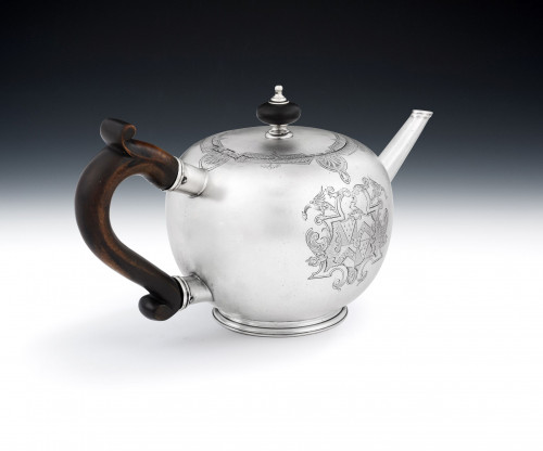 The Jug stands on an applied spreading foot which is decorated with a reeded band. The main body is baluster in shape and displays a sparrow beak pouring spout and S scroll handle. The Jug is well marked in the foot and is also engraved with various sets of contemporary initials.