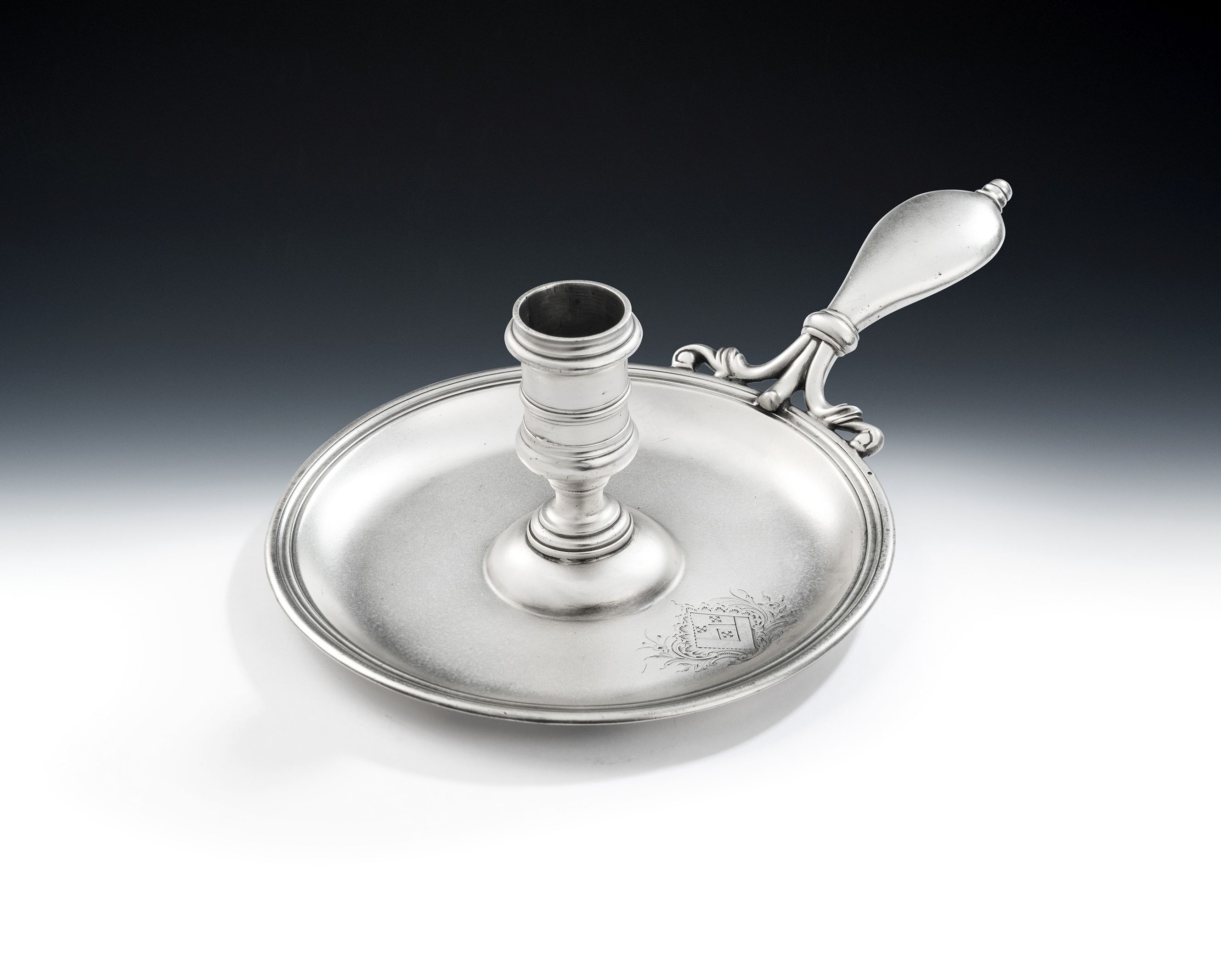 The Chamberstick is modelled in the scarce and early "frying pan" form. The main body is circular in form, with a raised reeded edge and the baluster shaped central section rises to an everted top. The baluster shaped handle has bi-furcated scroll mouldings where it is attached to the main body and terminates in an urn shaped end. The base well is engraved with a contemporary Armorial surrounded by a Rococo shell and foliate spray cartouche. The underside of the base displays a full set of hallmarks including the distinctive Gothic script mark of John Cafe, with circular device above. This mark is shown in " London Goldsmith's 1697-1837 - Their Marks and Lives " - Mark 1228, page 94, entered 13th December, 1742. This piece is in excellent condition and is of a very good colour and weight. This is one of the earliest forms of chamberstick and is very desirable being made by the specialist Candlestick maker, John Cafe. He had been apprentice to James Gould in 1730 and his first mark was entered in August 1740. He had workshops in Foster Lane and it would appear that the Cafe family had a monopoly in candle related silver production at this date. John cafe died in 1757.