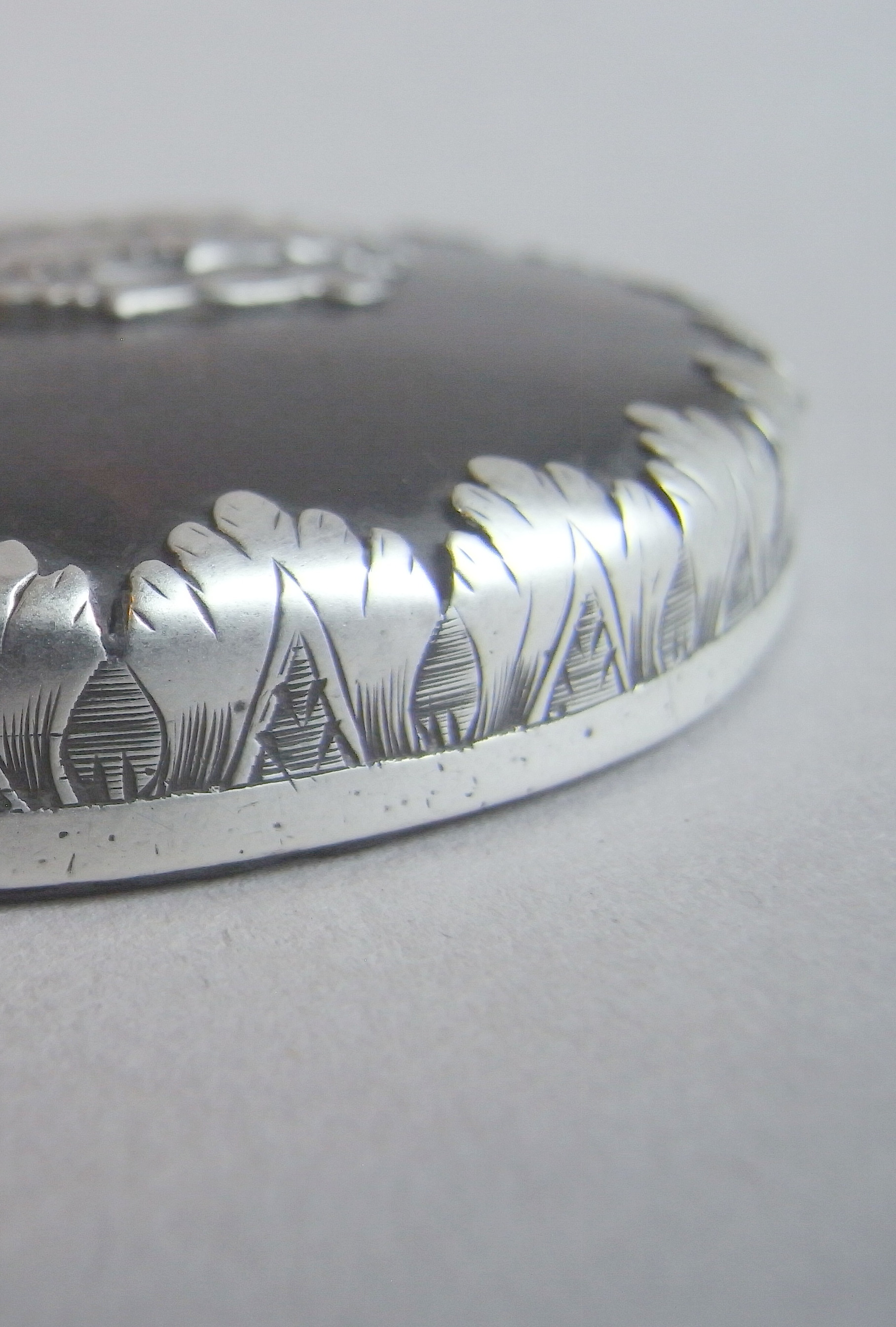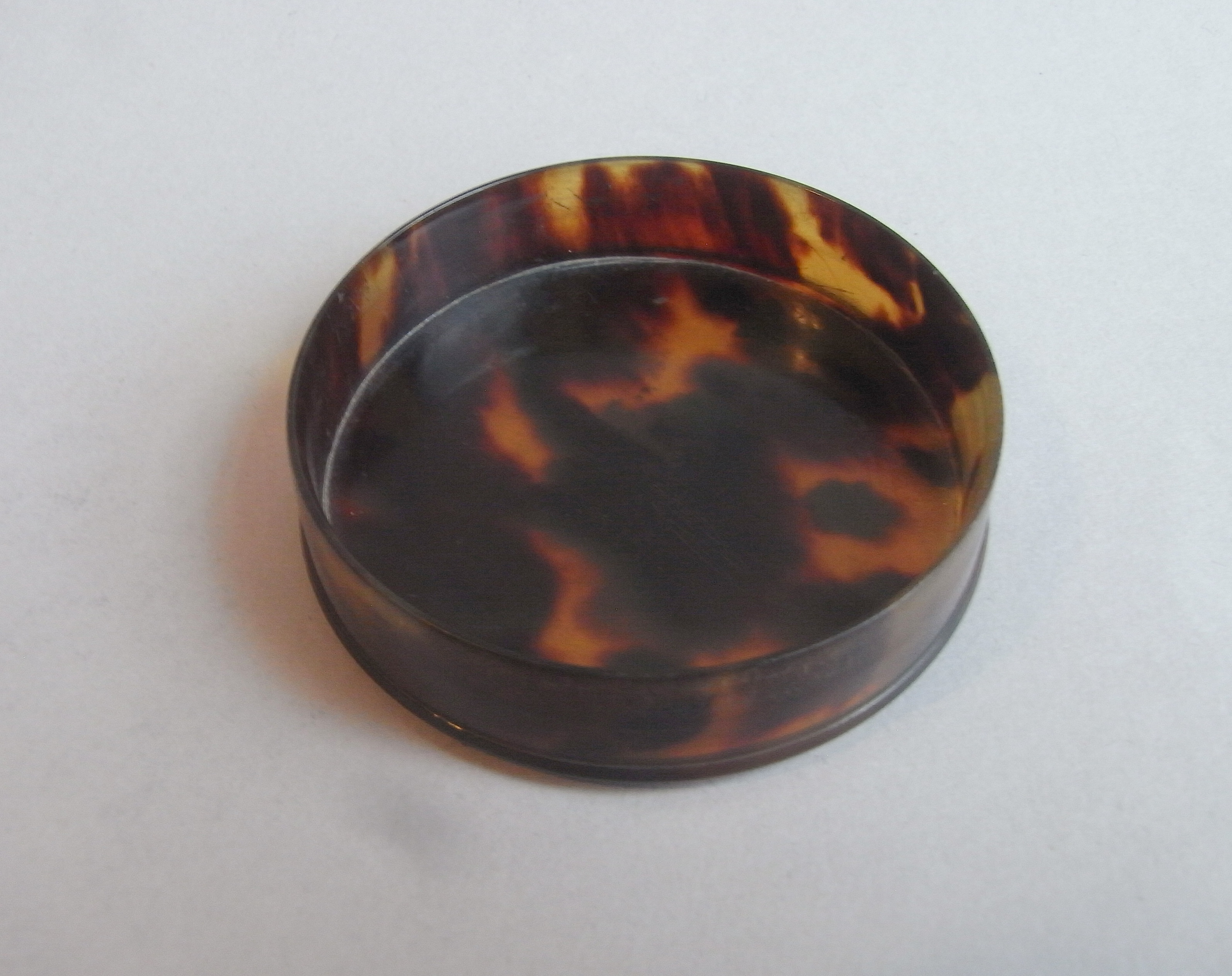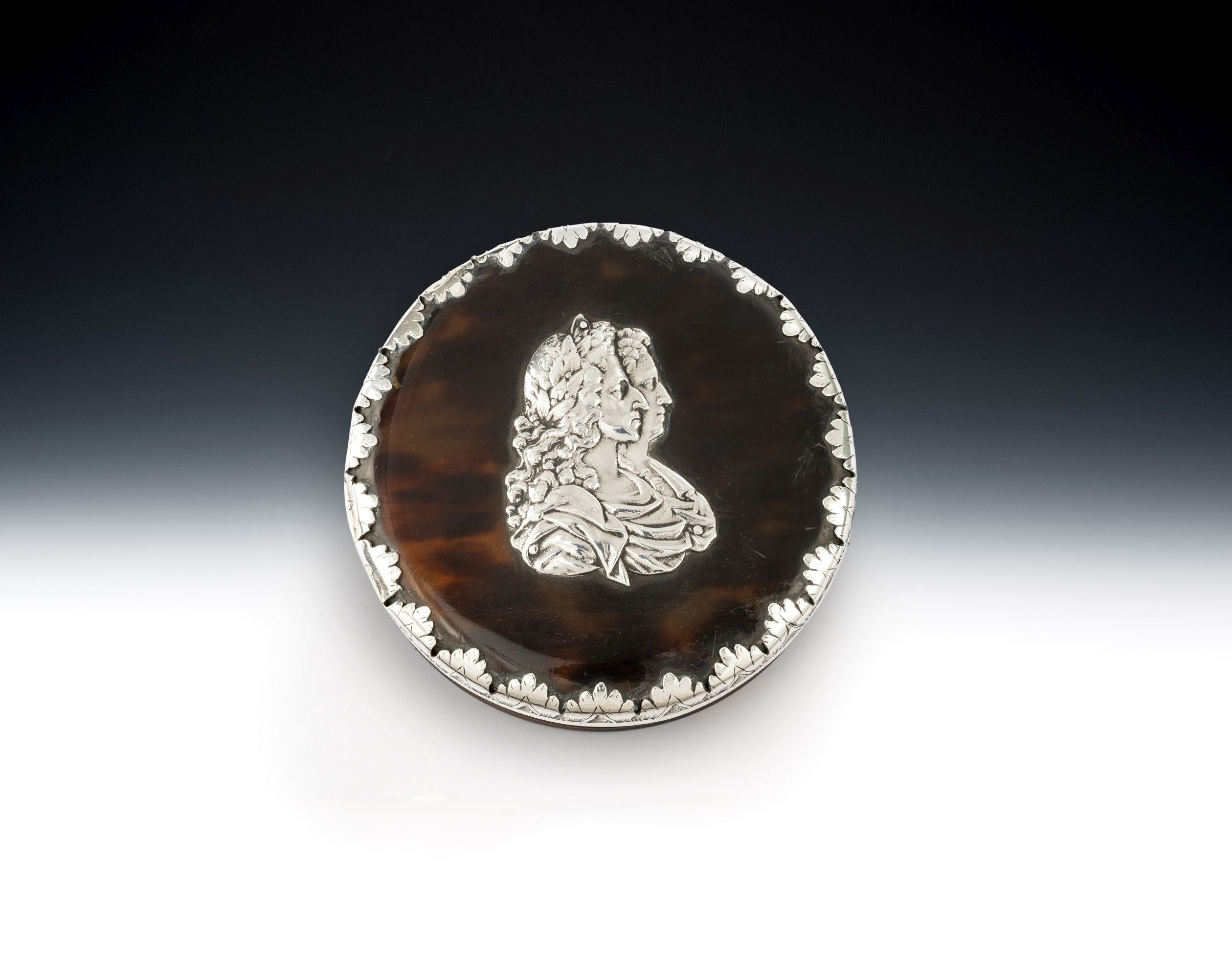 The box is circular in form with a plain tortoiseshell base. The tortoiseshell pull-off cover has a beautiful silver rim decorated with stylised engraved foliate motifs, and arrow head motifs. The centre displays a double profile portrait of Queen Mary II & King William III of Great Britain. The King and Queen are dressed as a Roman Emperor and Empress. This portrait is identical to that as used on the "Church" medal which was issued to commemorate the restoration of the Church of England under William & Mary. As you will appreciate, they were installed as monarchs after the forced abdication of the Catholic James II. The box, and silver mounts, are in excellent condition. This is a rare survivor from the short reign of William & Mary, as Mary was to die in December 1694 and William went on to reign alone until his death in 1702.