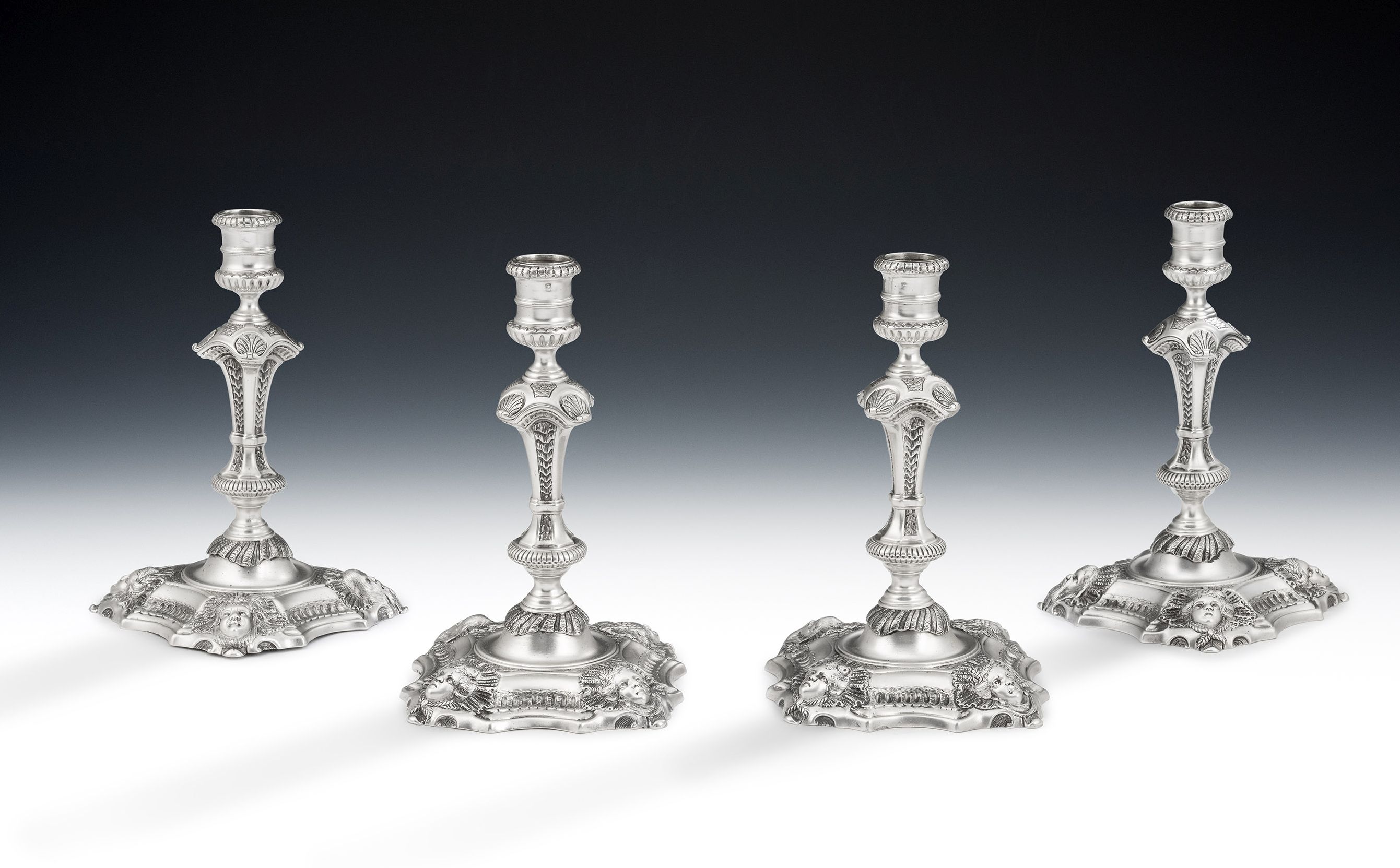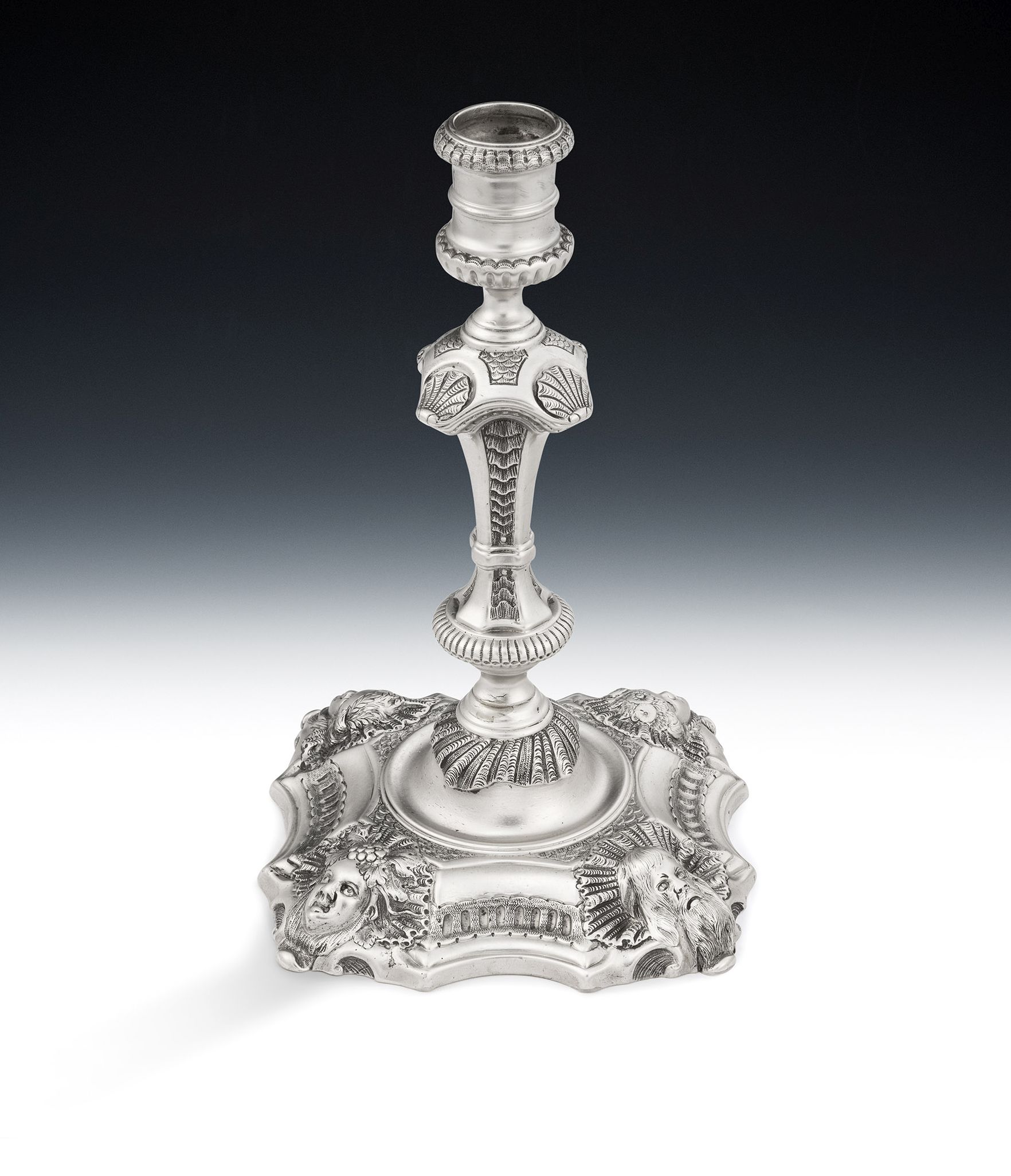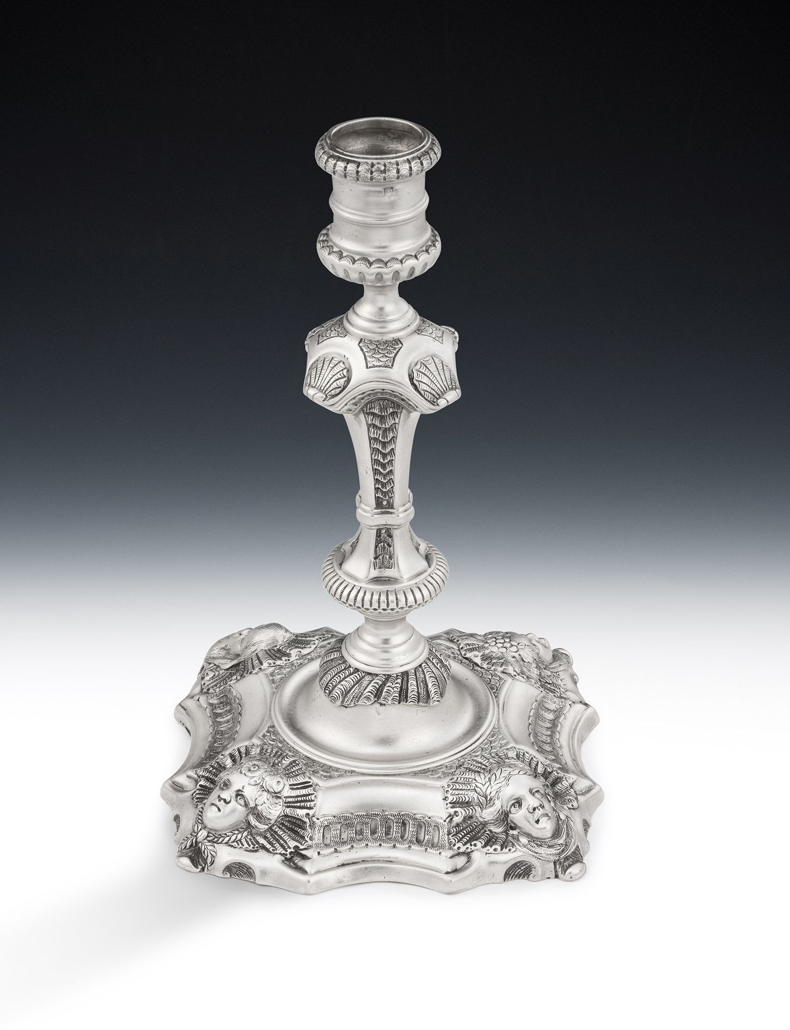 The Candlesticks are cast and stand on a shaped square base. Each is finely chased in each corner with a different mask detailing one of the four seasons. The sunken circular base well rises to faceted shouldered stems chased with Rococo shells, scale work and lobing. The spool shaped candle sockets are decorated with lobing and a horizontal girdle. The Candlesticks are in excellent condition, are of a fine colour, and are fully marked in the base. These are modelled in a most unusual design, executed in the quality expected from the workshops of George Wickes.