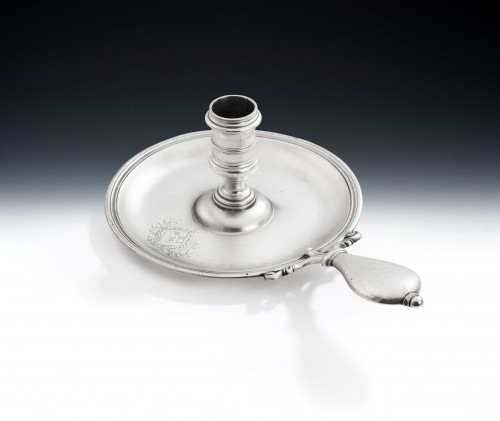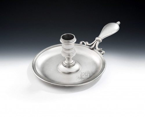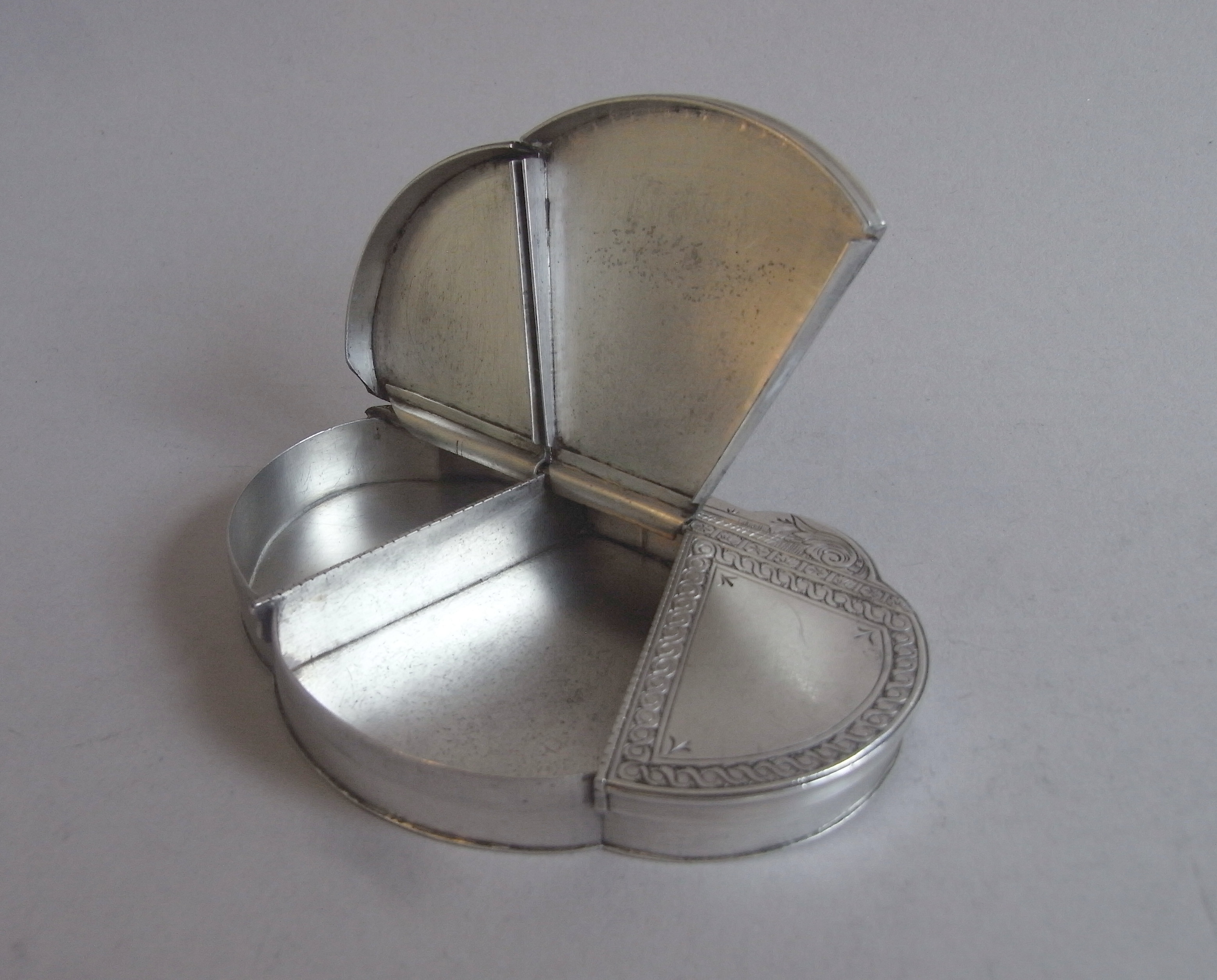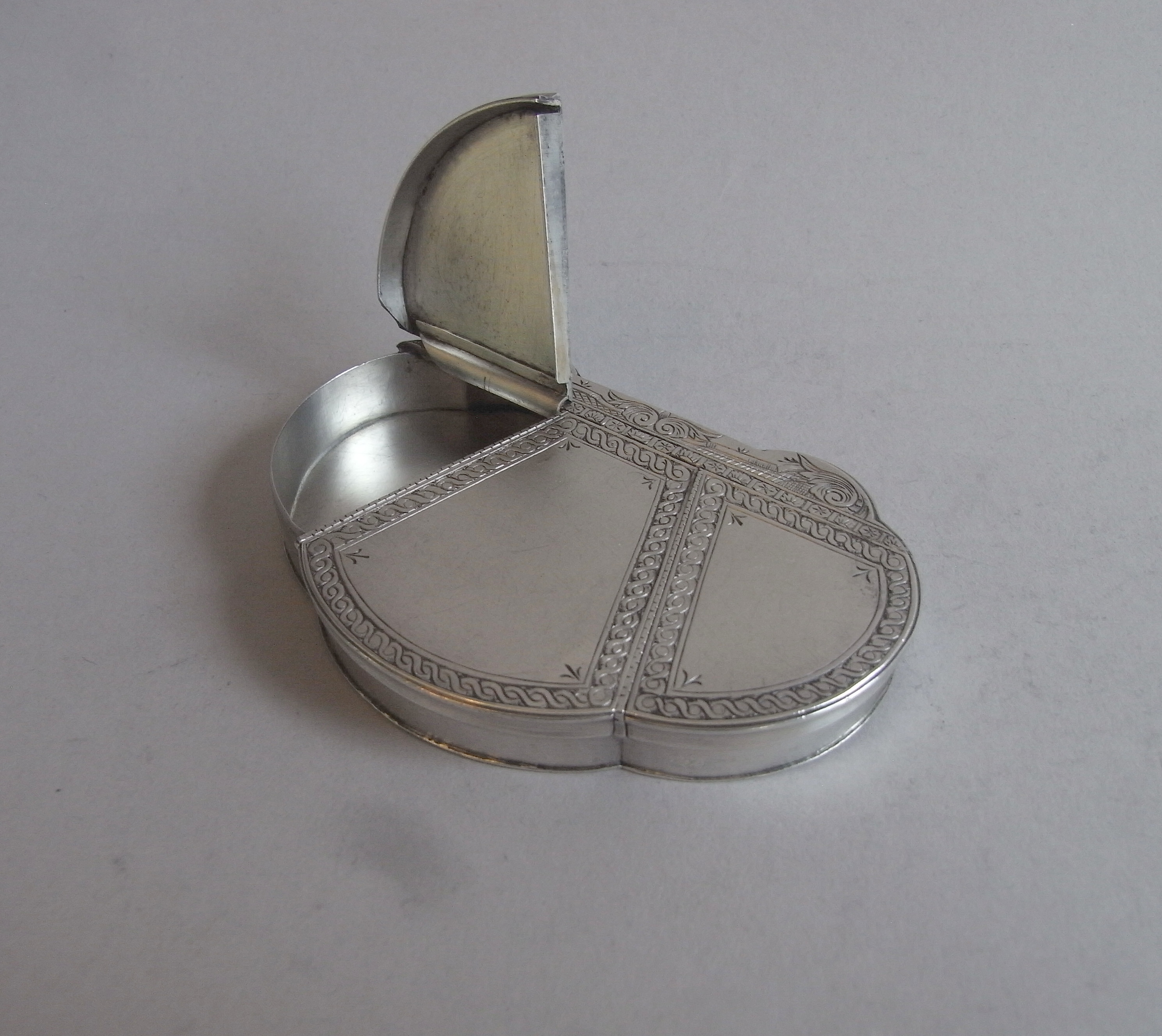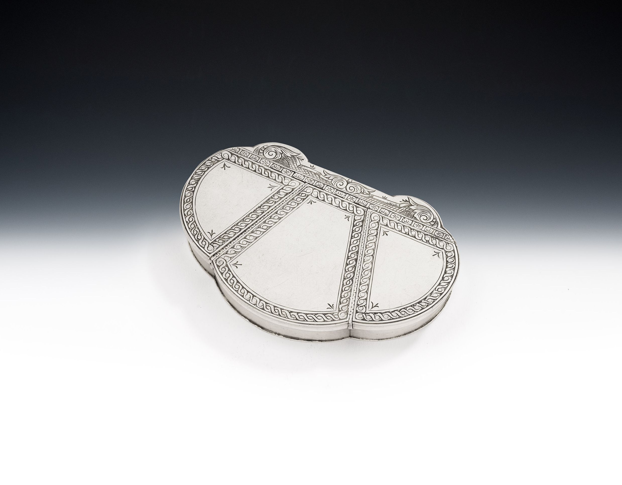 The box is of a wide escutcheon form with three flush hinged covers, the three interior compartments were for three different types of Snuff. The hinged covers are decorated with exceptional engraving displaying ropework borders. The hinge is finely concealed with shell and star engraved motifs below a band of foliate scroll work and trellis designs. The sides and base are plain in design and this piece is in quite outstanding condition. The quality of production and decoration is exceptional, as the engraving has been executed to the highest standard and this would have been a very difficult piece to make. Although unmarked, this was almost certainly made in London and the style of engraving is English and circa 1720. Double Snuff Boxes are rare, however we only know of one other triple snuff box which was contained in the important "Lion Collection of British Silver Boxes" and which is illustrated on page 120 of the catalogue of the collection.