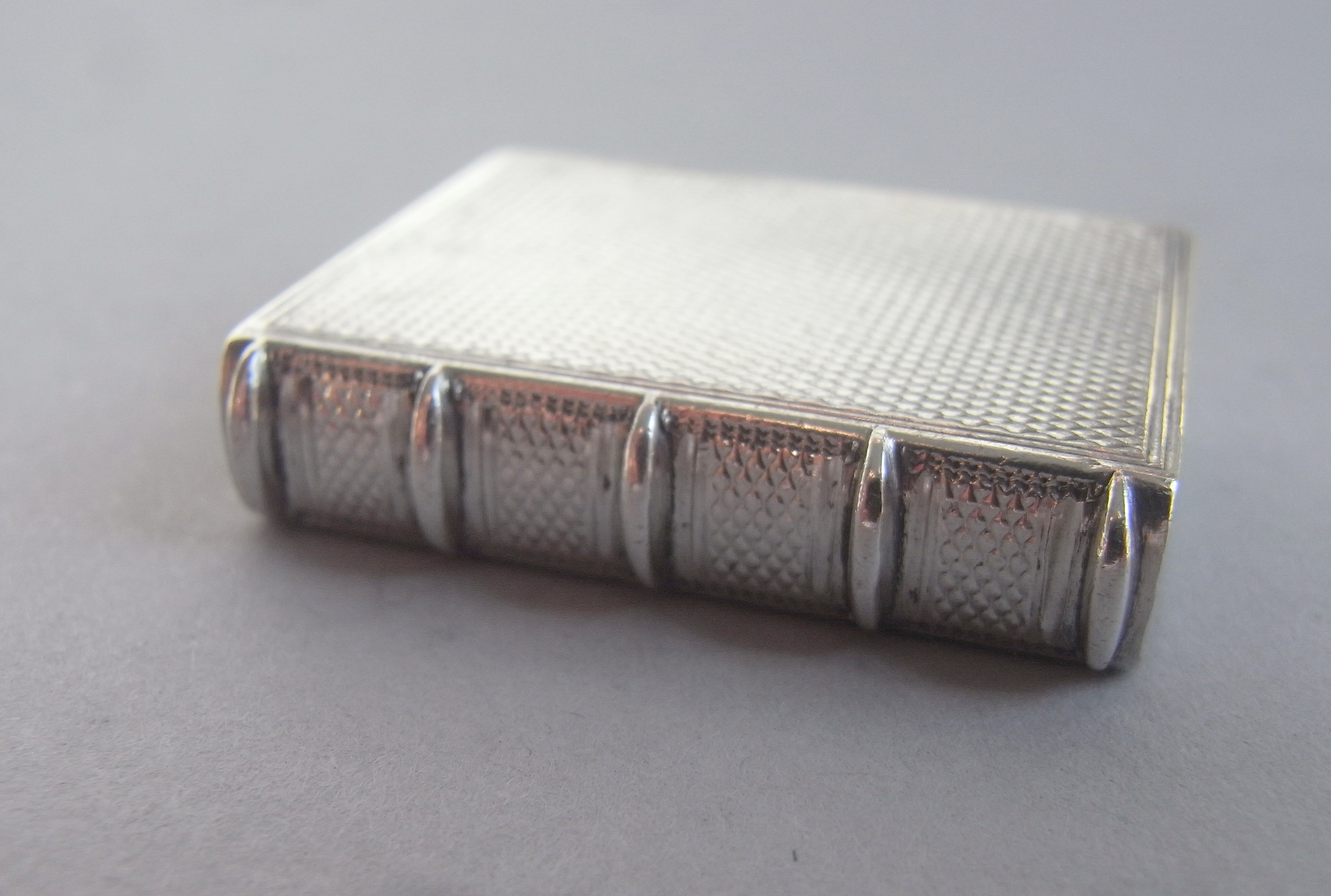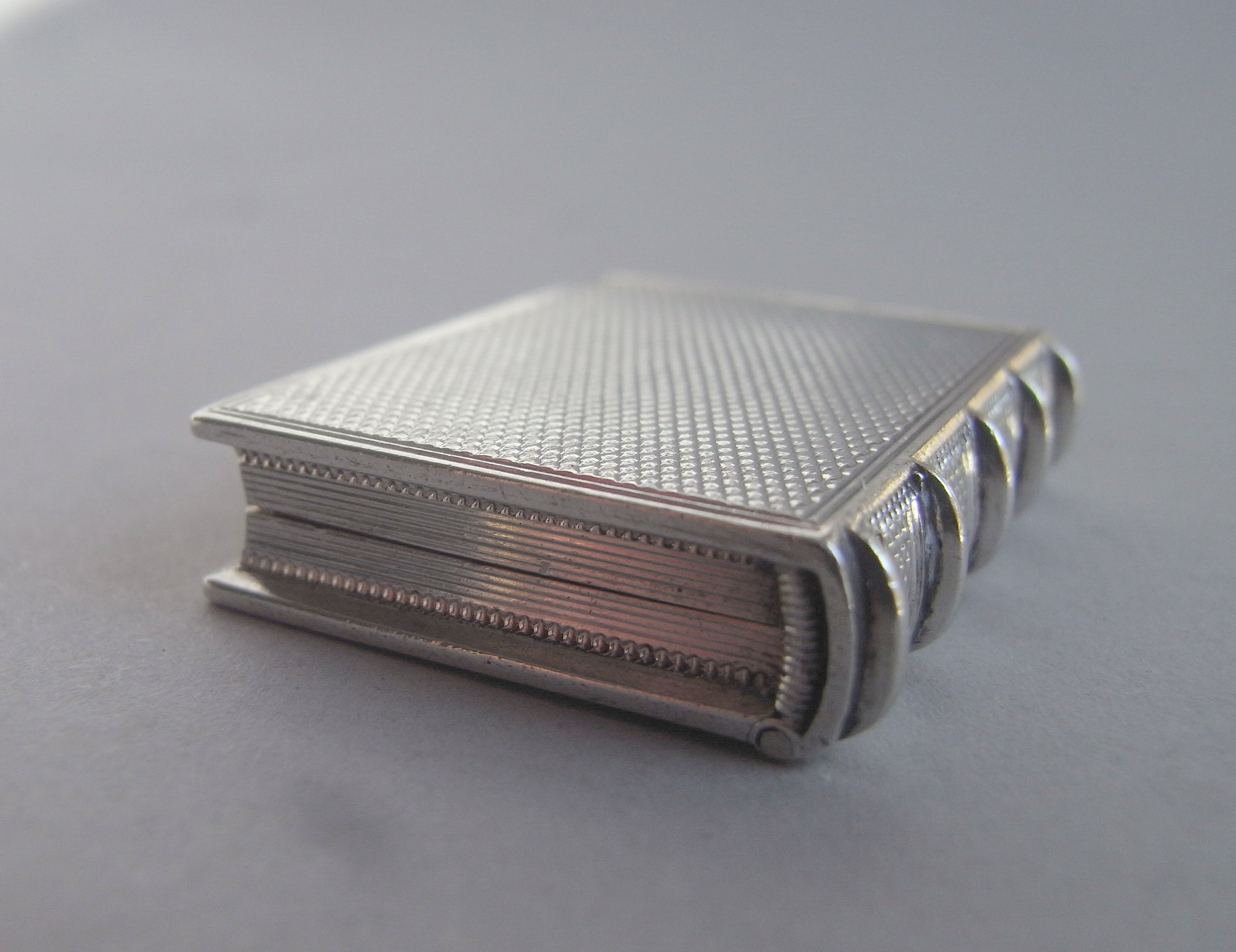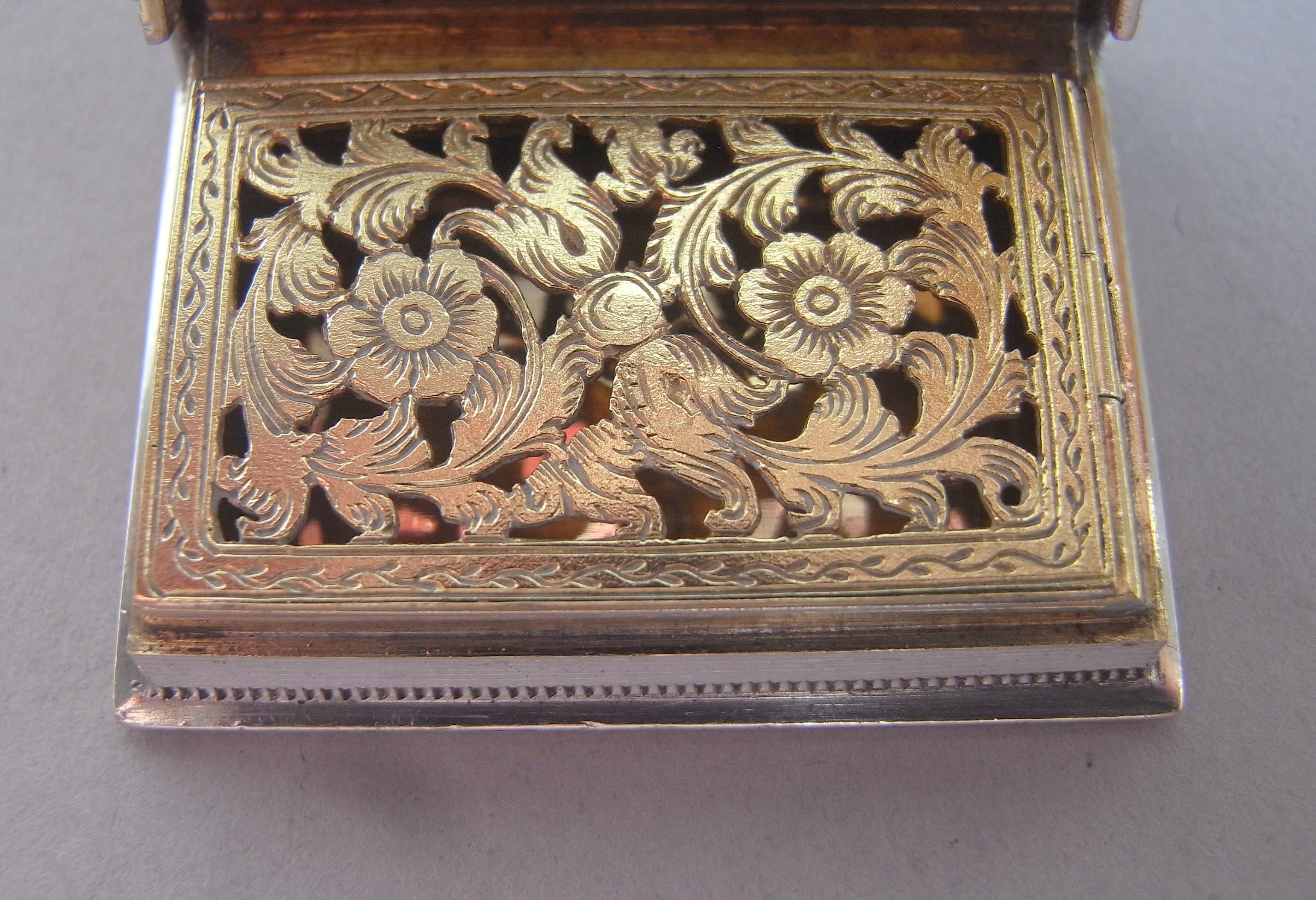 The Vinaigrette is finely and realistically modelled as a book with engine turned cover and base, within a reeded frame. The side is ribbed and engraved to simulate the spine of the book and the other three sides engraved with linear designs to simulate the pages. The box opens up to reveal a finely gilded interior and a beautiful grille pierced and engraved with pluming foliate scrolls and raying flowerheads. The pierced section is all surrounded by a herring bone engraved frame. The box is in quite excellent crisp condition and is very well marked on the underside of the cover and in the base. The underside of the grille is also marked with the sterling mark and date letter.