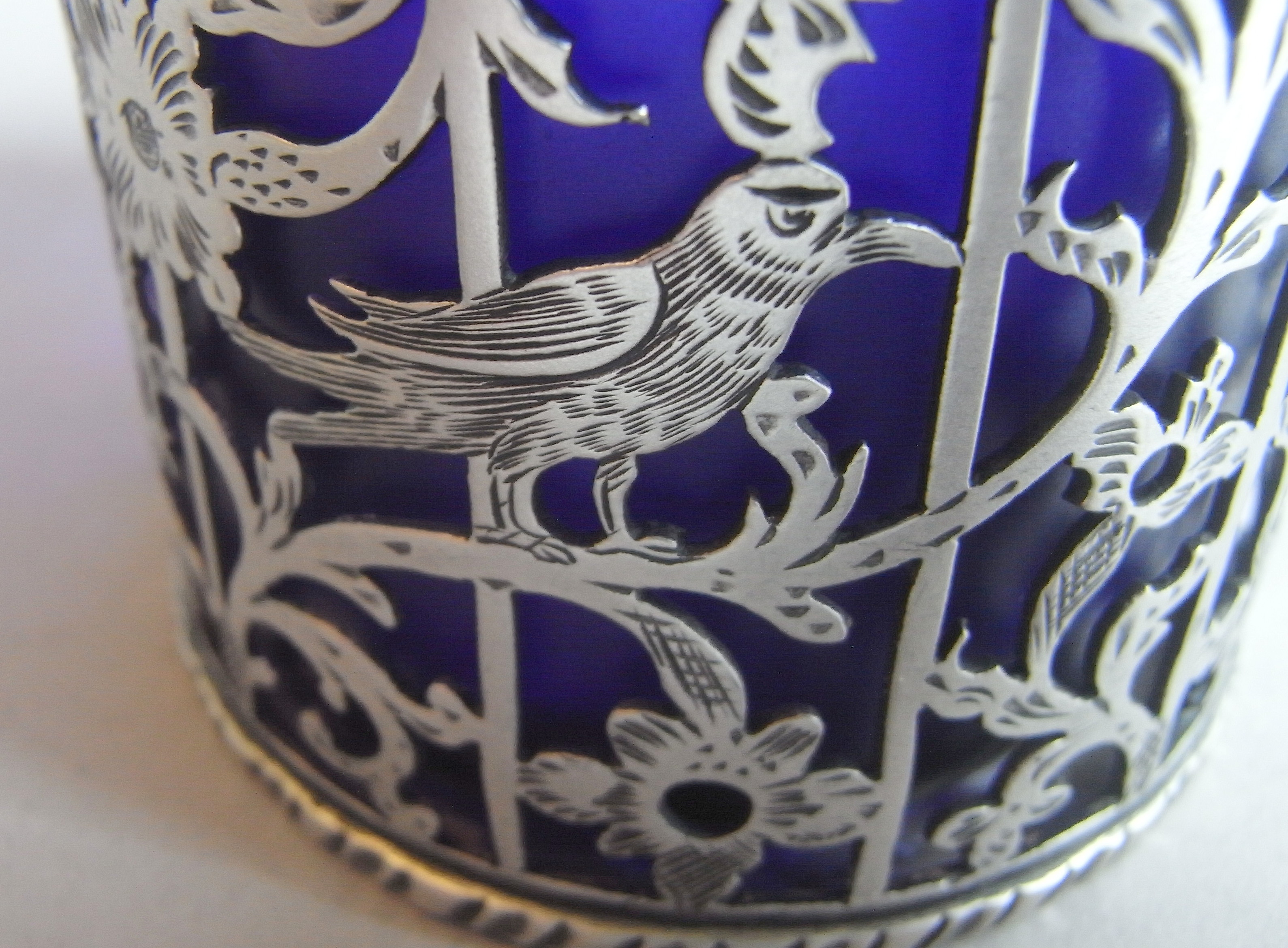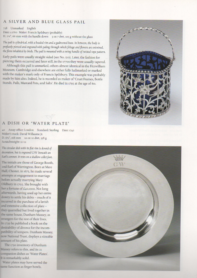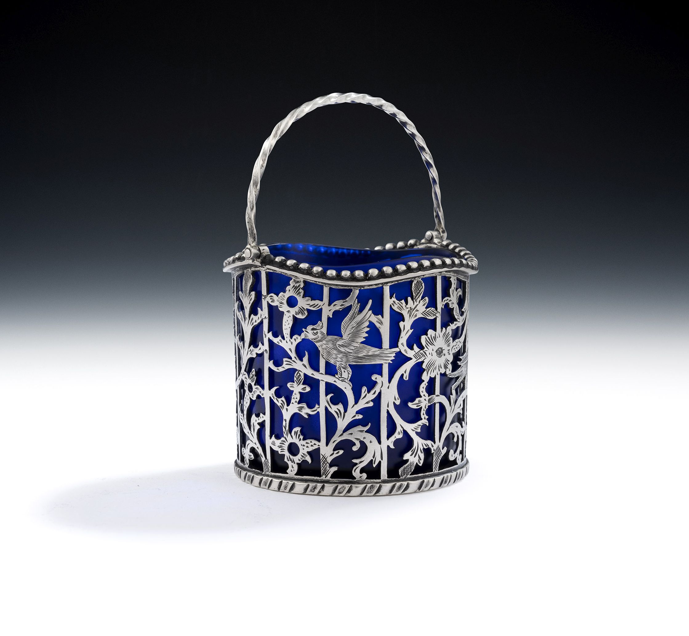 The Pail stands on a corded foot. The main body displays an unusual wavy beaded rim and the sides are divided into vertical panels pierced and engraved with trailing foliate scrolls and pretty flower heads. In addition, the sides display exotic birds at rest and in flight, a design which Francis Spilsbury was famous for. The piercing has been executed to the highest standard and the front displays a vacant, shaped, cartouche. The Pail also displays a twisted arched handle and a blue glass liner. This piece is in quite excellent condition and, although unmarked, was almost certainly made by Francis Spilsbury. A near identical example is shown in our archive which is marked with his maker's mark only. This particular pail was formerly within the World famous "Albert Collection" of Silver and is illustrated on page 77 of the collection catalogue, which is attached. Francis Spilsbury is recognised as one of the finest pierced workers of the second half of the 18th century