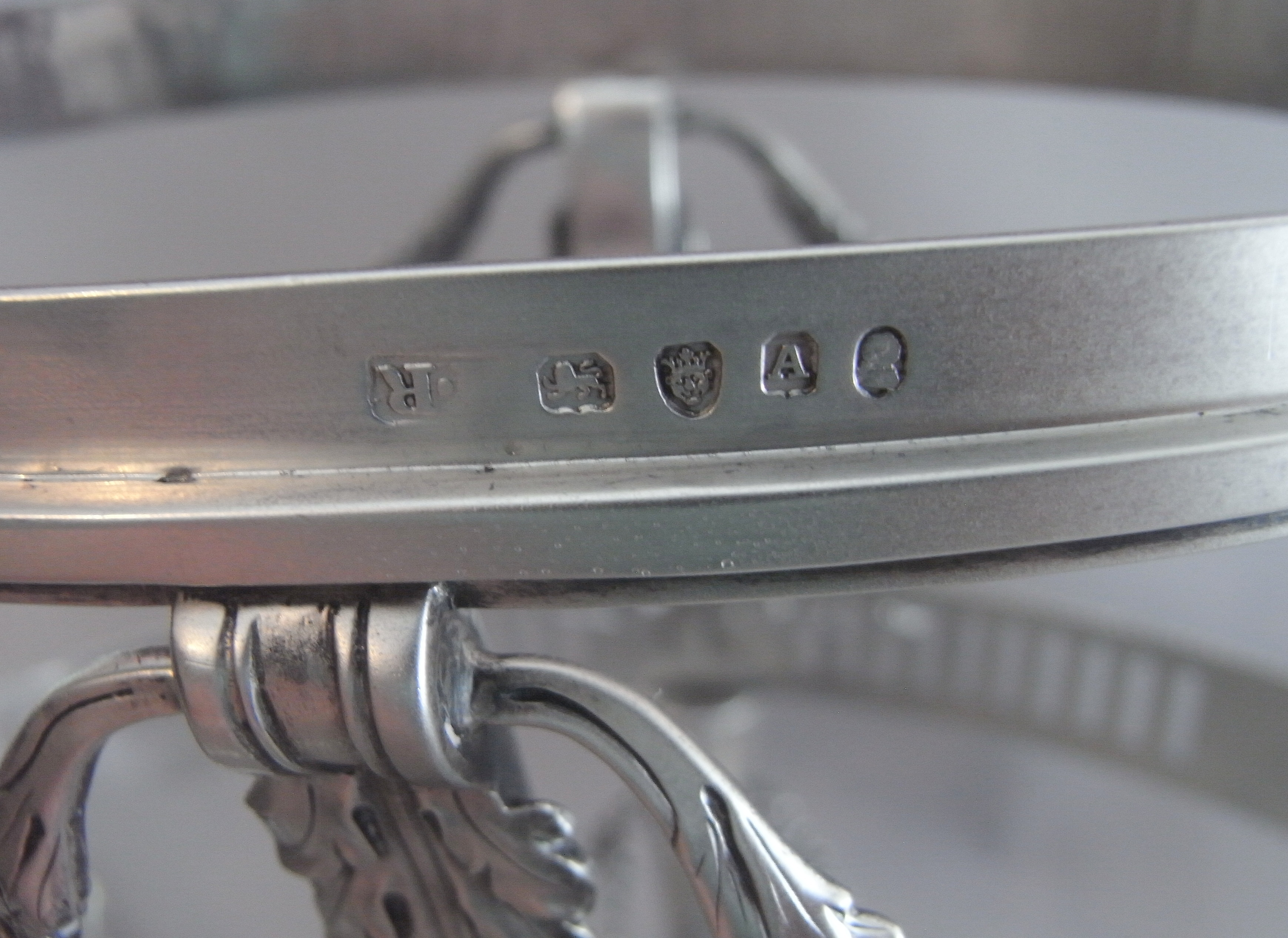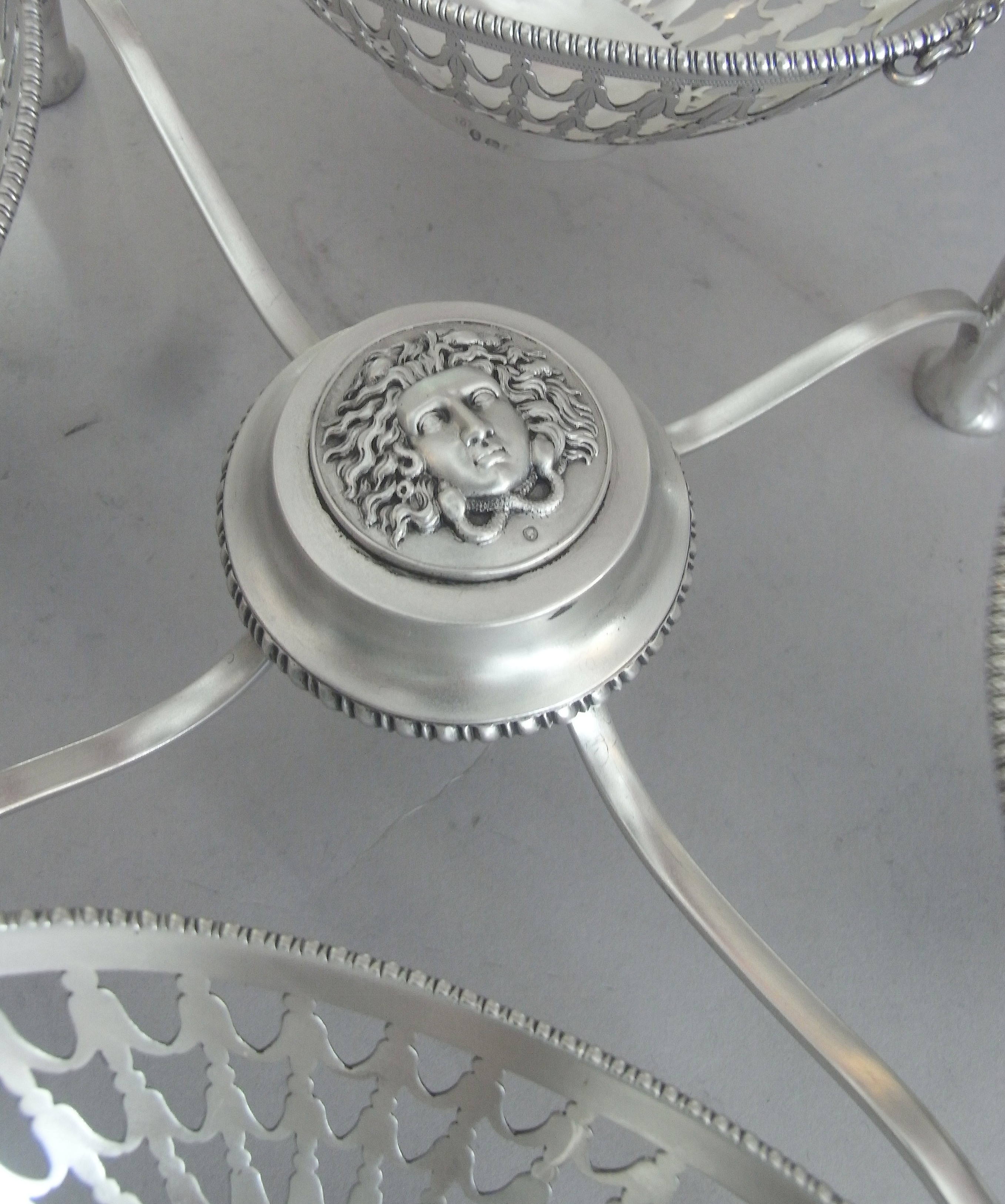 This exceptional piece has an oval frame and stands on four pillar supports, with paw feet, decorated with detailed caryatid figures, dressed in flowing drapery, with a harebell band below. The legs rise to a horizontal frieze pierced with vertical pails interspersed with oval floral medallions. The incuse neck rises to an openwork section decorated with floral garlands and trifurcated leaf capped motifs. The top of this magnificent piece displays a beautiful large basket pierced and engraved with bands of "Harebells" which stand on four cast acanthus leaf supports. The upper basket has two reeded loop handles, decorated with leaf capped mouldings. The central section of the epergne displays four leaf capped scroll arms, which fit into the frame, rising to a scalloped platform on which a further oval basket, pierced and engraved with harebells, can be placed. This piece is most unusual, as it allows for a further four baskets to be suspended by silver chains at the bottom, should there be a larger party. The attention to detail with this piece is exceptional as the base of the centre of the frame displays a circular boss decorated with portrait bust of Medusa. The Epergne is in quite excellent condition and is marked in no less than fourteen different places.