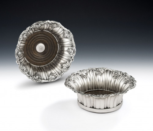 The Arms are those of the Williams family of the Isle of Anglesey and of Wynnstay and Bodelwyddan. On the inescutcheon are the arms of Heely, Bolds, Ellis, Griffiths and Owen. These are all borne identically by descendants of a Welsh princely house. From the initials, we can be fairly certain that Mrs Williams was called Elizabeth, hence the script initials EW, and that this piece was a legacy to her from a Miss Vickers.