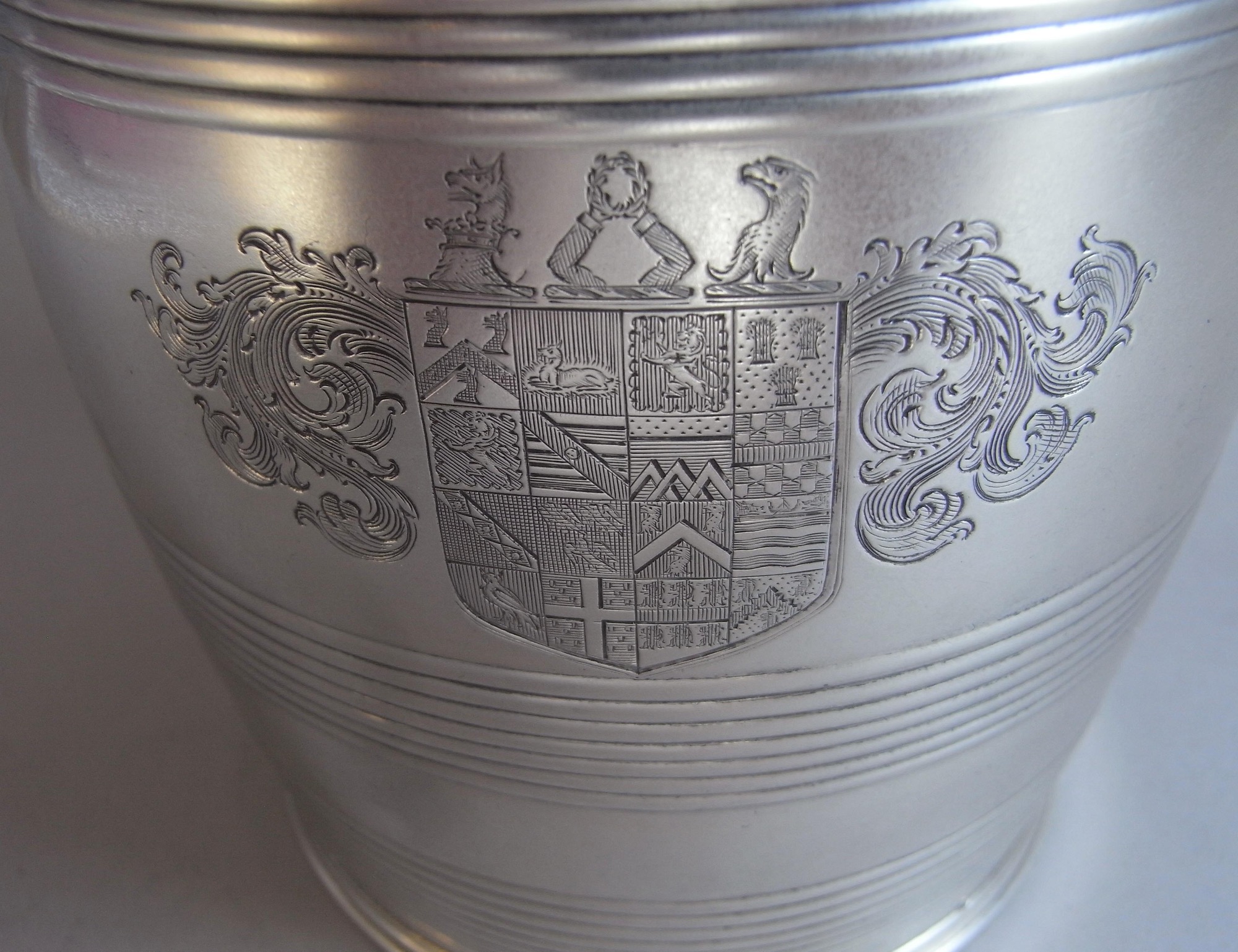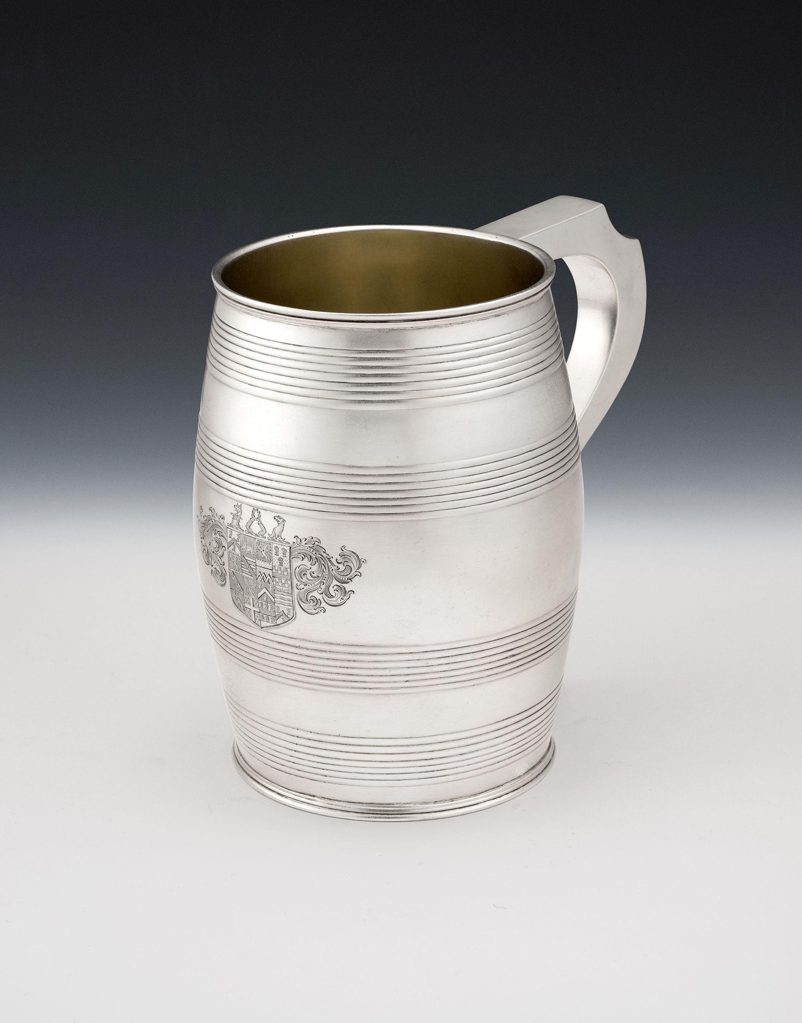 The Tankard is realistically modelled as a barrel, with horizontal reeding, to simulate the metal bands on the barrel. This example has a plain scroll handle and the interior displays fine original gilding. This piece is in quite excellent condition and is fully marked on the rim. The front of the main body is engraved with a very detailed contemporary Armorial, with three Crests above, all surrounded by a cartouche of pluming scrolls. The Arms and Crests purport to show descents and alliances of the family back to distant times. There was a fashion for this in the earlier parts of the 19th century. Coincidentally, in German speaking lands, sixteen quarterings, as here, were seen as proof of true nobility. The Arms on the Mug are those of Pemberton, descending from John Pemberton of Hilton, Captain in the service of King Charles I. They are specifically those of Stephen Pemberton Esq., of Bainbridge Holme, County Durham, which was part of the ancient manor of Hameldon, which lies to the South-West of Wearmouth and near the Tunstall Hills. He was born in 1742, was JP for co. Durham and Fellow of Oriel College Oxford, from which university he was awarded a doctorate. In 1782, he married Mary, daughter of John Anderson Esq, of Newcastle. He died in 1831 and was succeeded by his eldest son. The mansion house of Bainbridge Holme has since been demolished.