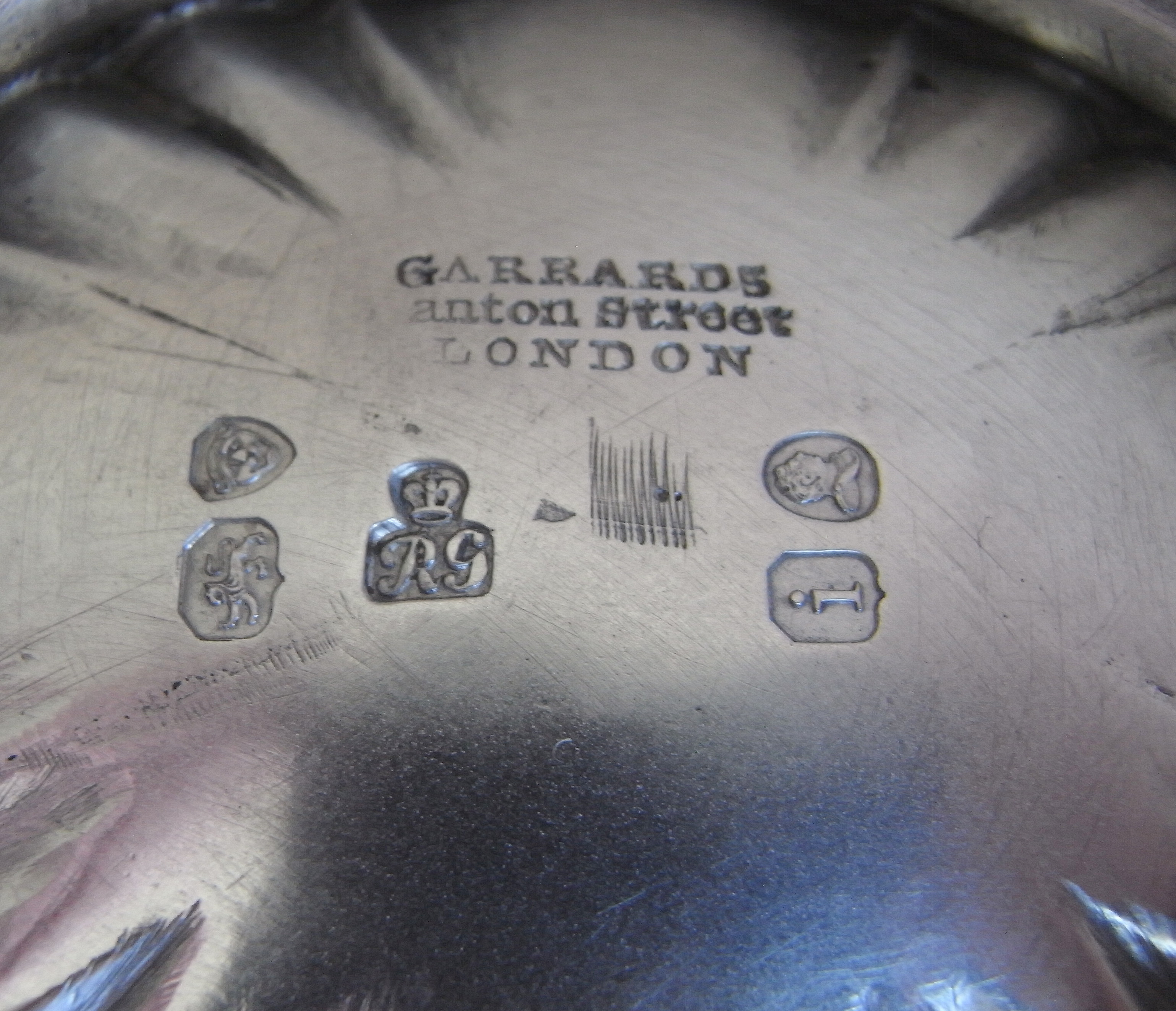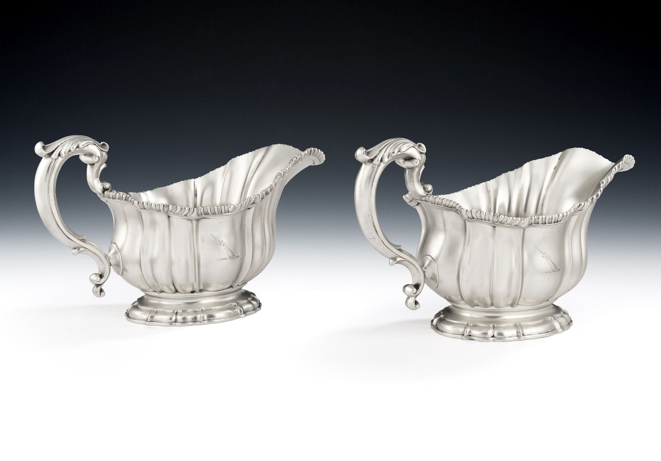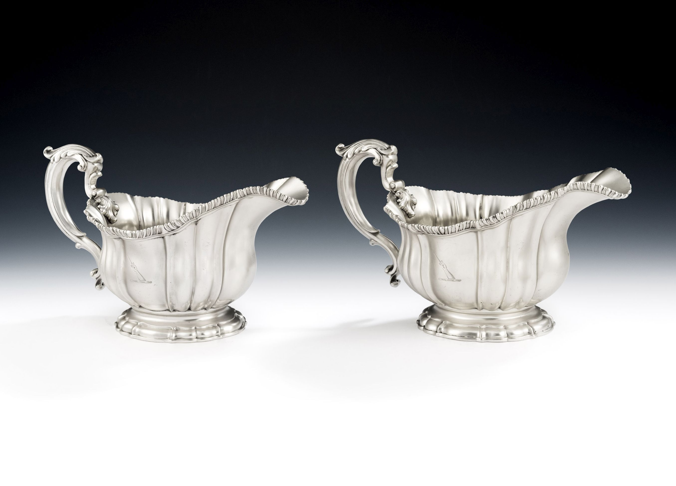 The Sauceboats stand on a stepped shaped oval moulded foot. The substantial shaped bodies rise to a gadrooned rim and are engraved with a contemporary Crest. The large scroll handles are decorated with leaf capping and are attached to the main body with pretty raying shell mouldings. The Sauceboats are in excellent condition and are of a very good gauge and weight. They are fully marked in the foot including the maker’s mark with a crown above, denoting Garrards Royal status.