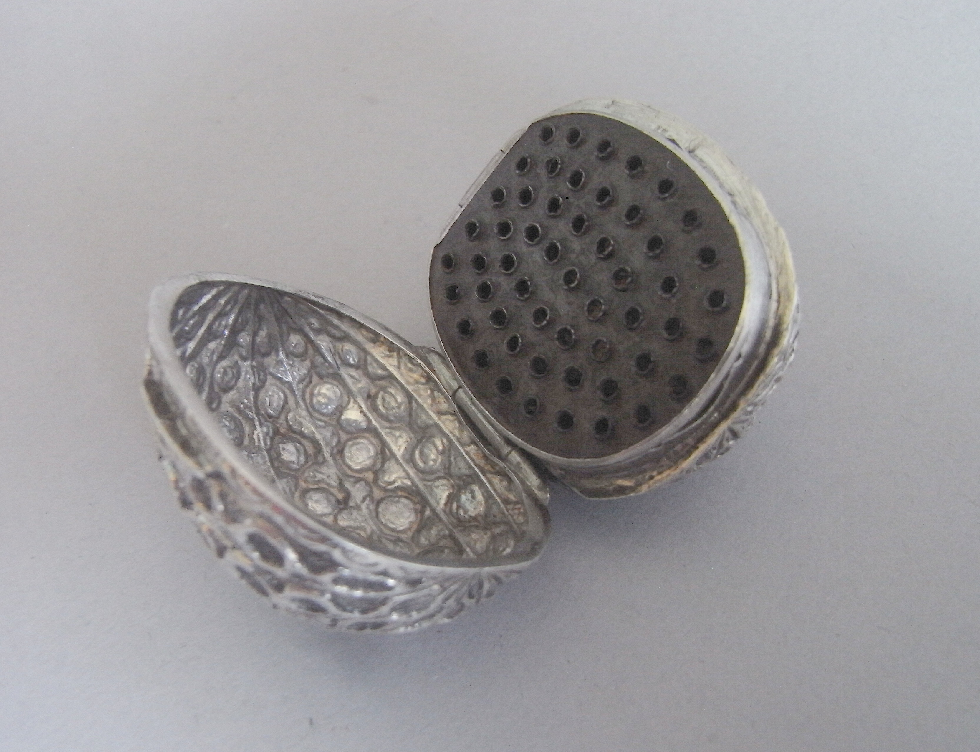 The Nutmeg grater comes from the “Naturalistic” period and is realistically modelled as an English Walnut, with textured surface on a matted ground. The grater opens up to reveal a steel grater with silver rim. This piece is in excellent condition and is very well marked on the bezel. The walnut does not appear on the market often and an identical example is shown in the catalogue of the Robert & Meredith Green Collection of Nutmeg Graters, page 41.