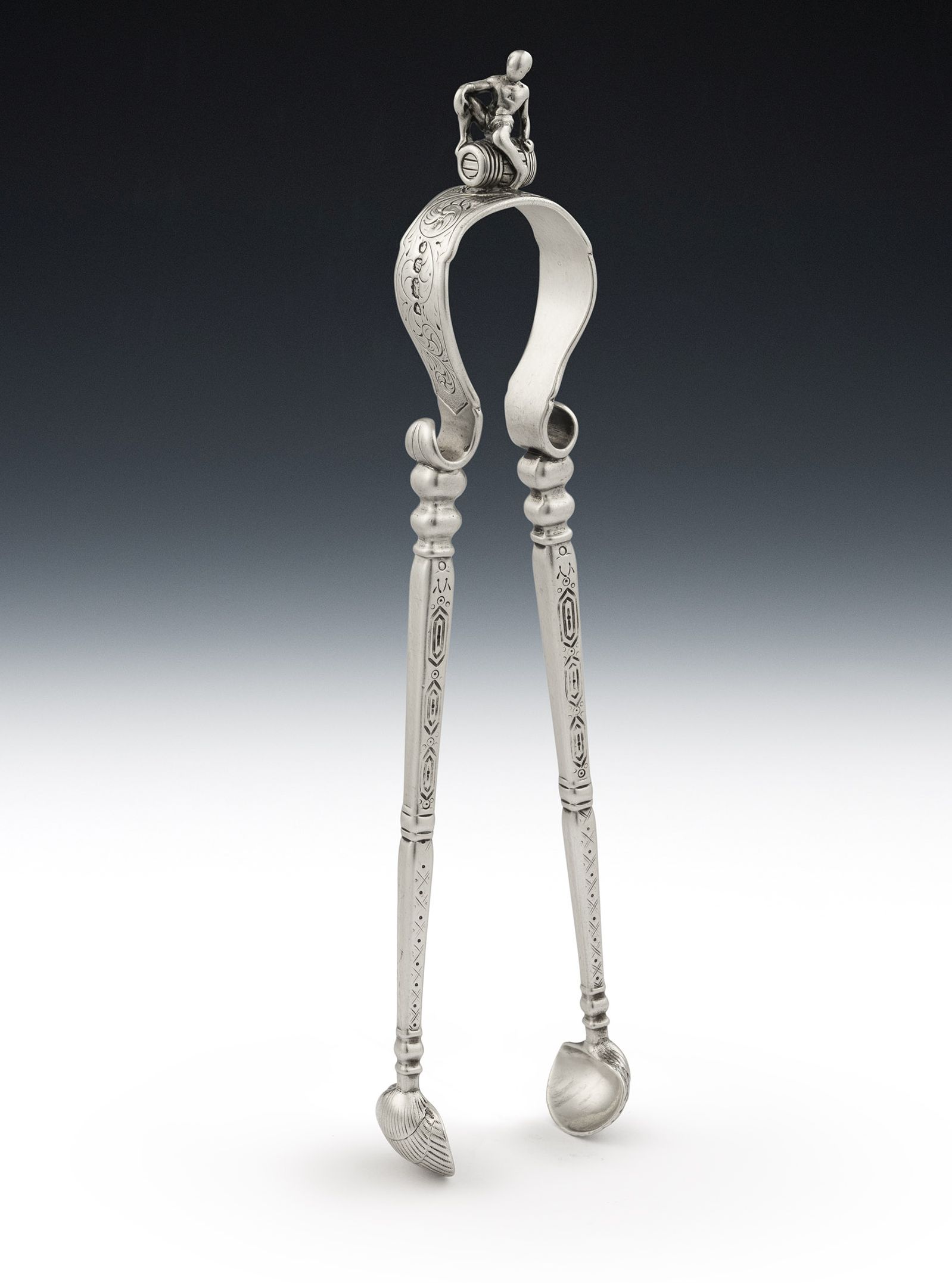 - An extremely rare pair of Sugar Tongs modelled as a pair of Fire Irons, with a boy on a barrel above. Made in London in 1853 by Francis Higgins.