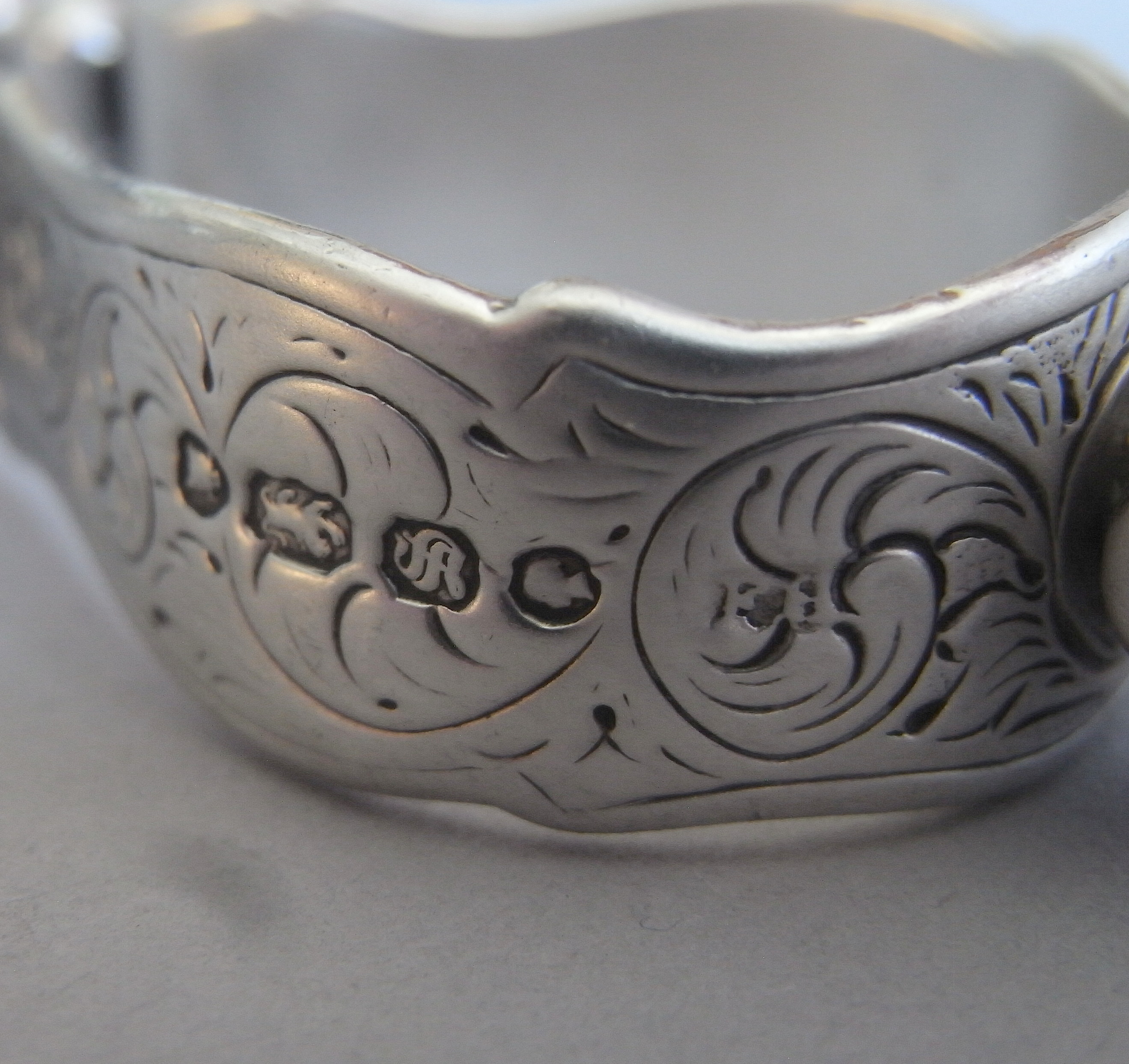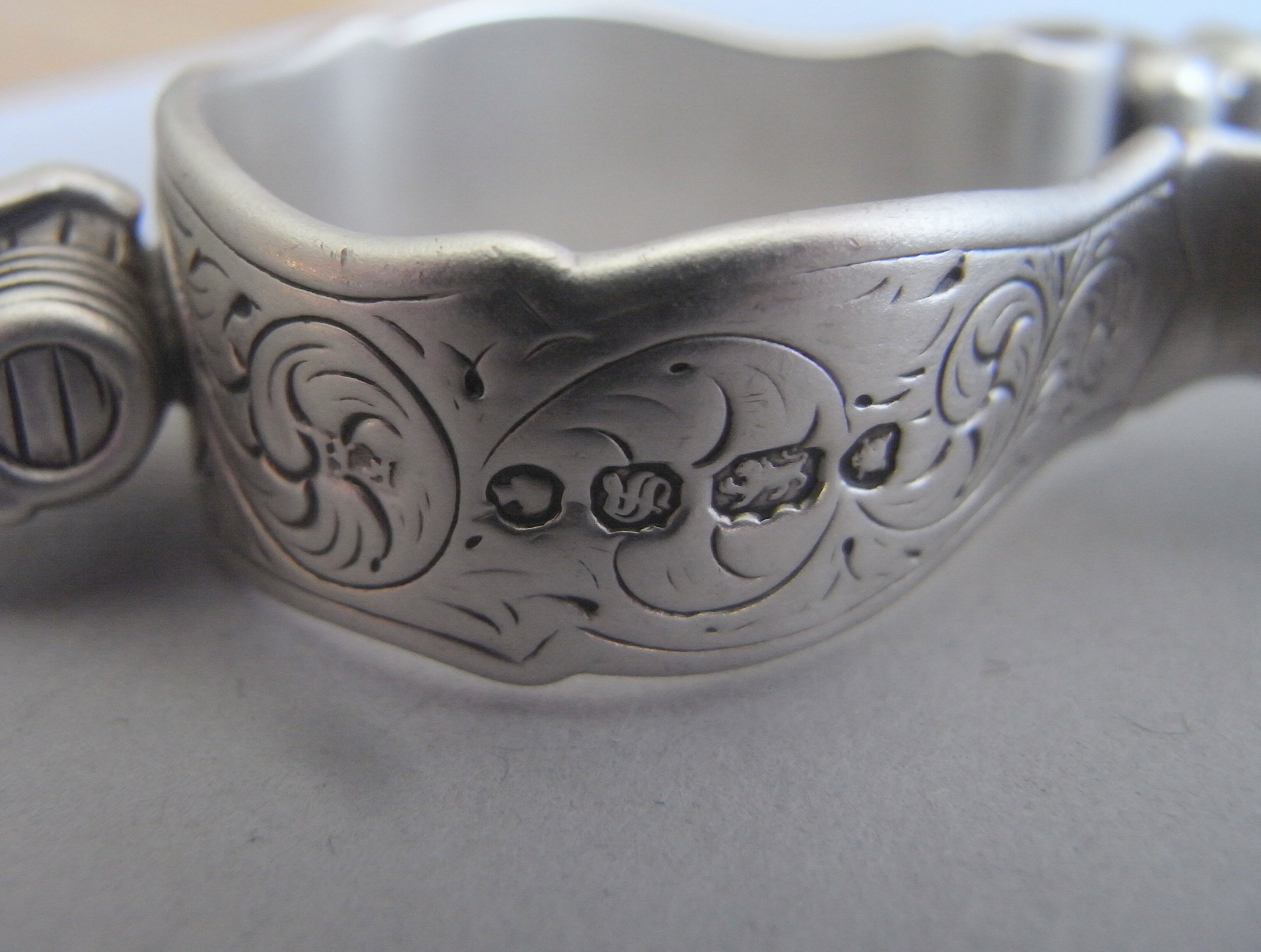 The Tongs are beautifully modelled as a pair of early fire irons engraved with early Eighteenth century designs and displaying shell grips. The top of the arch displays a rare Boy and Barrel finial. A very rare design made by the fine quality flatware maker, Francis Higgins.