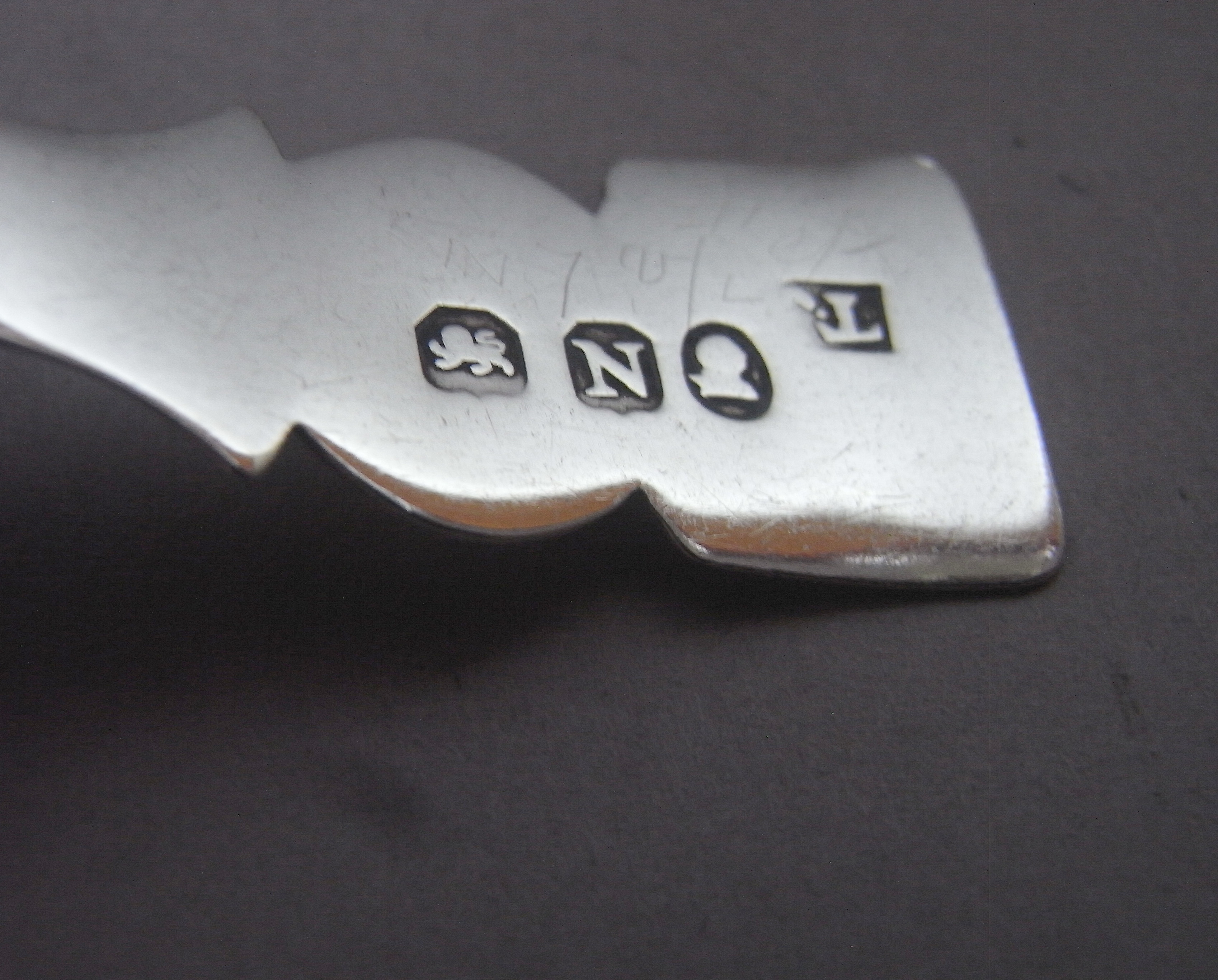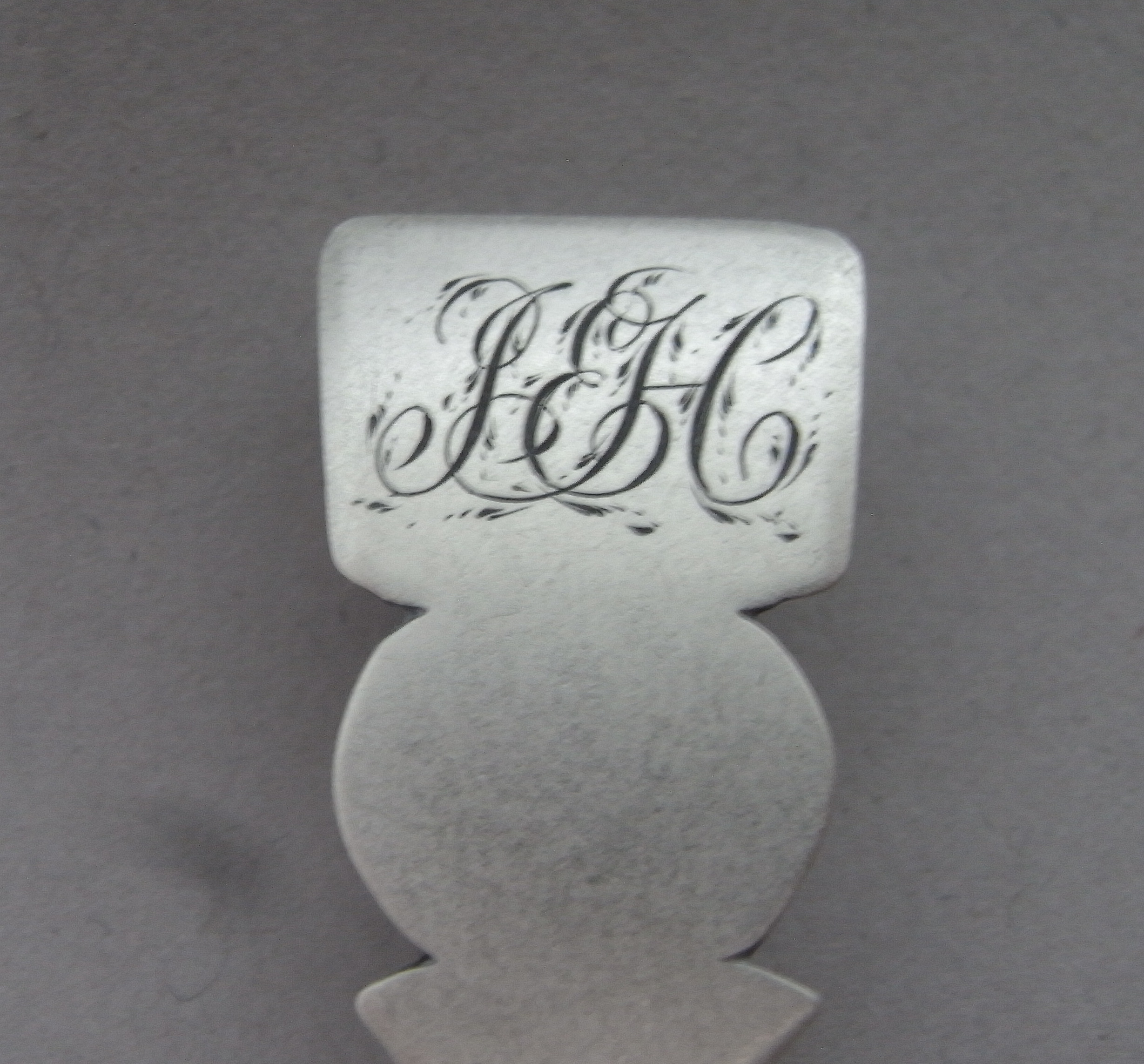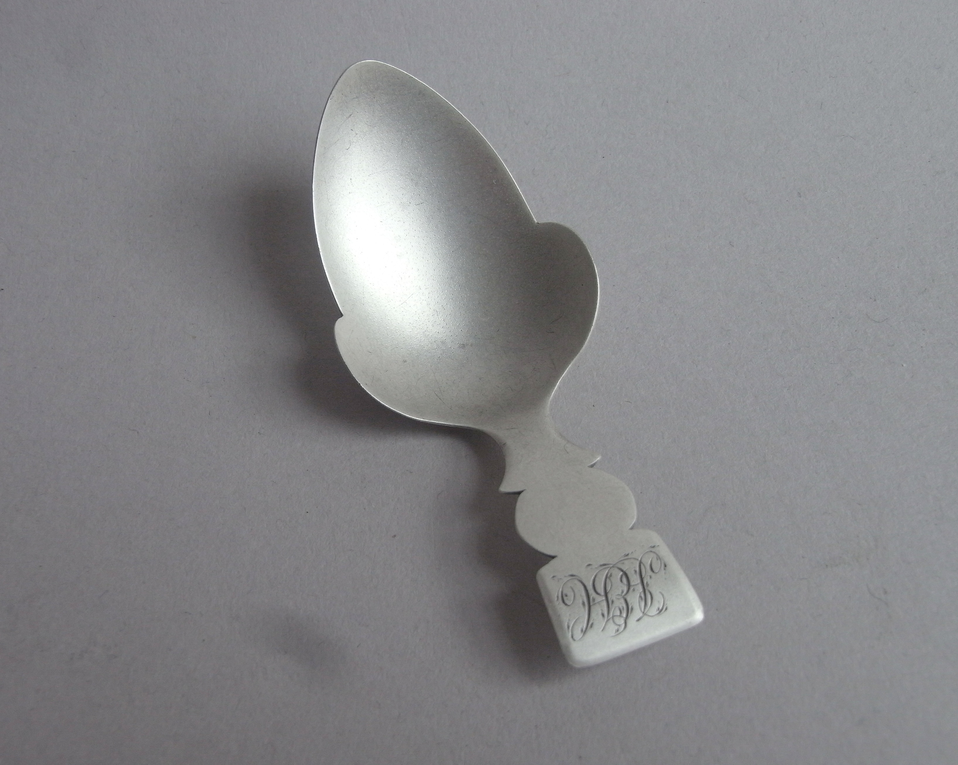 The Caddy Spoon is finely modelled to simulate the shape of an acorn, with slightly curved bowl. This piece has a shaped handle, with square end engraved with a set of contemporary script initials. The Spoon is in excellent condition and is well marked on the reverse. Thomas James was a prolific Caddy Spoon maker and this spoon very much displays the characteristics of his work.