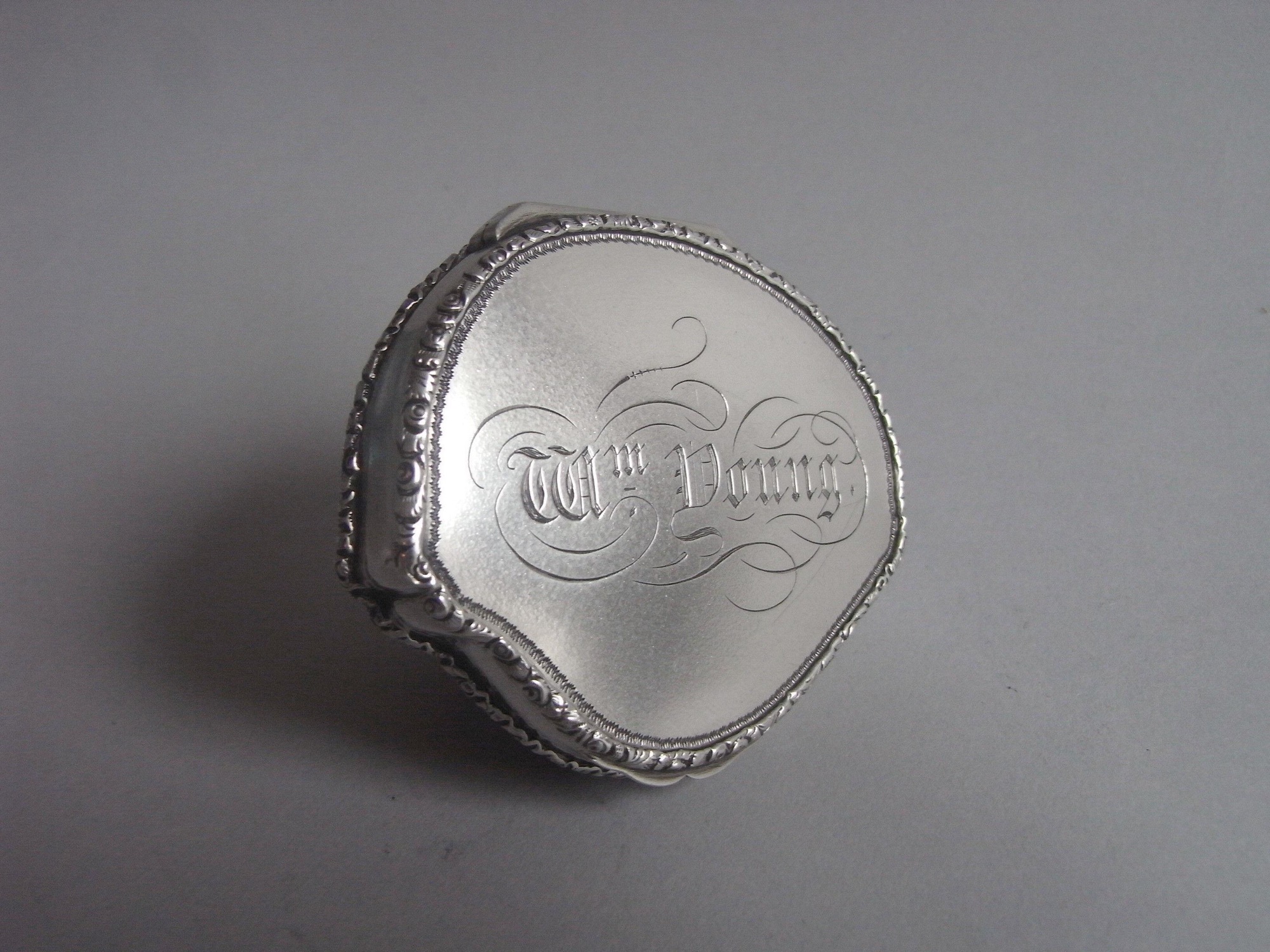 The Shell Snuff Box is one of the most beautifully shaded examples which we have offered over the years, displaying a variety of unusual colours. The shell is mounted in silver and displays a cast foliate band. The hinged cover is shaped and also displays another cast floral border and the centre is engraved with Wm Young surrounded by linear scroll work. This was almost certainly the original owner. The box is in excellent condition and is very well marked. Edward Edwards was a box maker of very fine quality.