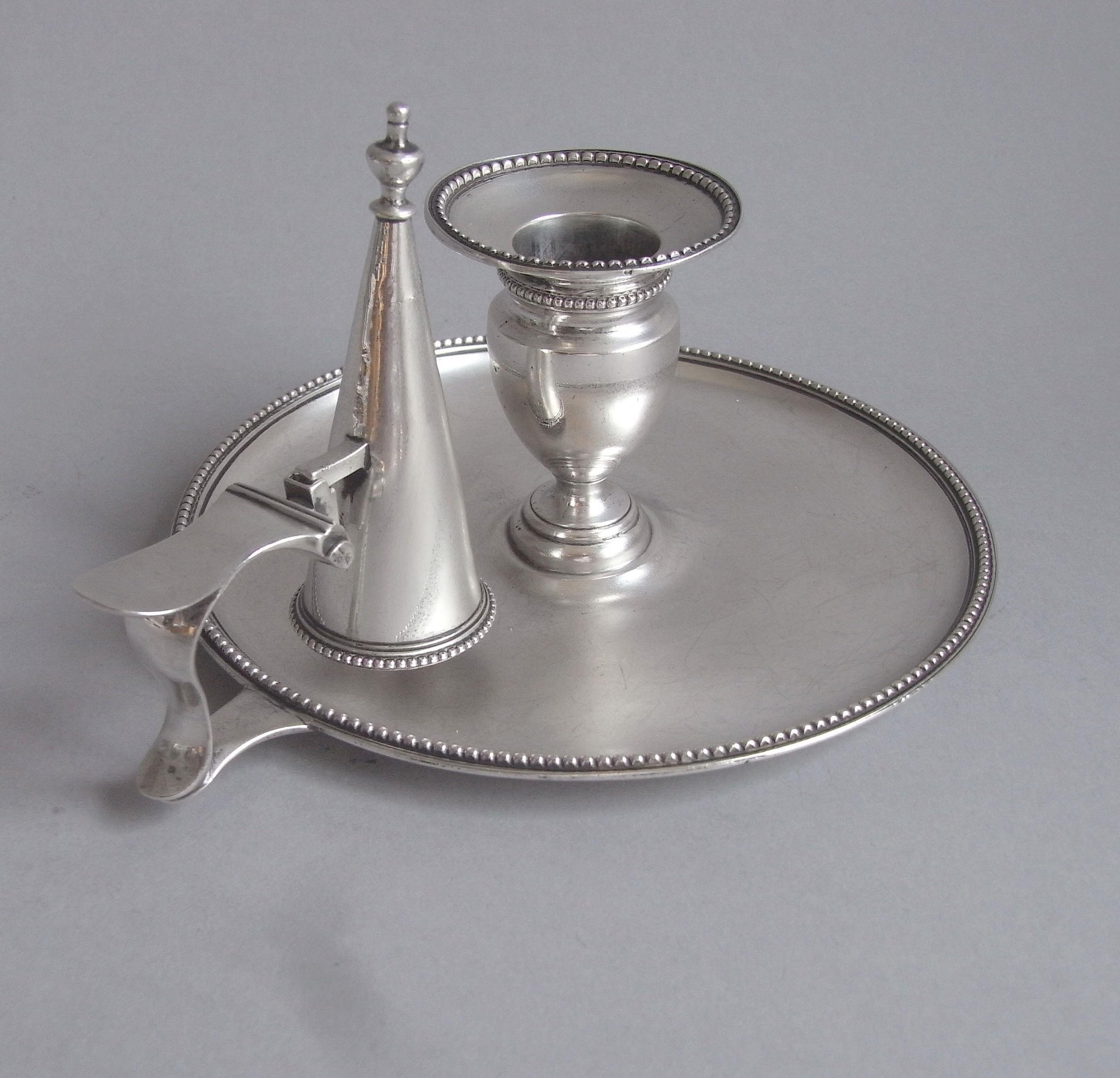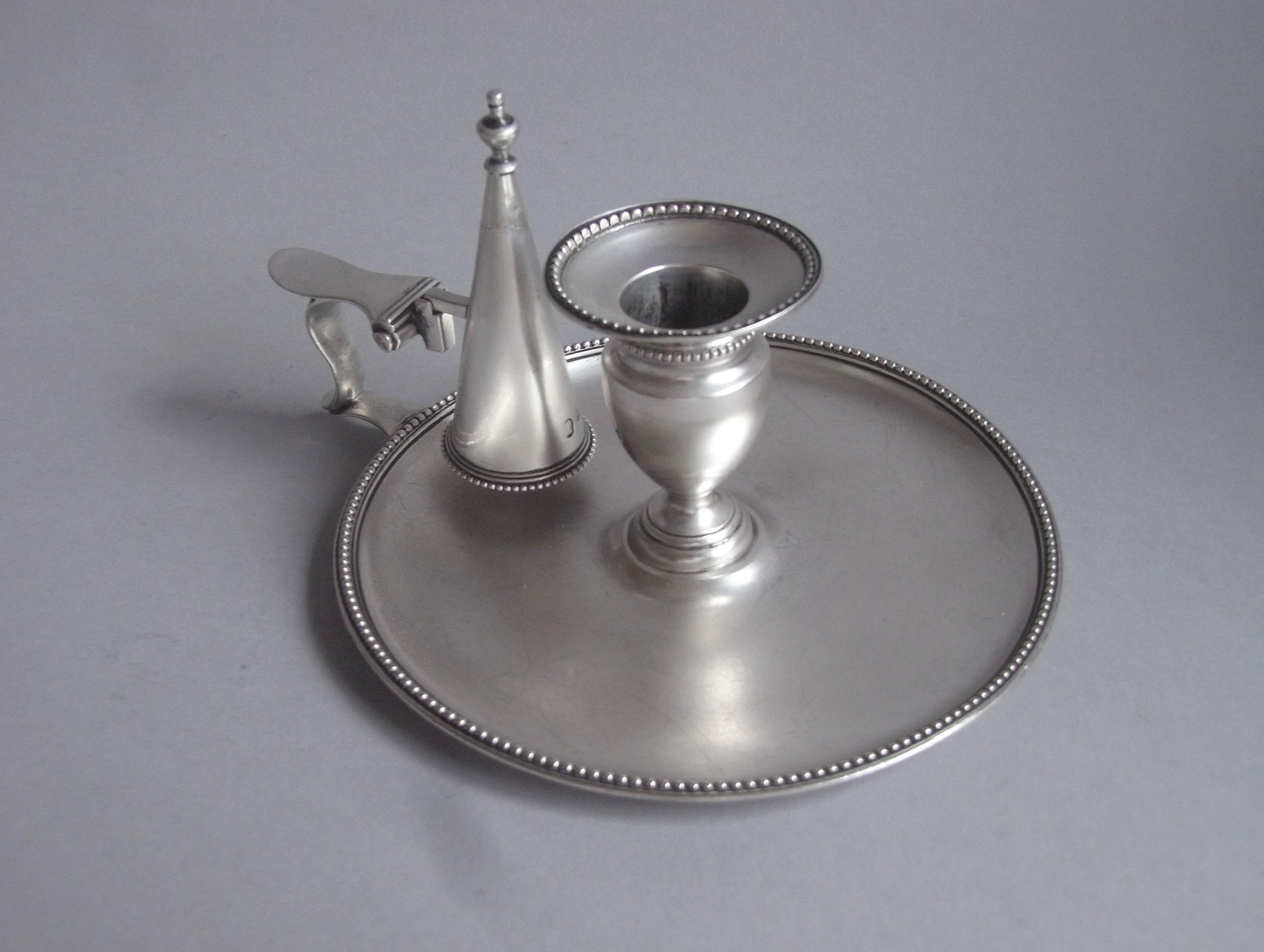 The Chamberstick is circular in form with a raised edge which is decorated with an applied beaded band. The central section rises to a tulip shaped socket and the detachable nozzle has a beaded edge. The scroll side handle is decorated with a reeded band and has a holder for the conical extinguisher. The extinguisher terminates in an urn finial and has a beaded base. The Chamberstick is in excellent condition and is fully marked on the base. The extinguisher and nozzle are clearly marked with the makers mark, sterling mark and duty mark, as they should be at this date. Chambersticks and convential candlesticks are extremely rare from the workshops of Hester Bateman. This piece is also desirable as it is a particular design which was peculiar to the workshops of Hester Bateman, with no central space for a pair of snuffer scissors.