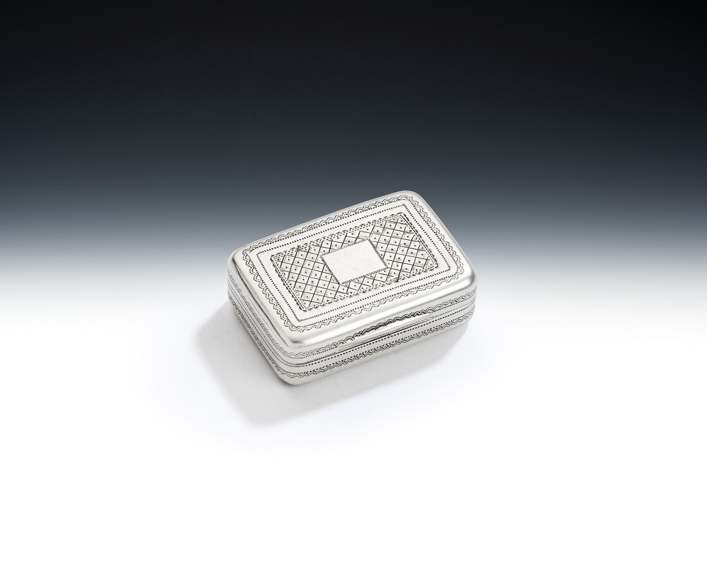 The Vinaigrette is broad rectangular in form and the cover is engraved with prick dot bands around a trellis work panel and vacant cartouche. The base is engraved with an outer band of foliate motifs on a scratch engraved ground surrounding prick dot borders and a central flower head. The sides are decorated with prick dot designs and the interior displays a very unusual grille pierced and engraved with an unusual basket of flowers, surrounded by foliate sprays and a herring bone arch above. The Vinaigrette is very well marked and is in excellent condition. Joseph Ash was one of the finest box makers, in London, during this period and this box illustrated this.