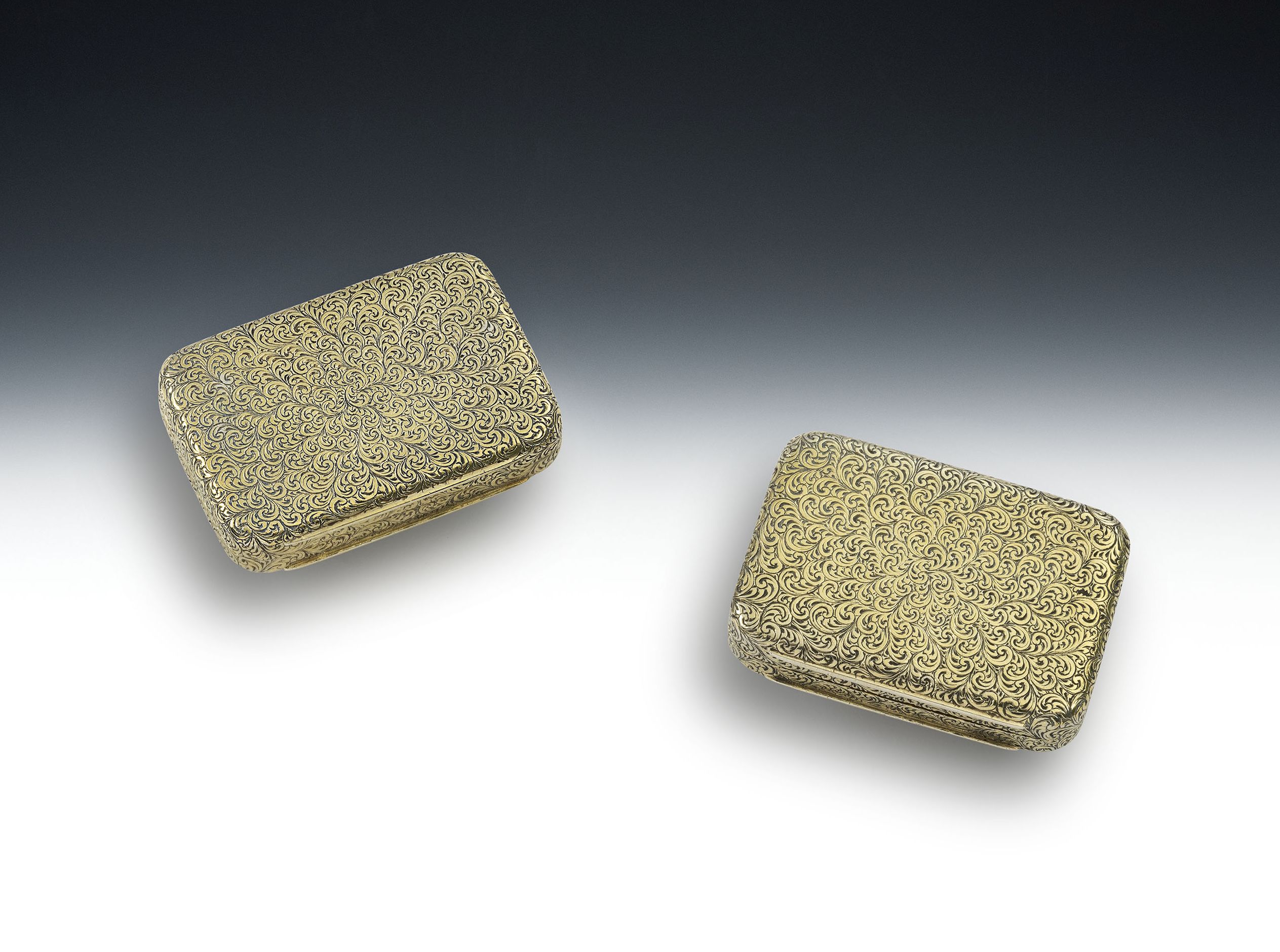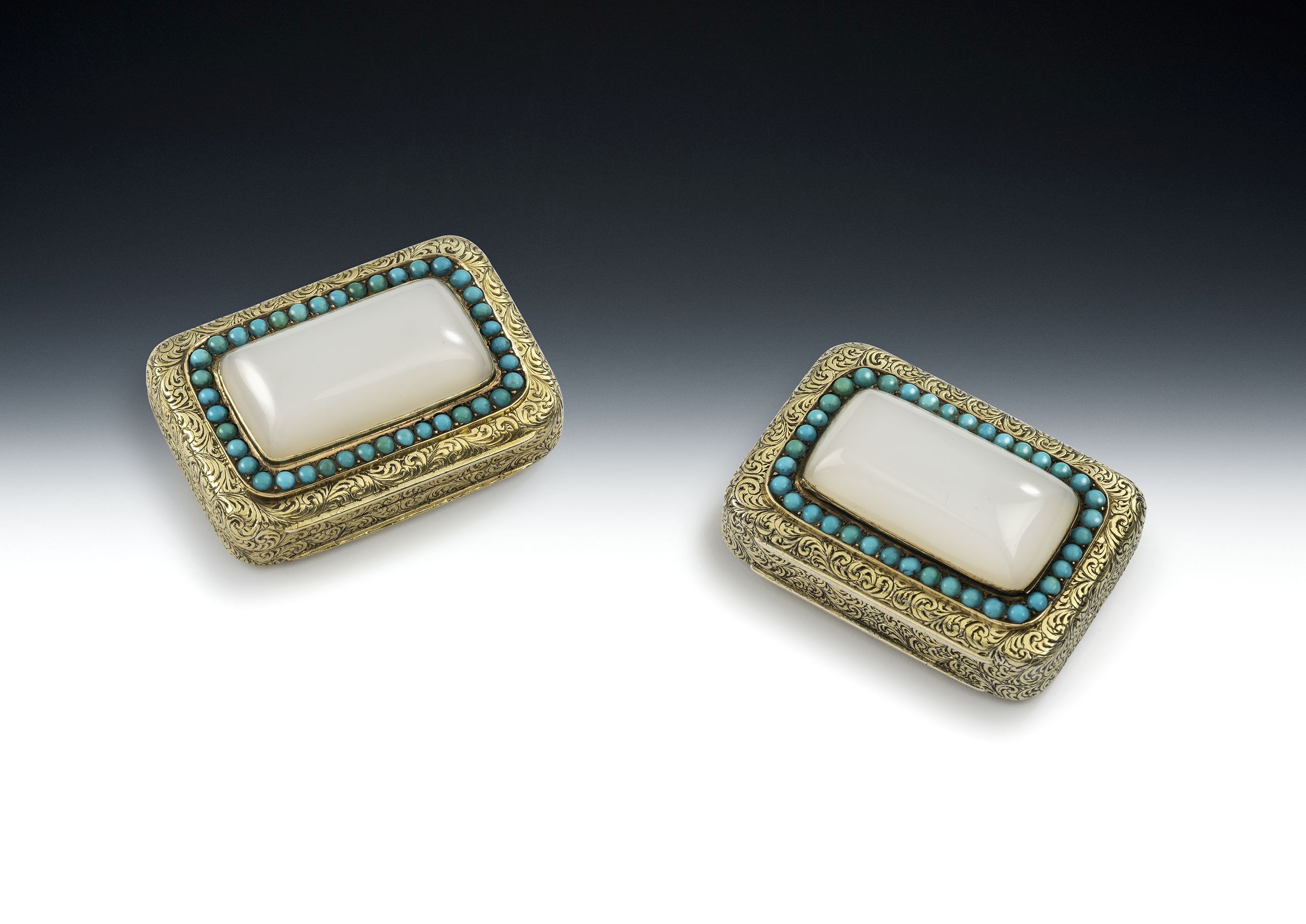 Both boxes are silver gilt and broad rectangular in form. The exterior of each box is beautifully, and profusely, engraved all over with feathery scrolls. The covers are inset with a large central white moon stone, surrounded by a band of turquoise. The Vinaigrette opens up to reveal a grille, pierced and engraved with scrolls around a central roundel. As you will appreciate, it is extremely rare to find a vinaigrette with identical snuff box. Both boxes are in excellent condition and are well marked in the cover, base and underside of the grille. In addition the covers are engraved with the retailers mark of Asprey, 166 Bond Street. Each has a Sovereign's crown above, denoting the retailers Royal appointment.