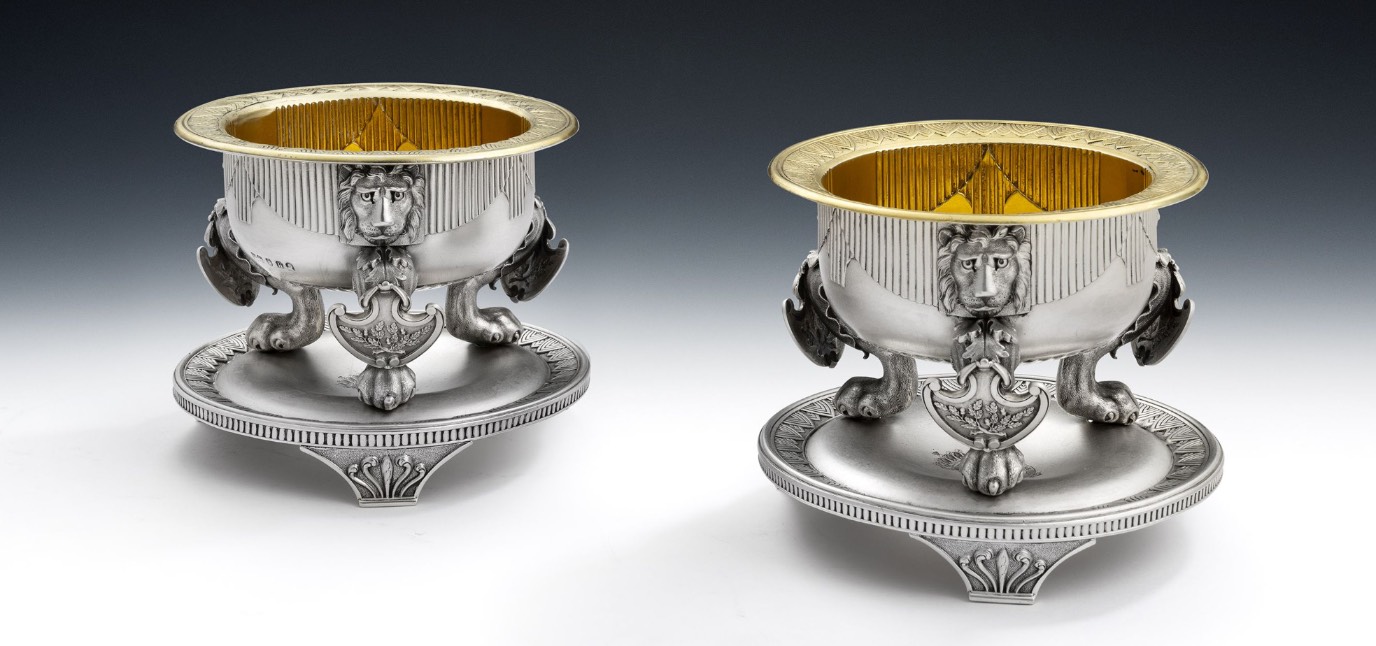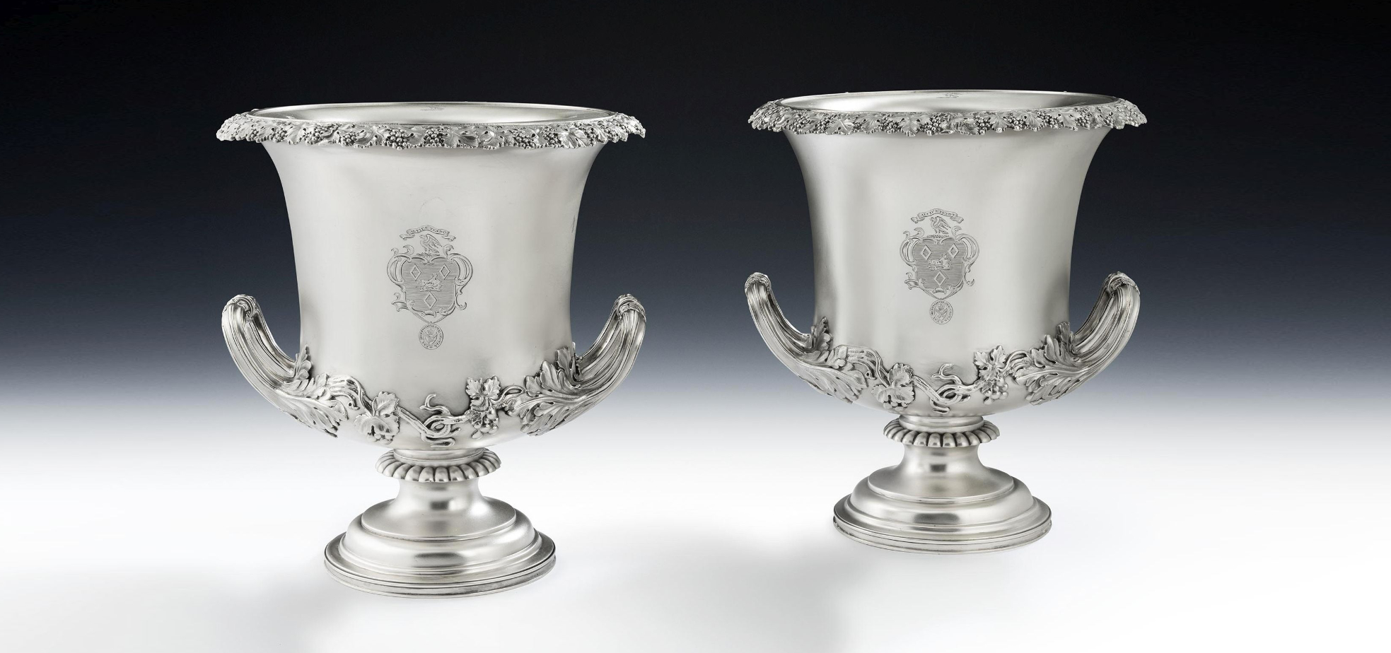 The Kinloch Wine Coolers. An unusual pair of George IV Trailing Vine Wine Coolers made in London in 1827 by William Eley II.