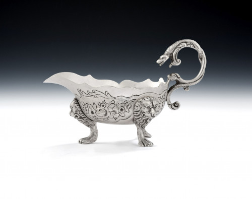 The Mug stands on a cast and applied tucked in foot and the slightly tapering sides rise to an everted rim. This piece has a plain scroll handle and the front of the main body is engraved with a beautiful contemporary cipher. The Mug is very well marked in the foot, has a very good colour and is of a good gauge and weight. Nelmes surviving work shows him to have developed one of the largest establishments by the end of the century, with considerable output of municipal pieces such as maces, as well as toilet services and other large pieces. His work certainly shows the characteristics of the Huguenot influence.