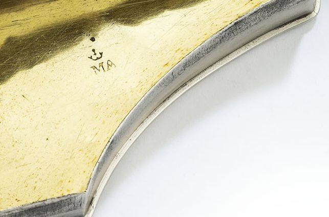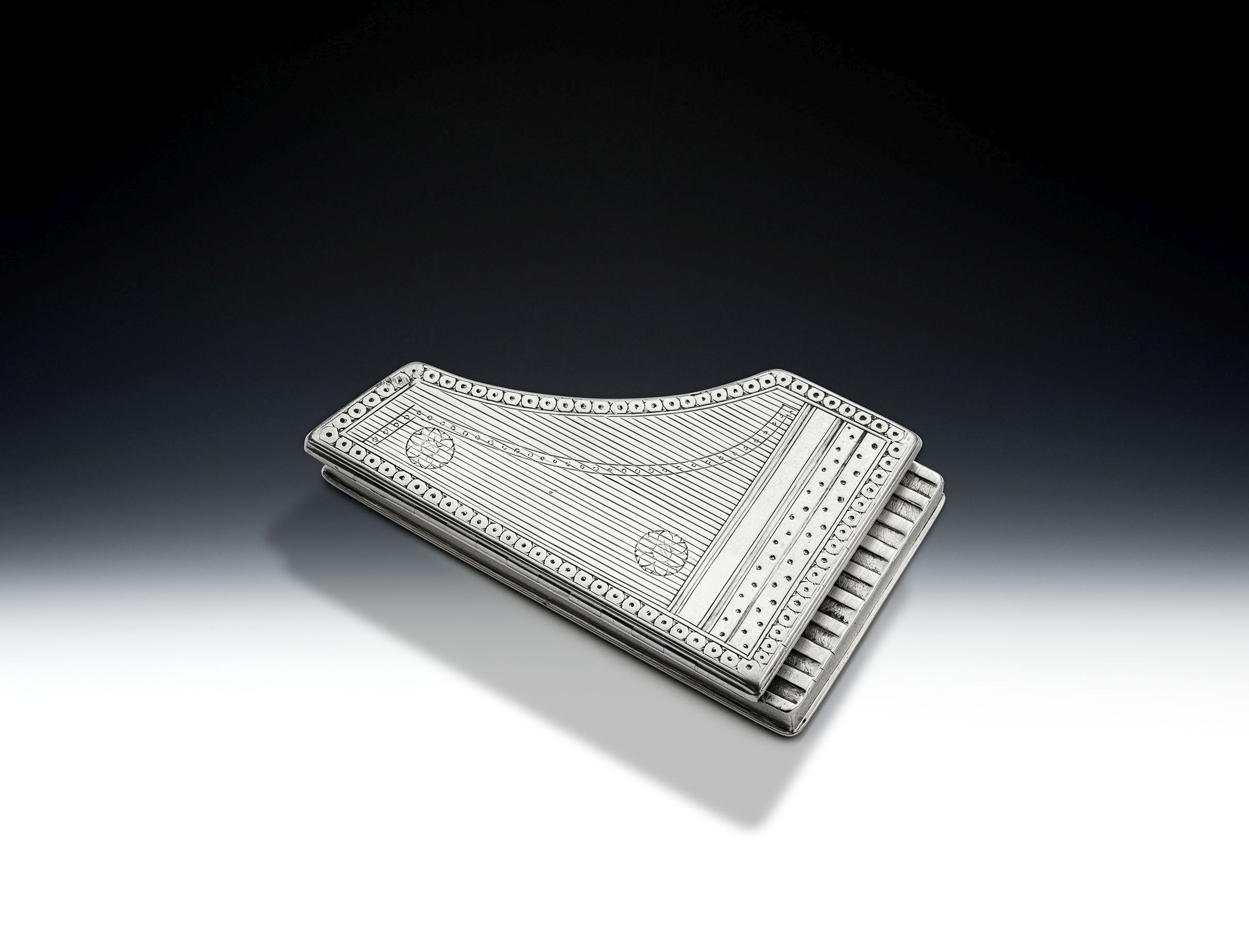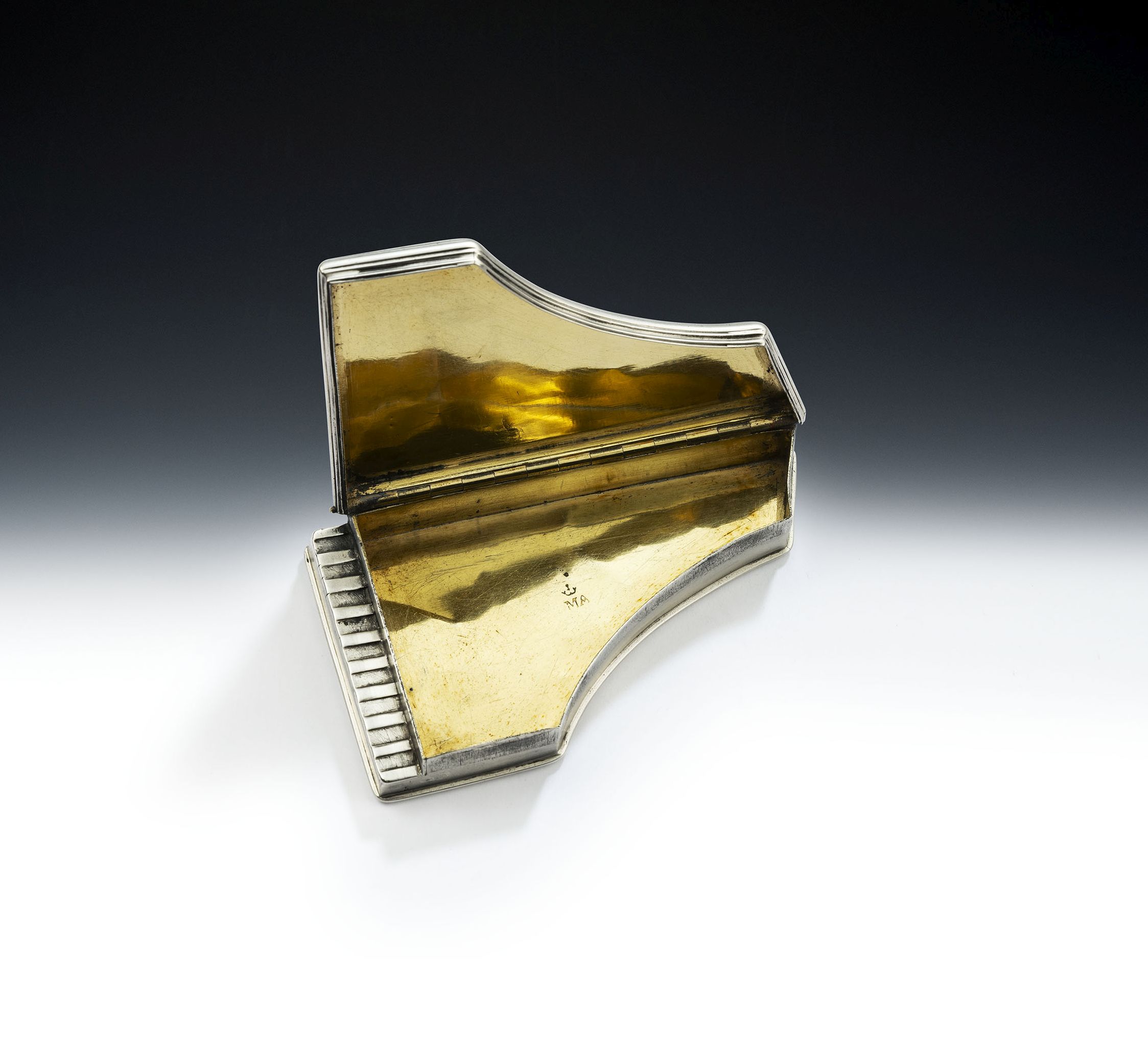 The box is beautifully modelled to simulate a harpsichord and the hinged cover displays an outer engraved beaded band and linear designs interspersed with floral rosettes. The front is finely modelled to simulate the keys and the base, and sides, are plain in design. The cover opens up to reveal a finely gilded interior and the incuse maker's mark in the base. This is a particularly rare design of Snuff Box from this early period.