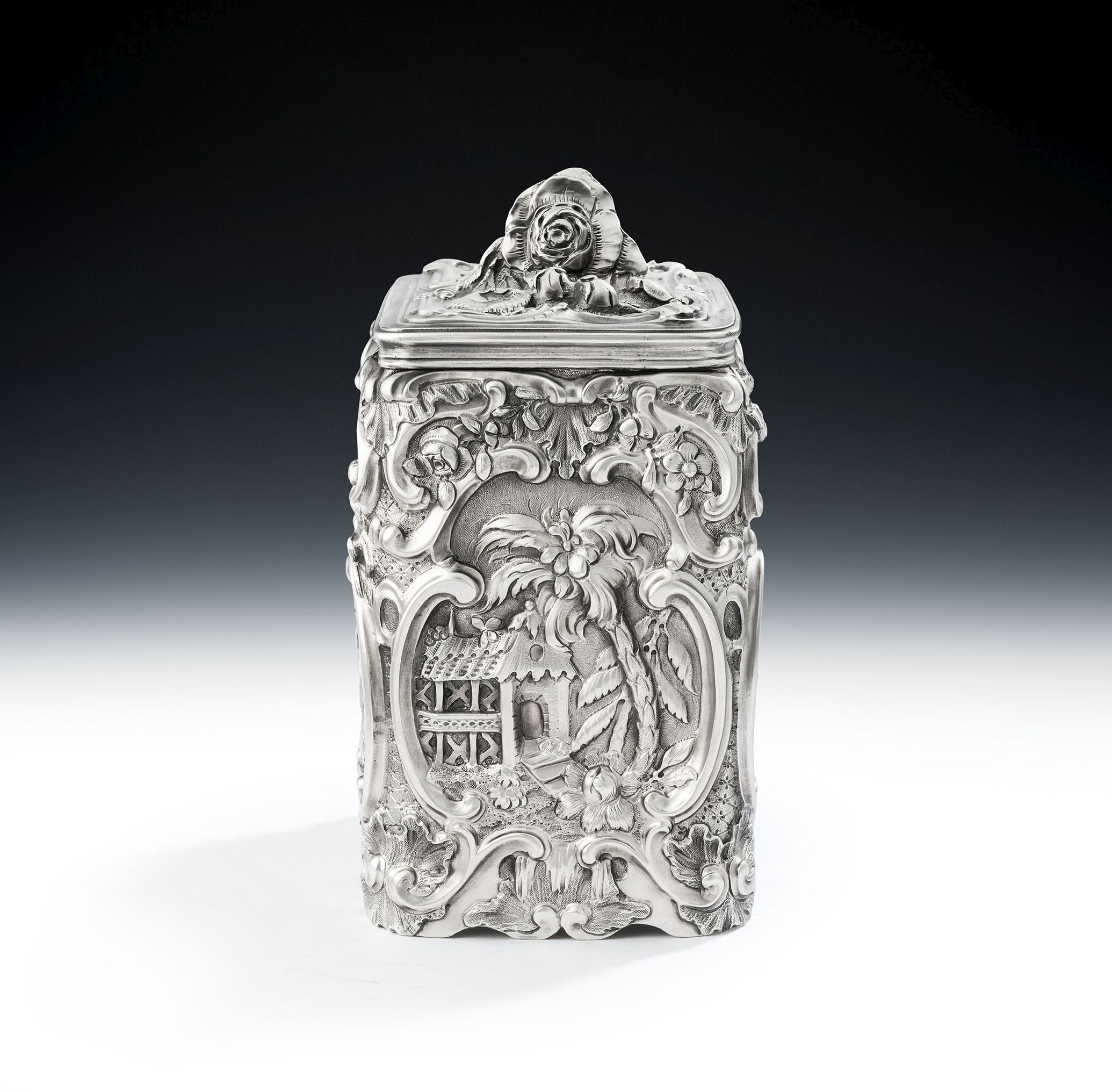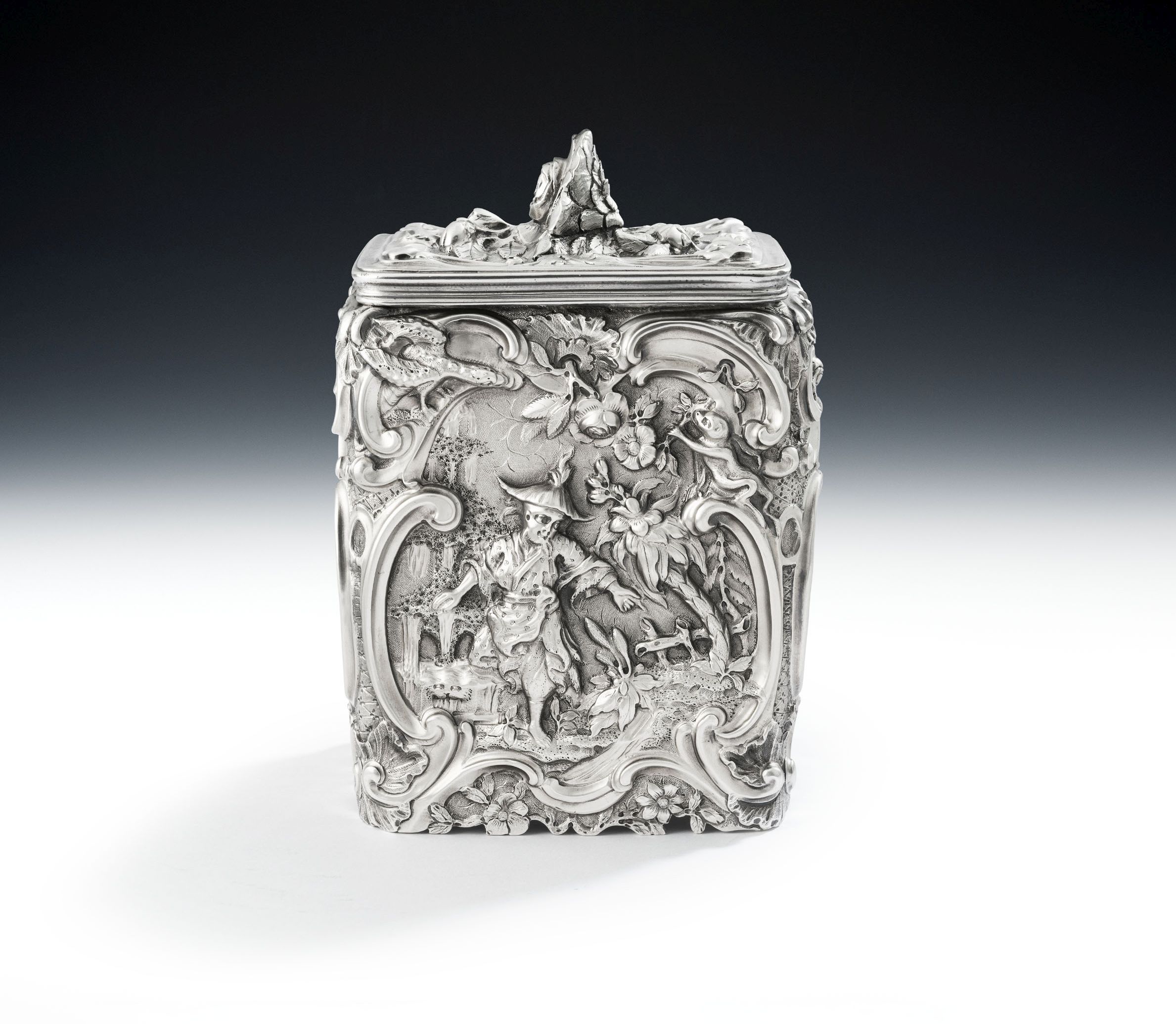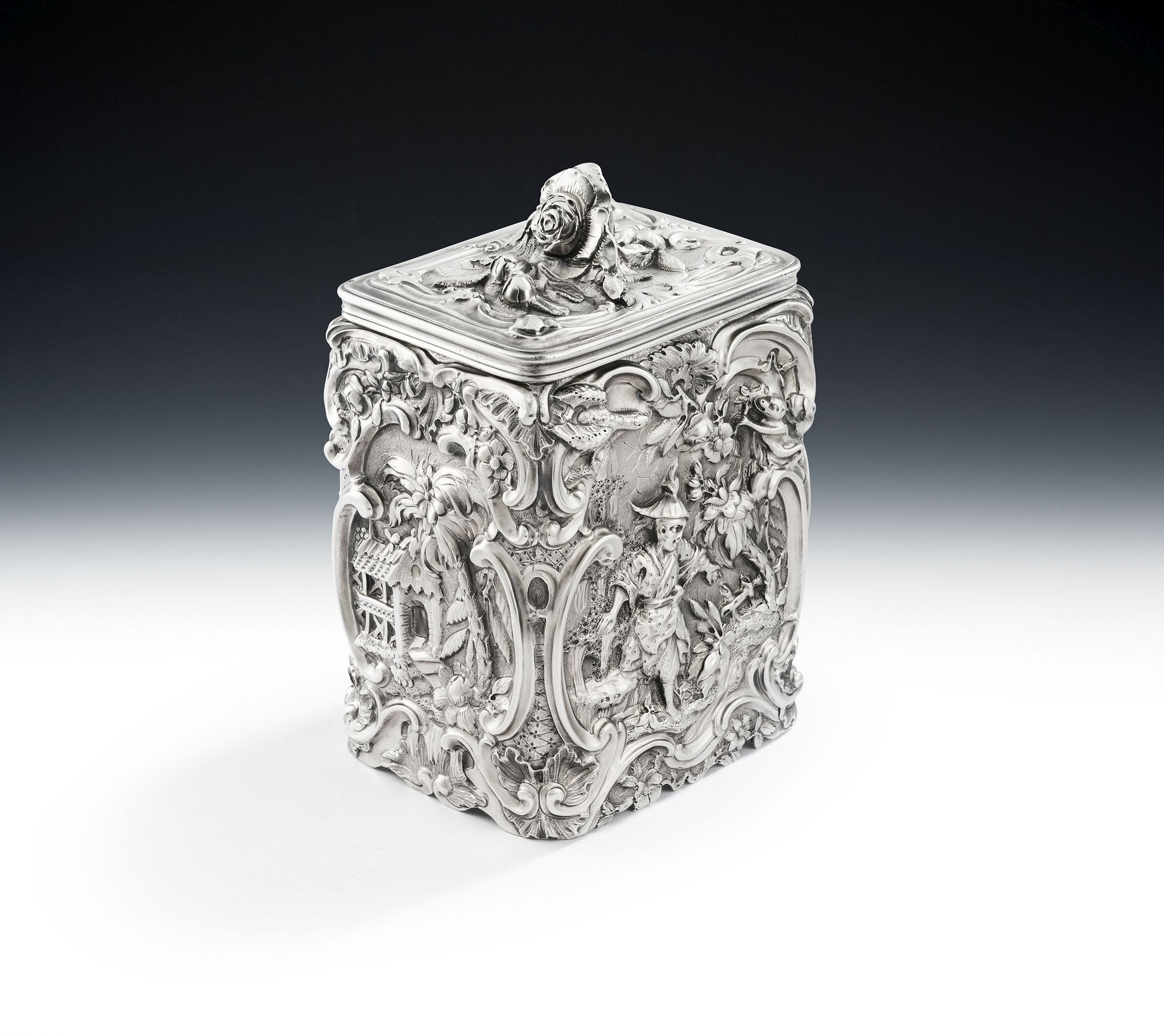 This rare George II Tea caddy is of large size and of upright rectangular form embossed and chased in high relief. The front and back display a Chinese male figure, pointing to the base of a coconut palm on the right side with further flowers, leaves and scrolls all on a matted ground. To the left a waterfall, the lowest part of which is chased with a lion's head with water pouring from its mouth and all flanked by two large ‘C’ scrolls, one capped by a monkey beneath two further‘C’ scrolls, the other with a dragon in flight amidst similar scrolls. The sides also with two large ‘C’ scrolls enclosing a building and a large coconut palm, all on a matted ground and with flowers, leaves, shells and scrolls all around, the lower part with water spilling over into a shell. The detachable lid with cast rose and leaf finial, surrounded by scrolls and floral and foliate sprays. The Caddy is in most exceptional condition and is fully marked on the base and with the Sterling mark on the cover.