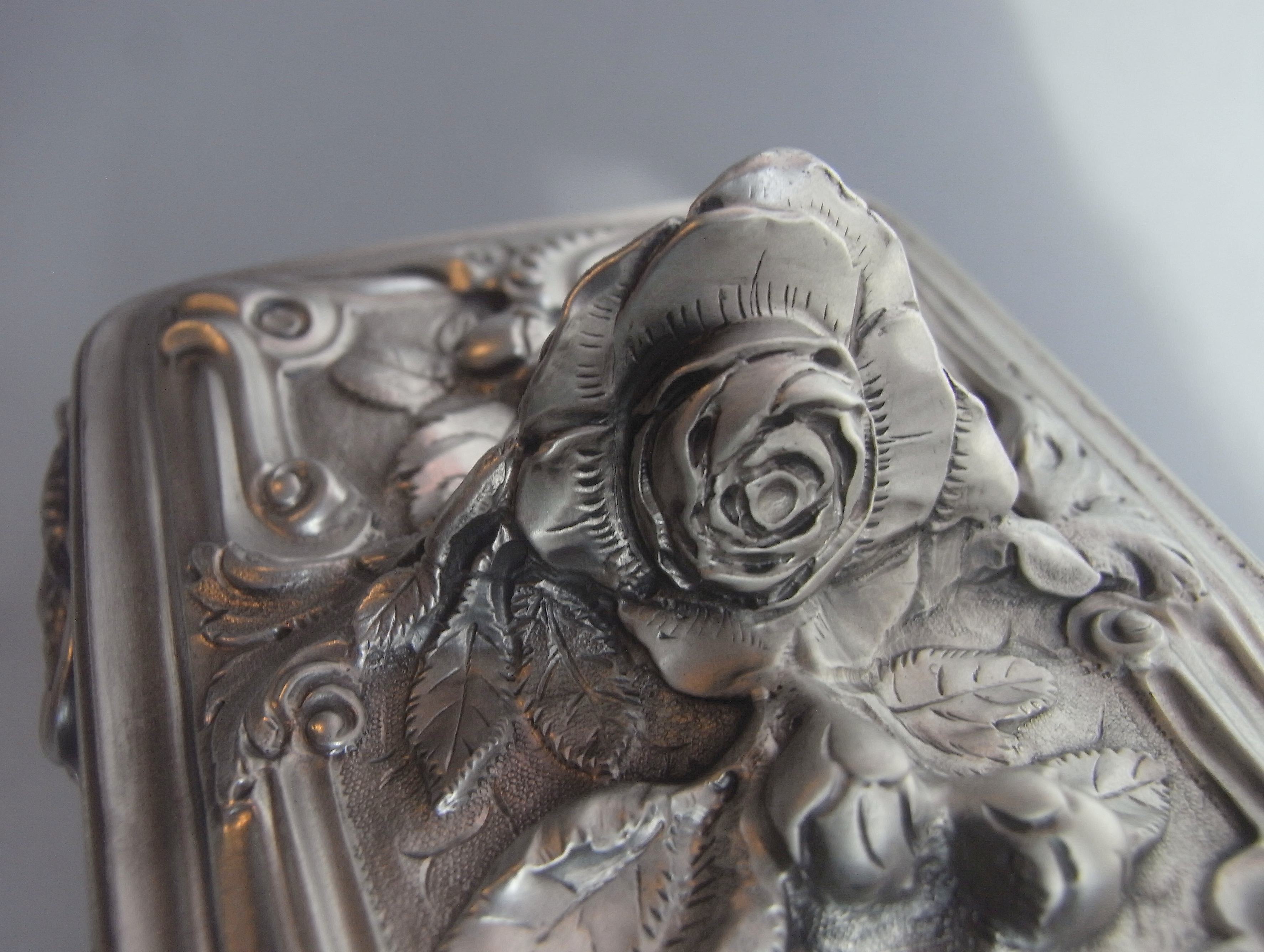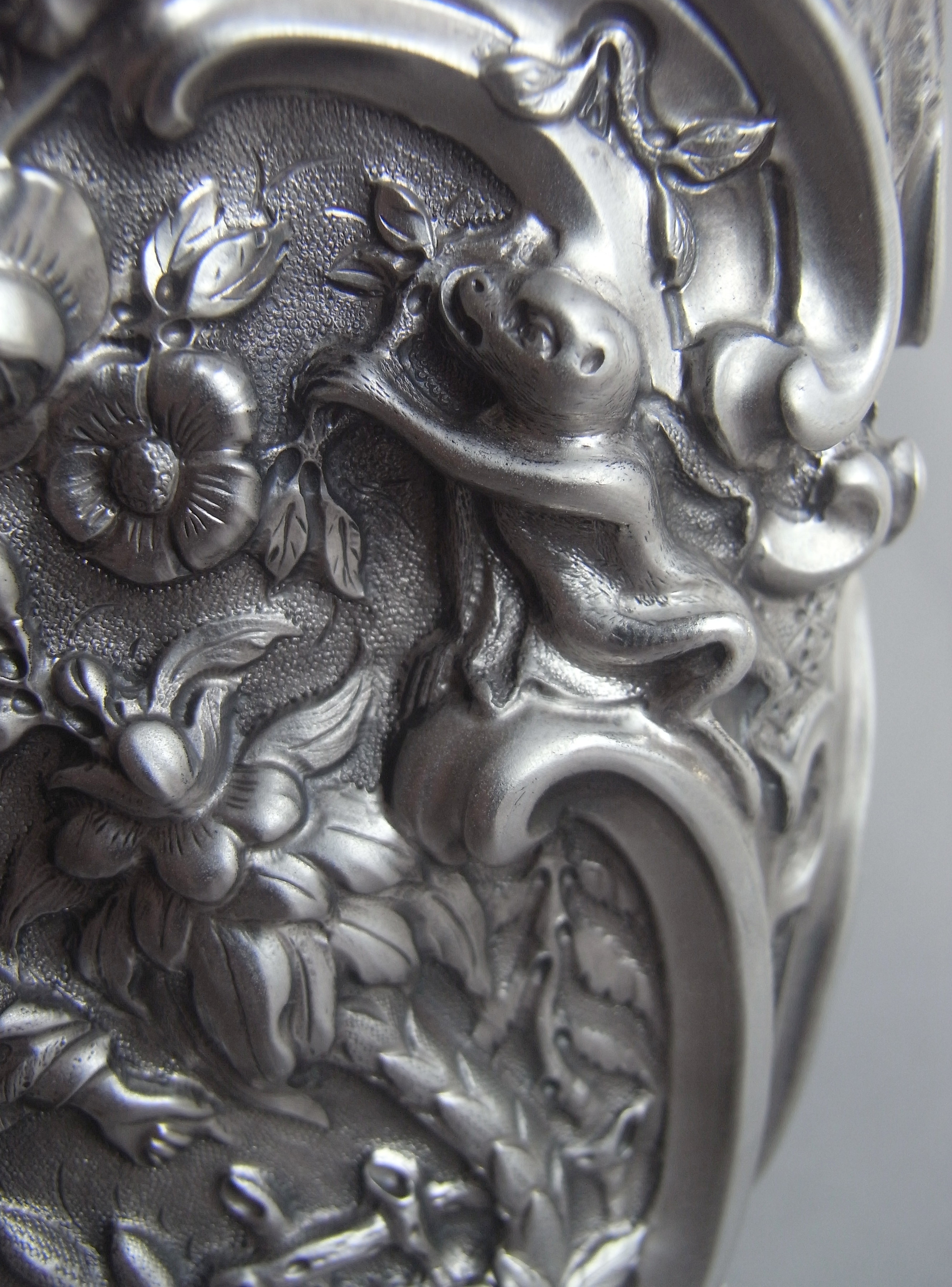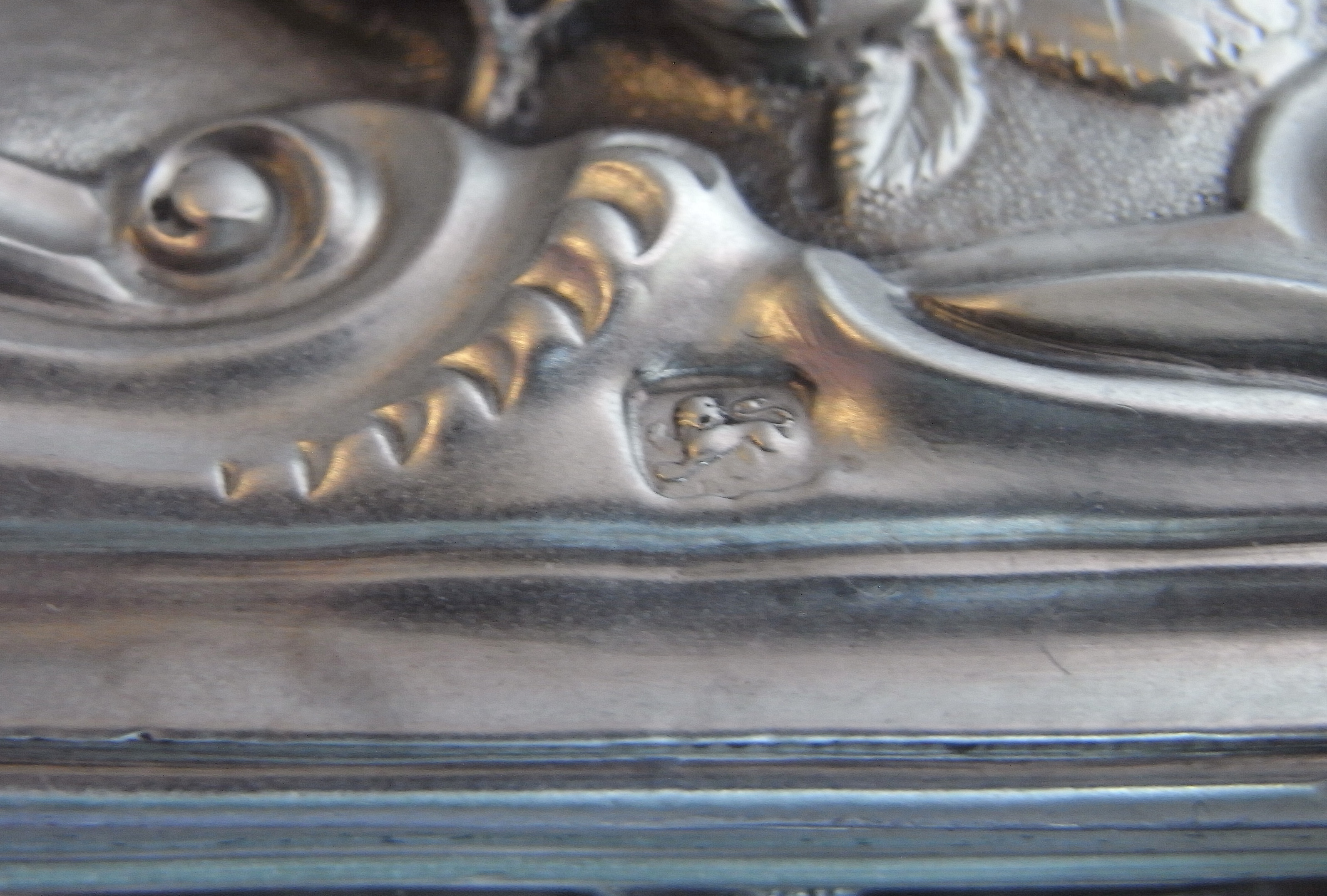This rare George II Tea caddy is of large size and of upright rectangular form embossed and chased in high relief. The front and back display a Chinese male figure, pointing to the base of a coconut palm on the right side with further flowers, leaves and scrolls all on a matted ground. To the left a waterfall, the lowest part of which is chased with a lion's head with water pouring from its mouth and all flanked by two large ‘C’ scrolls, one capped by a monkey beneath two further‘C’ scrolls, the other with a dragon in flight amidst similar scrolls. The sides also with two large ‘C’ scrolls enclosing a building and a large coconut palm, all on a matted ground and with flowers, leaves, shells and scrolls all around, the lower part with water spilling over into a shell. The detachable lid with cast rose and leaf finial, surrounded by scrolls and floral and foliate sprays. The Caddy is in most exceptional condition and is fully marked on the base and with the Sterling mark on the cover.