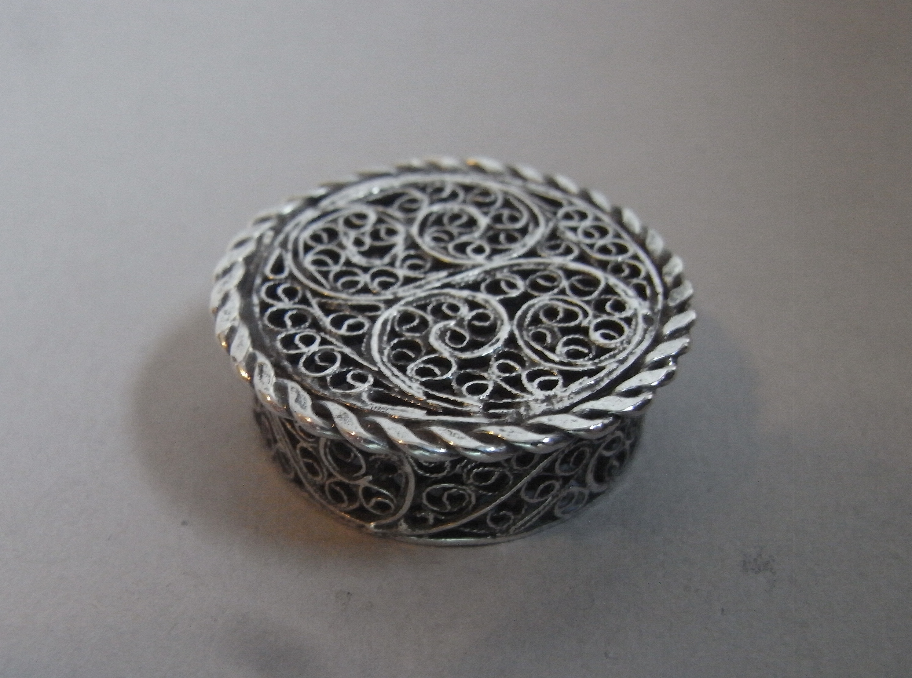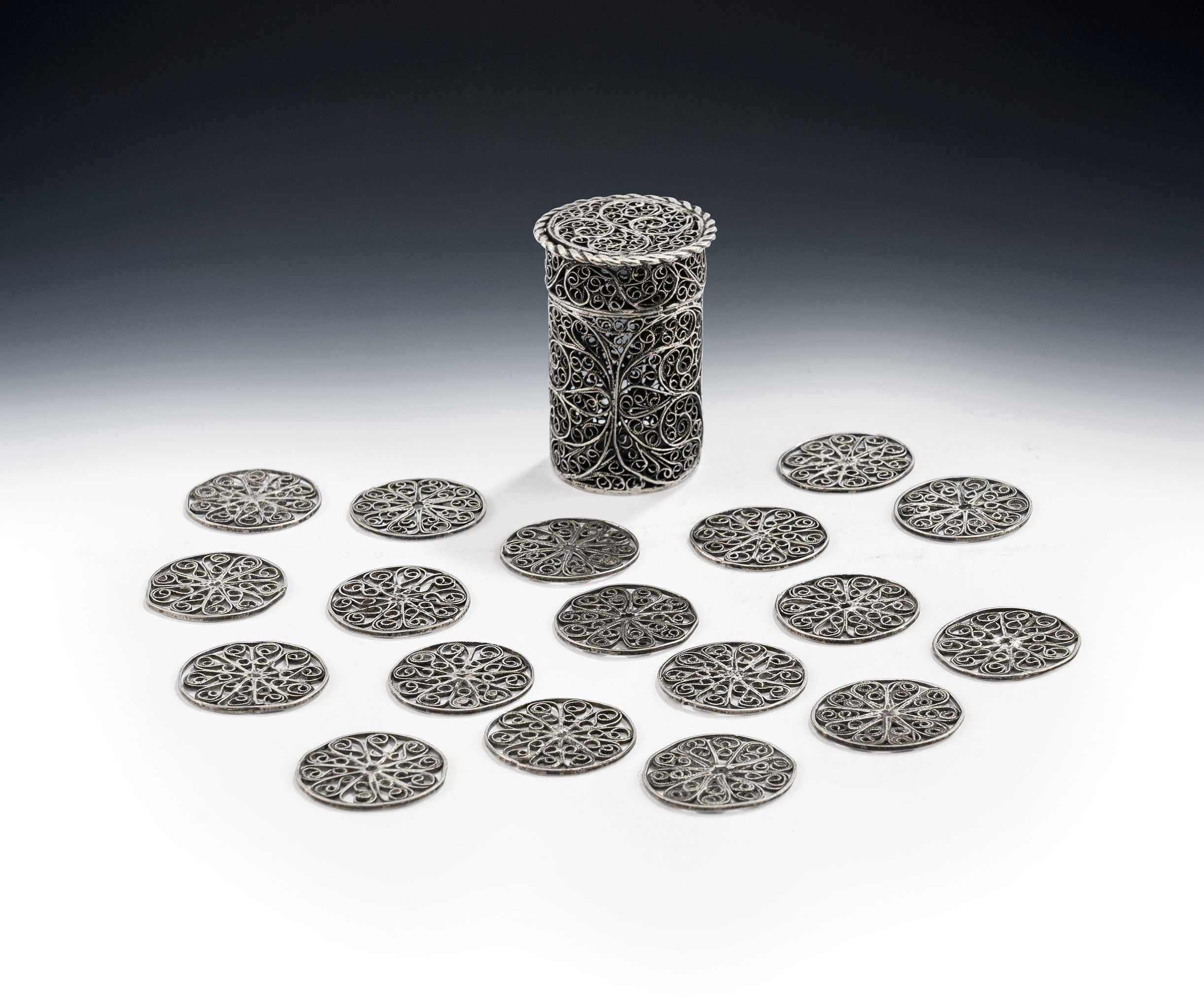 The box and counters were most probably made in London circa 1680 and the box is tubular in form with filigree sides and a filigree pull-off cover, with rope work border. This piece also possesses 18 original circular filigree counters, which is most unusual. Both the box and the containers and in excellent condition.