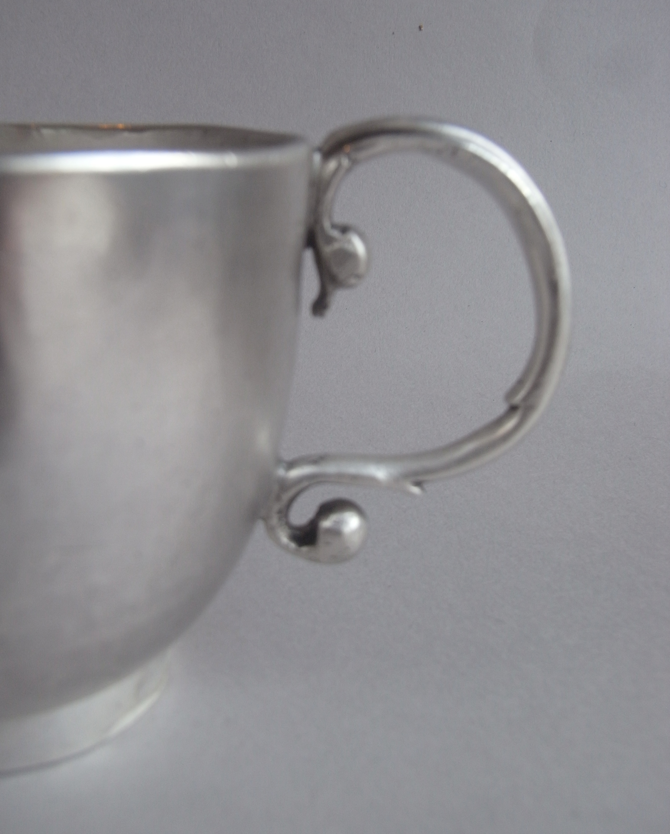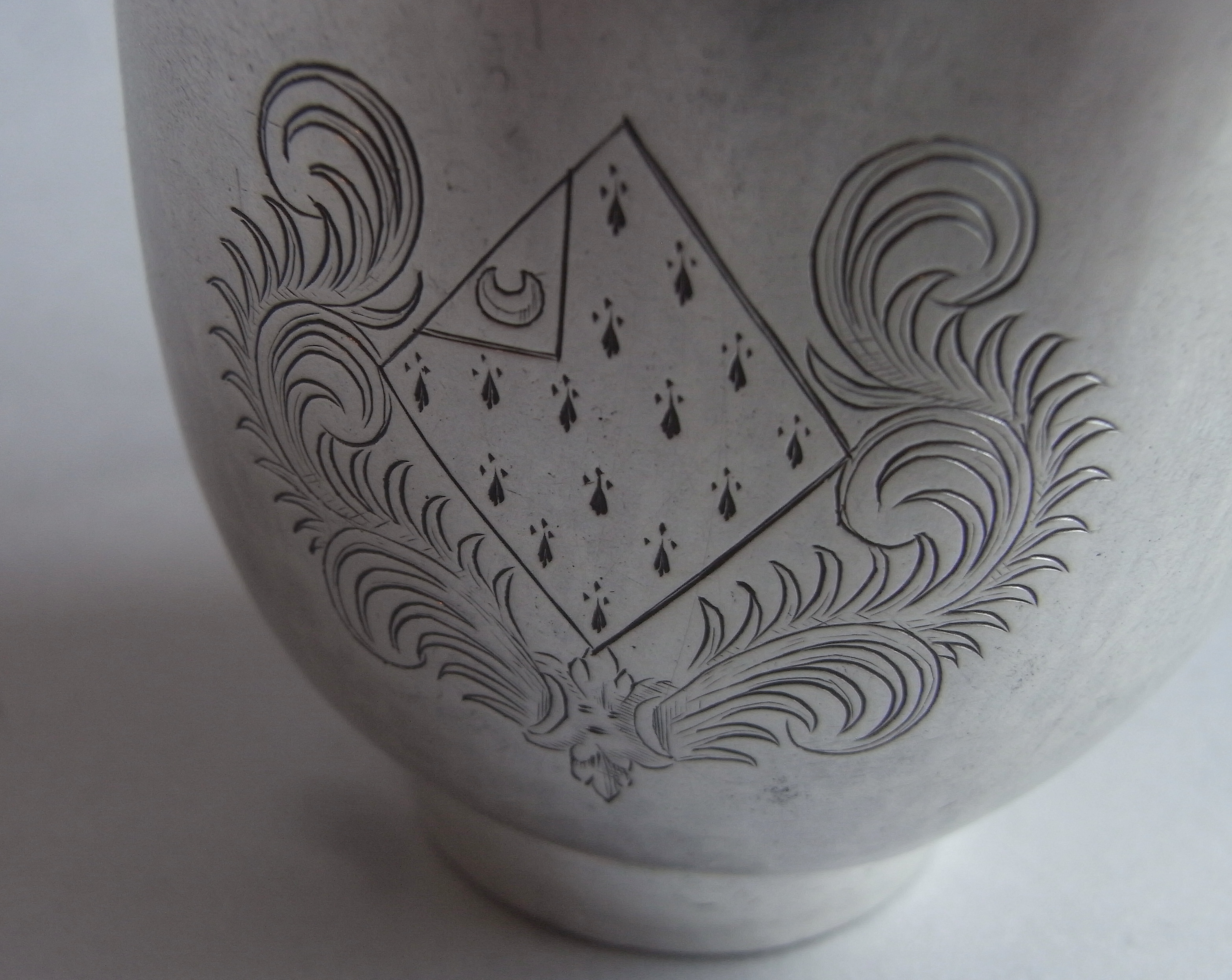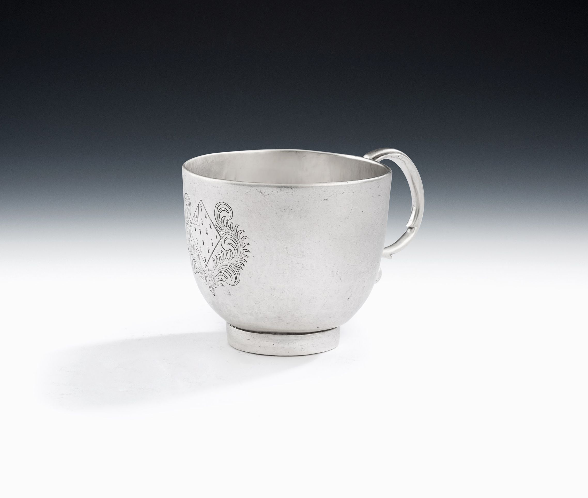 The Cup stands on a ring foot and has a slightly baluster plain body, of thick heavy gauge. This piece has a cast scroll handle and the front is engraved with the lozenge shaped Armorial of a Lady, surrounded by a pluming scroll cartouche. This piece is in excellent condition and is very well marked on the side of the main body. It is of an excellent gauge and weight and has a fine colour. The distinctive maker’s mark of Vn is shown in “London Goldsmiths 1697-1837”, Mark 3855. Interestingly, the example of his work cited is a Mug, so he must have specialised in this area. Drinking chocolate was introduced into England in the middle of the 17th century, however silver chocolate cups are rare from this early date. It was taken warm, rather than hot, so could be drunk from a silver vessel.