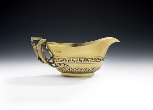 The Tea Caddy is modelled in the rare Drum form which was only produced for a short time during the 1770's before the advent of the oval forms. The main body is decorated with applied beaded bands on the rim and the base. The sides are most unusually engraved with Classical drapery swags and tassels, in addition to an upper and lower band of prick dot arch work, also repeated on the cover. The front is engraved with a navette shaped bright cut cartouche containing a contemporary Lion Sejant Crest, this being of the Peyton family. The cover terminates in an urn finial and the caddy still possesses its original lock. This piece is in excellent condition and is fully marked on the base and with the sterling mark on the underside of the cover. John Deacon was apprentice to John Moore and had workshops in Greenhill Rents, when this rare caddy was made.