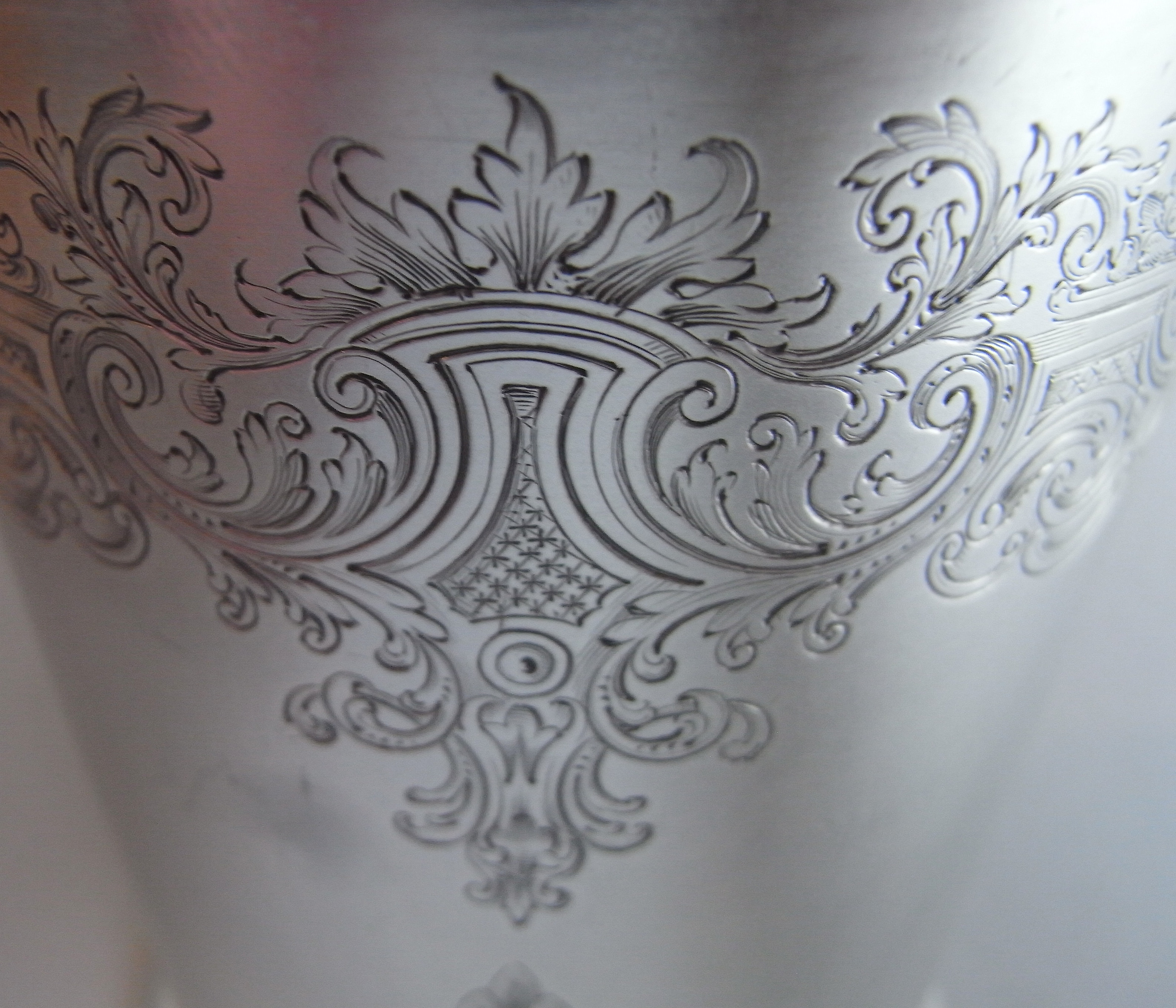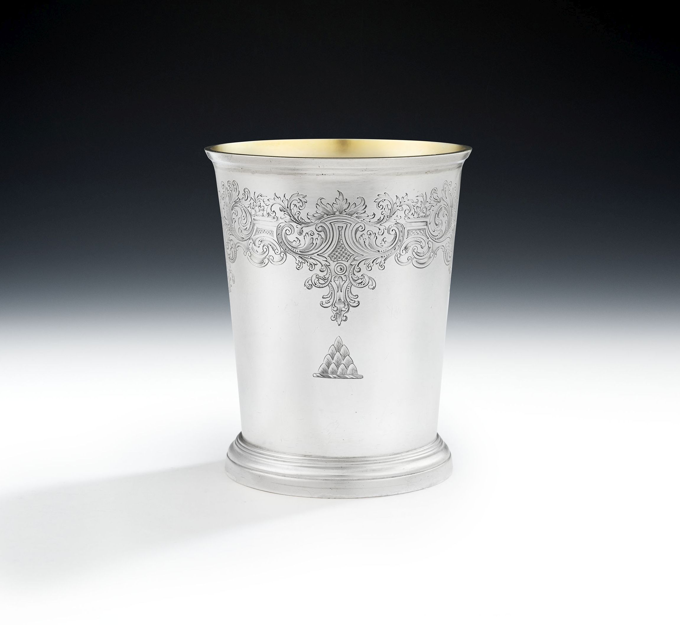 The Beaker stands on an applied spreading foot decorated with reeding. This piece is of a good size with slightly tapering sides and everted rim. The upper section of the main body is most beautifully decorated with Rococo revival engraved designs including, pluming feathery and foliate scrolls, architectural scrolls, trellis work, Rococo raying shells and floral and foliate sprays. The front is also engraved with a very unusual contemporary Crest and the interior displays deep original gilding. This piece is in excellent condition, is of a good gauge, and displays excellent marks in the base.
