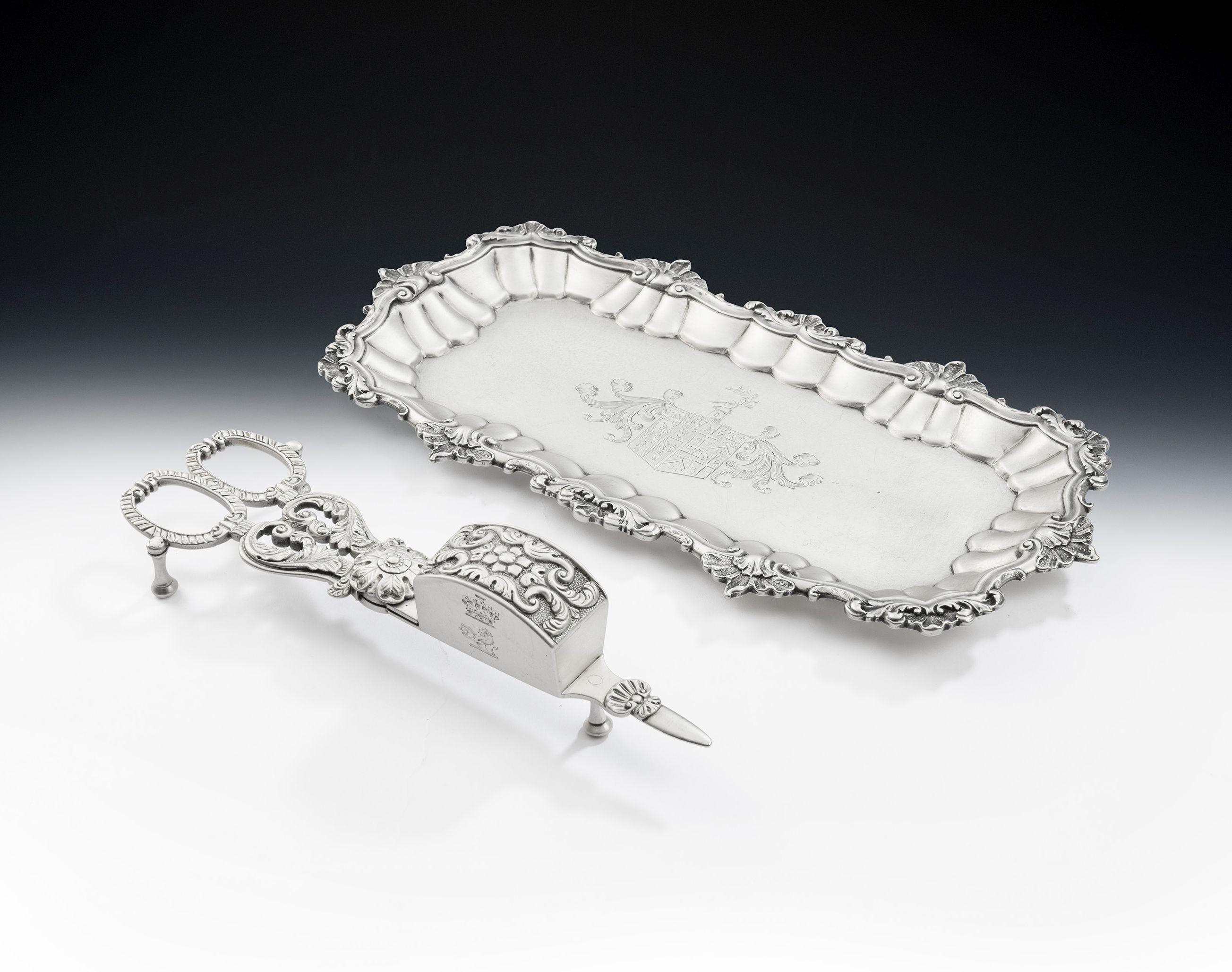 A very fine pair of George III Snuffer Scissors/Wick Trimmers made in London in 1813 by Thomas Radcliffe together with a very fine George III Snuffer Tray made in London in 1818 by Craddock & Reid.