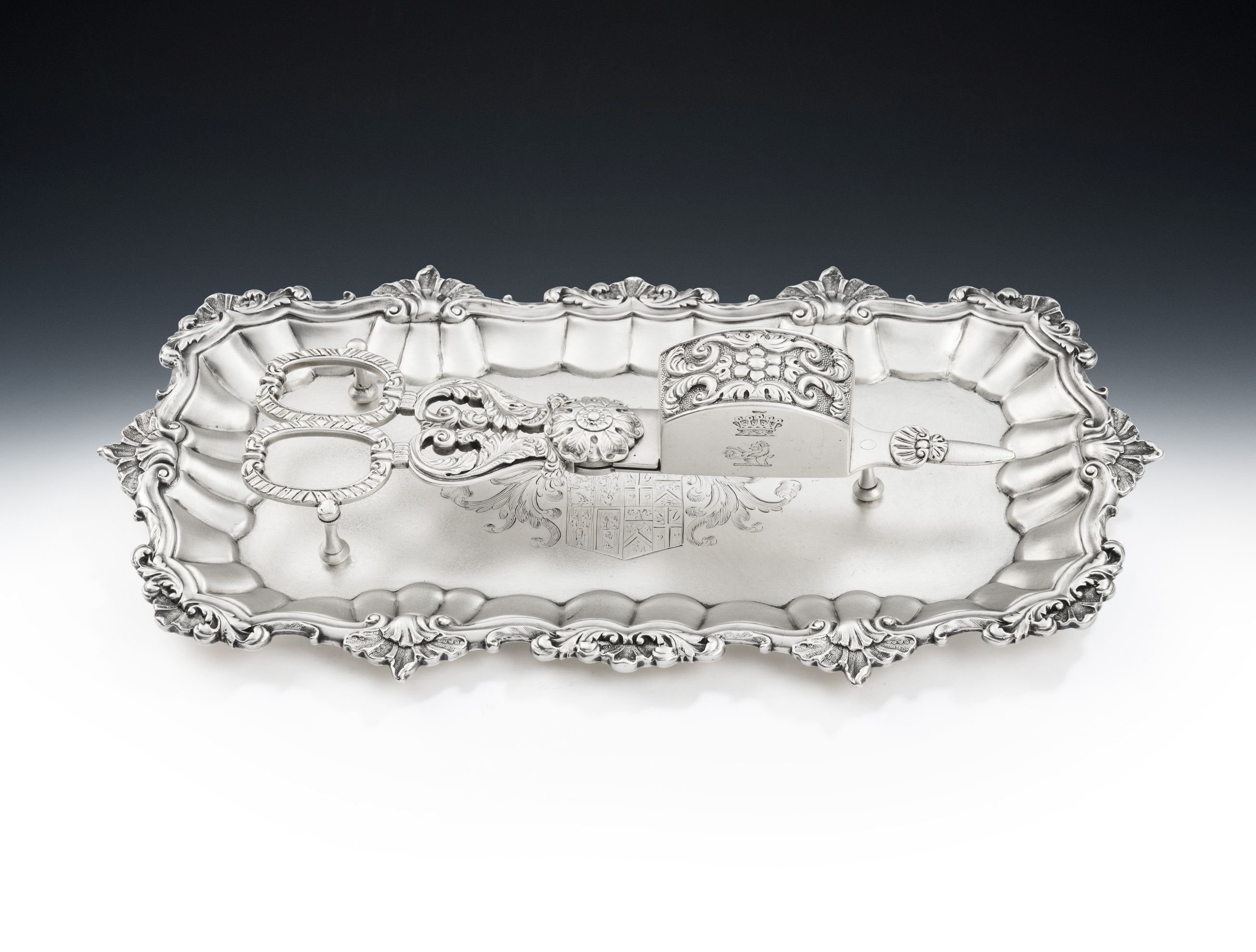 These exceptionally fine Snuffer Scissors are profusely decorated in the manner of Paul Storr, with gadrooning, foliate scrolls, shells and a central flower head boss. The top of the snuffing box is also decorated with foliate scrolls, around a central flower head, all on a matted ground. The side of the box is engraved with a contemporary Crest below the Coronet of an Earl. The Snuffer Scissors are in quite excellent condition and are very well marked. Their quality is outstanding, one of the finest pairs we have offered over the years. As you will appreciate, these were originally used for snuffing out candles and trimming the wicks of candles. Thomas Radcliffe had workshops at 29, Great Sutton Street, when these fine scissors were made.