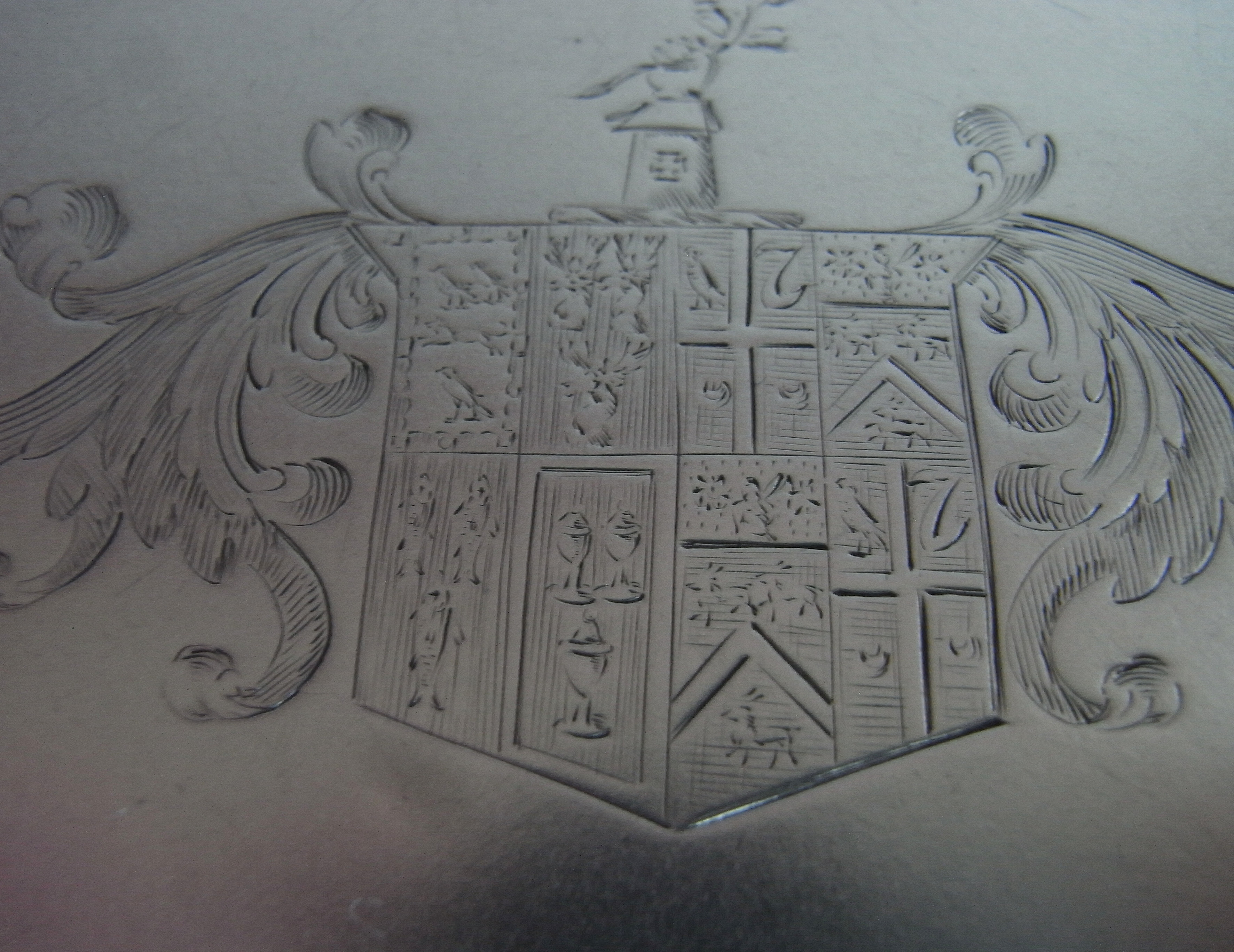 The Snuffer Tray is broad rectangular in form with a raised shaped rim decoarted with Rococo shells flanked by acanthus leaves. The centre of the Tray is engraved with a contemporary shield shaped Armorial, with Crest above, surrounded by a pluming scroll cartouche. The Tray is of the finest quality, is in excellent condition and is very well marked on the reverse. The Arms are those of William Williams (1774-1839) and his wife Anne [nee Rashleigh] (1776-1855) who he married in 1798.William Williams (1774-1839) was the second son of Bridehead, nr. Dorchester and Moor Park, Hertfordshire and Jane Chassereau. Williams' father was the head of a bank in Birchin Lane and when he died in 1814 William Williams would inherit £60,000 and become a partner in the bank (alongside his elder brother Robert who inherited over £500,000).