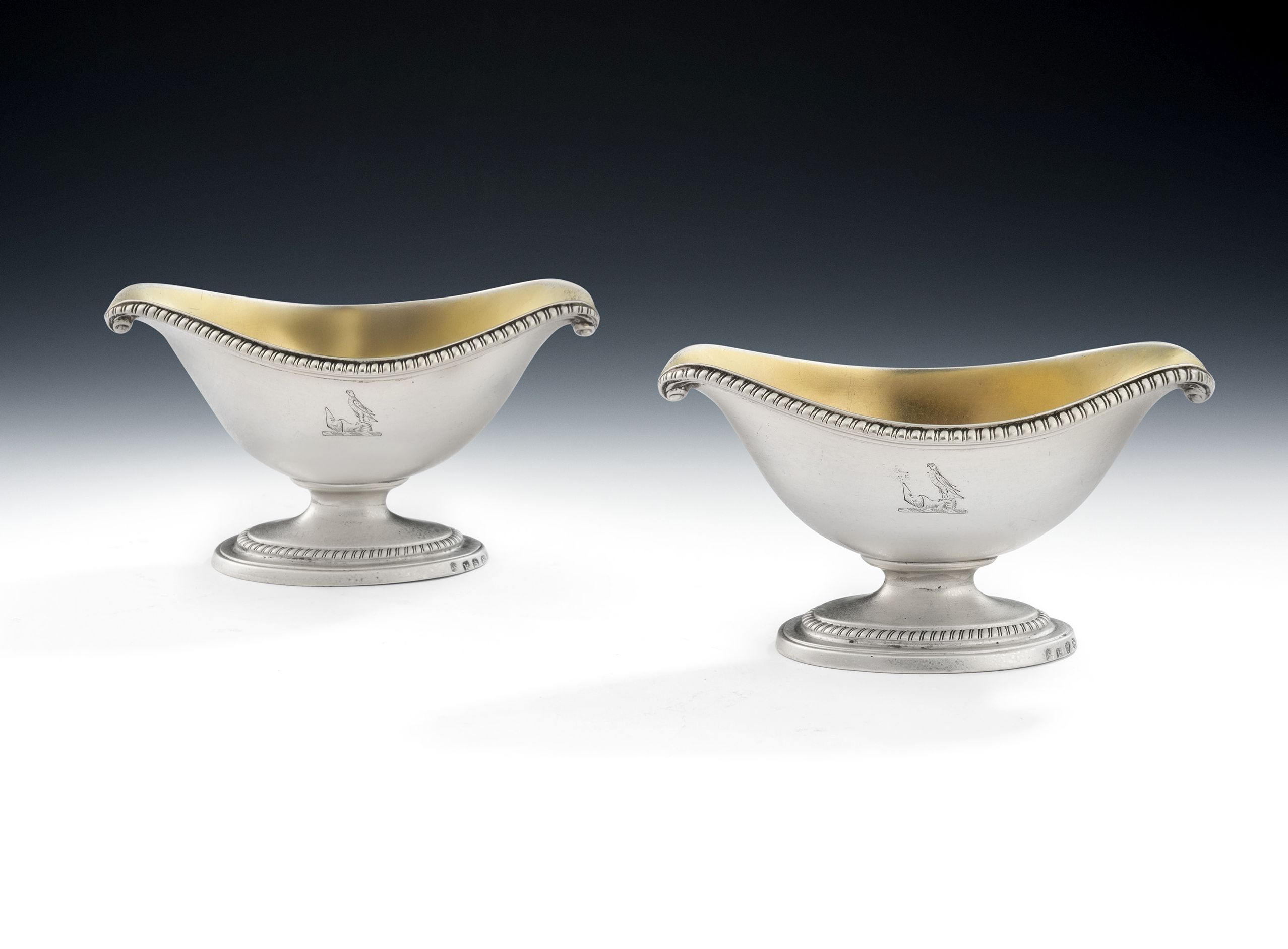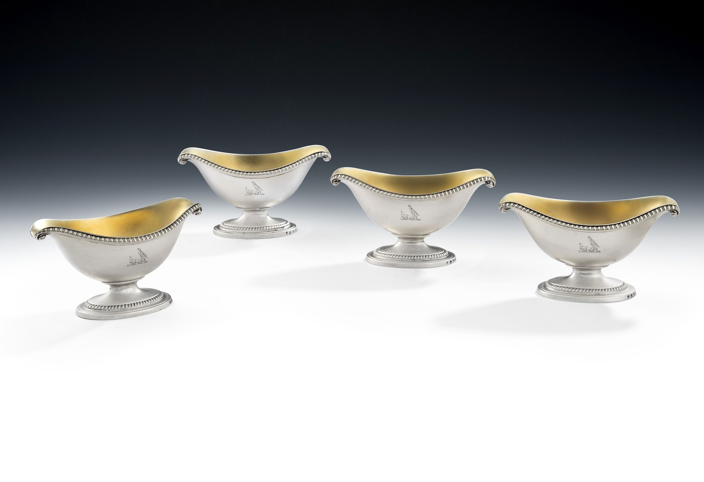 The Salt Cellars stand on a stepped oval pedestal foot which is decorated with reeding and gadrooning. The main body is "Boat" shaped in form and rises to a gadrooned rim, with "Onslow" scroll ends. The Salts have a gilded interior and are each engraved with a contemporary Crest. The Cellars are of a very good weight, are of the finest quality and each is fully marked on the foot. This crest is that of Acland who were an important West country family but one with many branches.