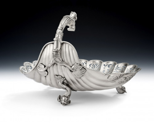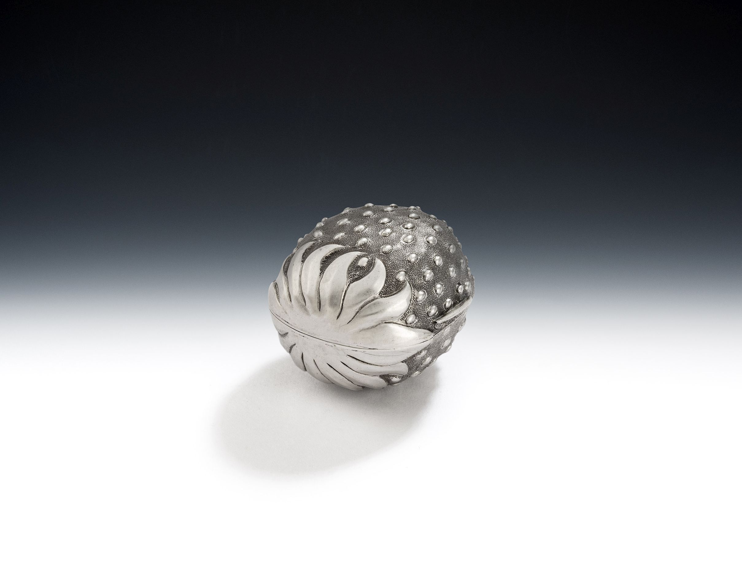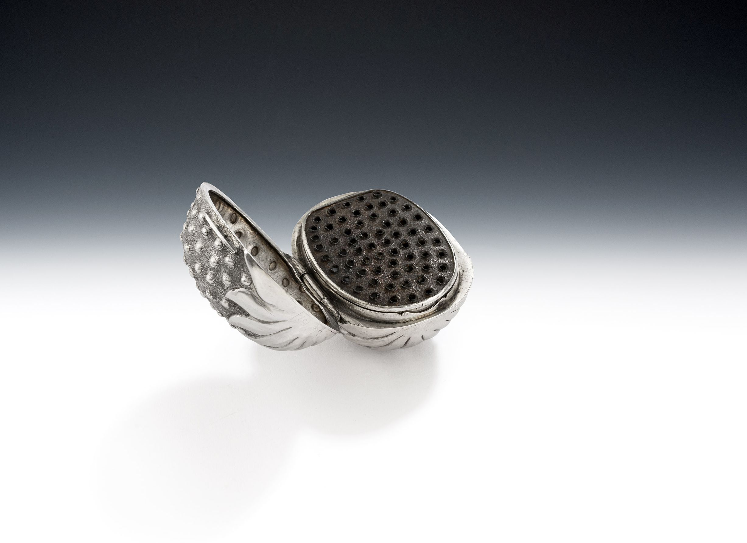Hilliard & Thomason made a series of naturalistic nutmeg graters such as walnuts, melons and clam shells, and the strawberry is recognised as the rarest and most desirable. The one we offer is finely modelled to simulate the form and surface of the strawberry, with stippled body on a matted ground. The smooth top section is modelled to simulate the end of the green stem. The box opens up to reveal the hinged, steel, silver rimmed grater. This piece is in quite excellent condition and is fully marked on the bezel and with the sterling mark on the silver rim of the grater. We offer this at a very good price and they seldom appear on the market one of the last was at Lyon & Turnbull in Edinburgh in 2007, making £ 7,440. The auction result page is attached.