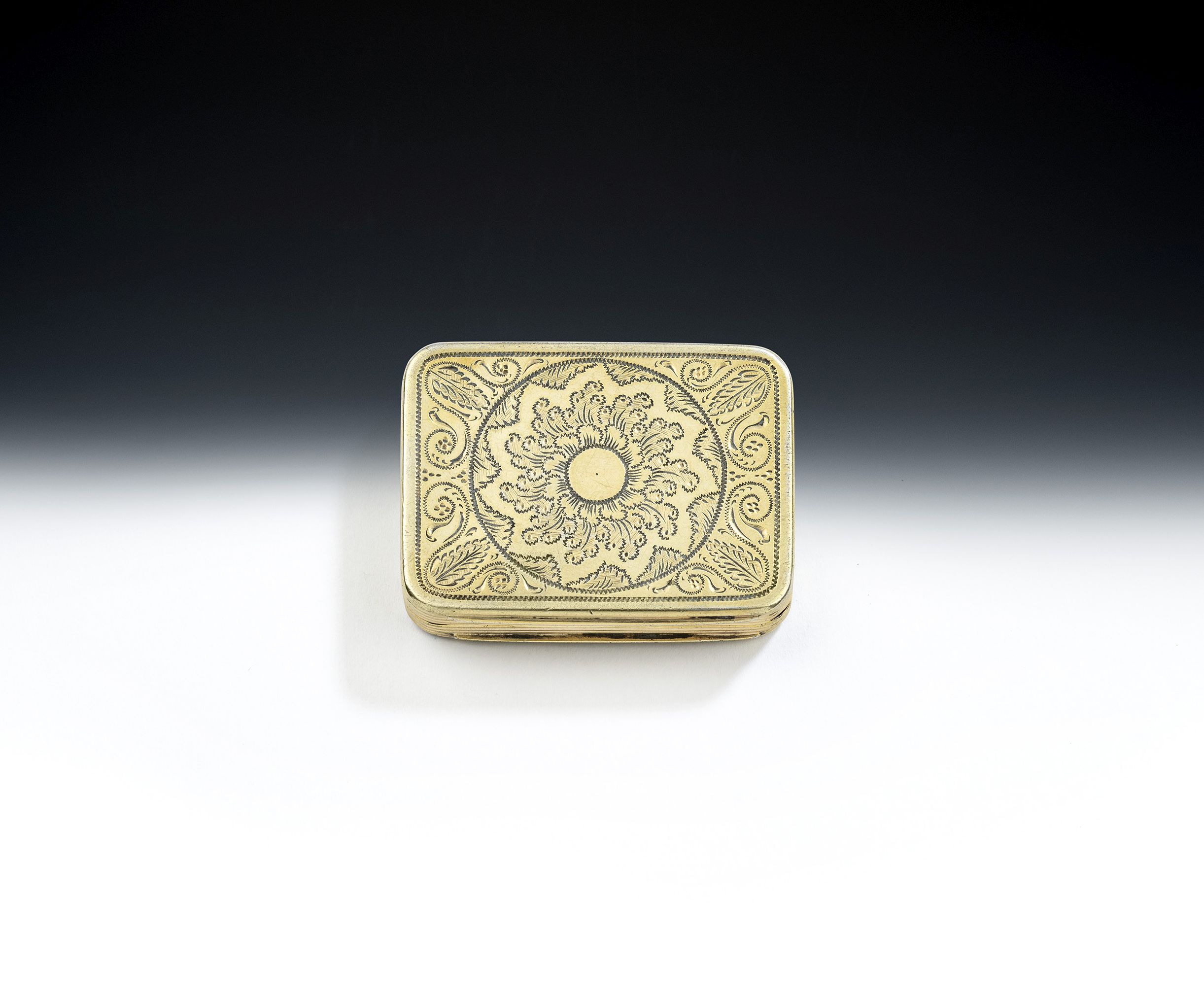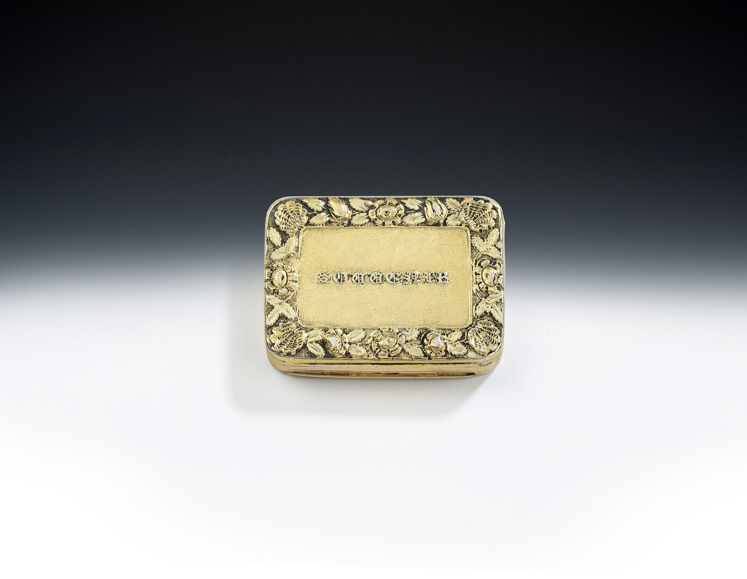 This rare box is broad rectangular in form and silver gilt. The cover displays an unusual outer border decorated with flower heads and leaves including roses and tulips. Each corner displays a raying Rococo shell. The base is decorated with a circular cartouche containing a swirling floral motif surrounded by a frame of prick dot designs, scrolls and foliate motifs. The very unusual interior grille echoes the engraved design on the base and is pierced and engraved with a central swirling floral motif, surrounded by pluming scrolls and Rococo shells. This is the first time we have seen this design of grille. The sides are decorated with reeding and the box is in excellent condition, being fully marked in the base and with the sterling mark and date letter on the underside of the grille. The cover displays the word "SOUVENIR" in unusual Gothic script lettering, as these boxes were often purchased as a souvenir of visiting a specific place. The work of William Williams II is scarce, however he was a very fine box maker working during this period, often of innovative design.
