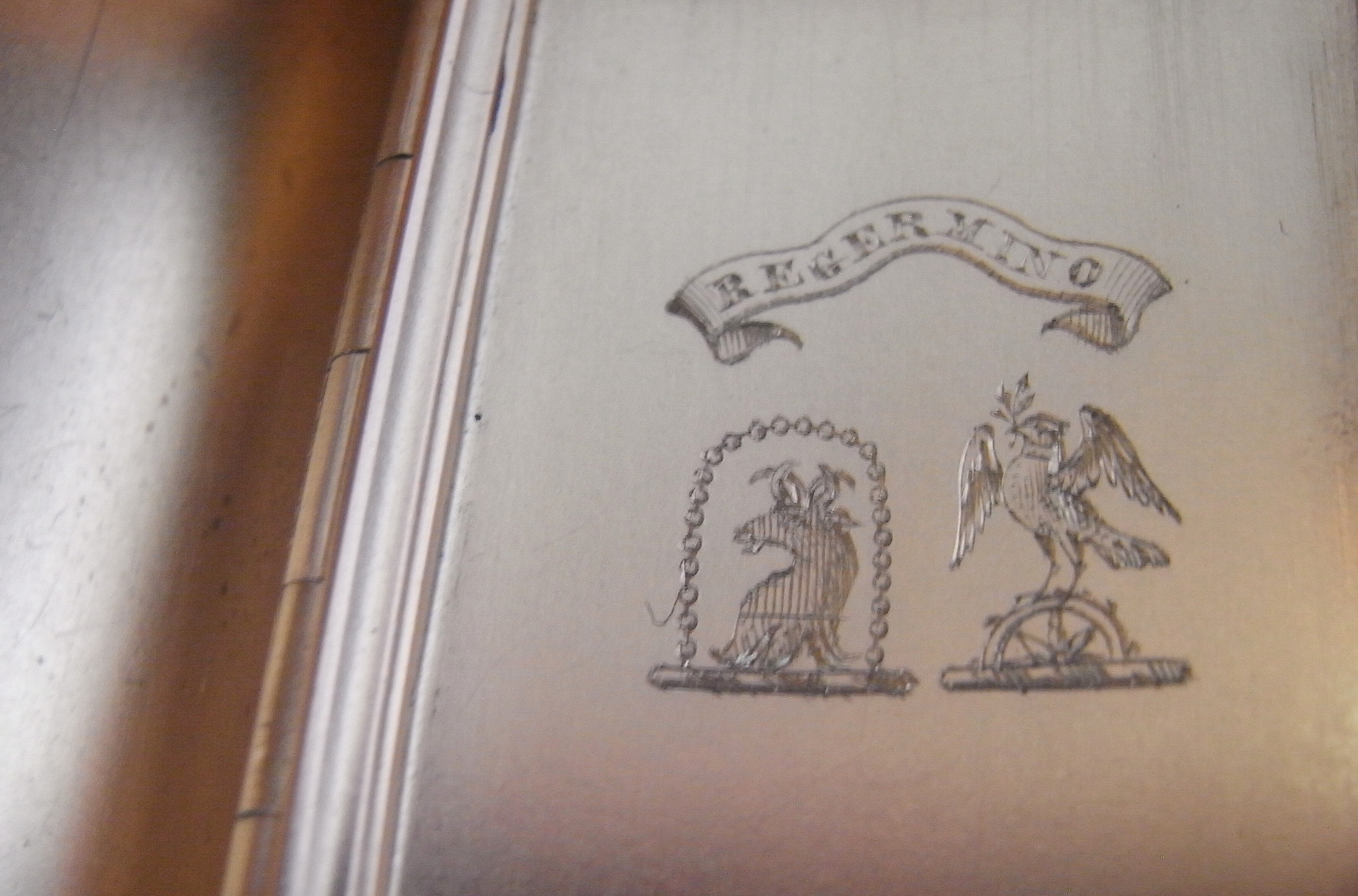 The Snuff Box is beautifully modelled in a rounded broad rectangular form. The cover, sides and base are decorated with plain vertical linier bands interspersed with engine turned panels. The cover displays an upturned thumbpiece and each end displays a concentric panel of engine turned designs, around a plain central elongated oval. The decoration is in excellent crisp condition. The interior is well marked and the underside of the cover is engraved with a double Crest below the motto "Regermino" engraved on a banner. The crest on the right is that of Laing (as used by Sir James Laing of Thornhill, Sunderland). The motto "Regermino" is the Latin for "to spring forth, sprout, or germinate again".