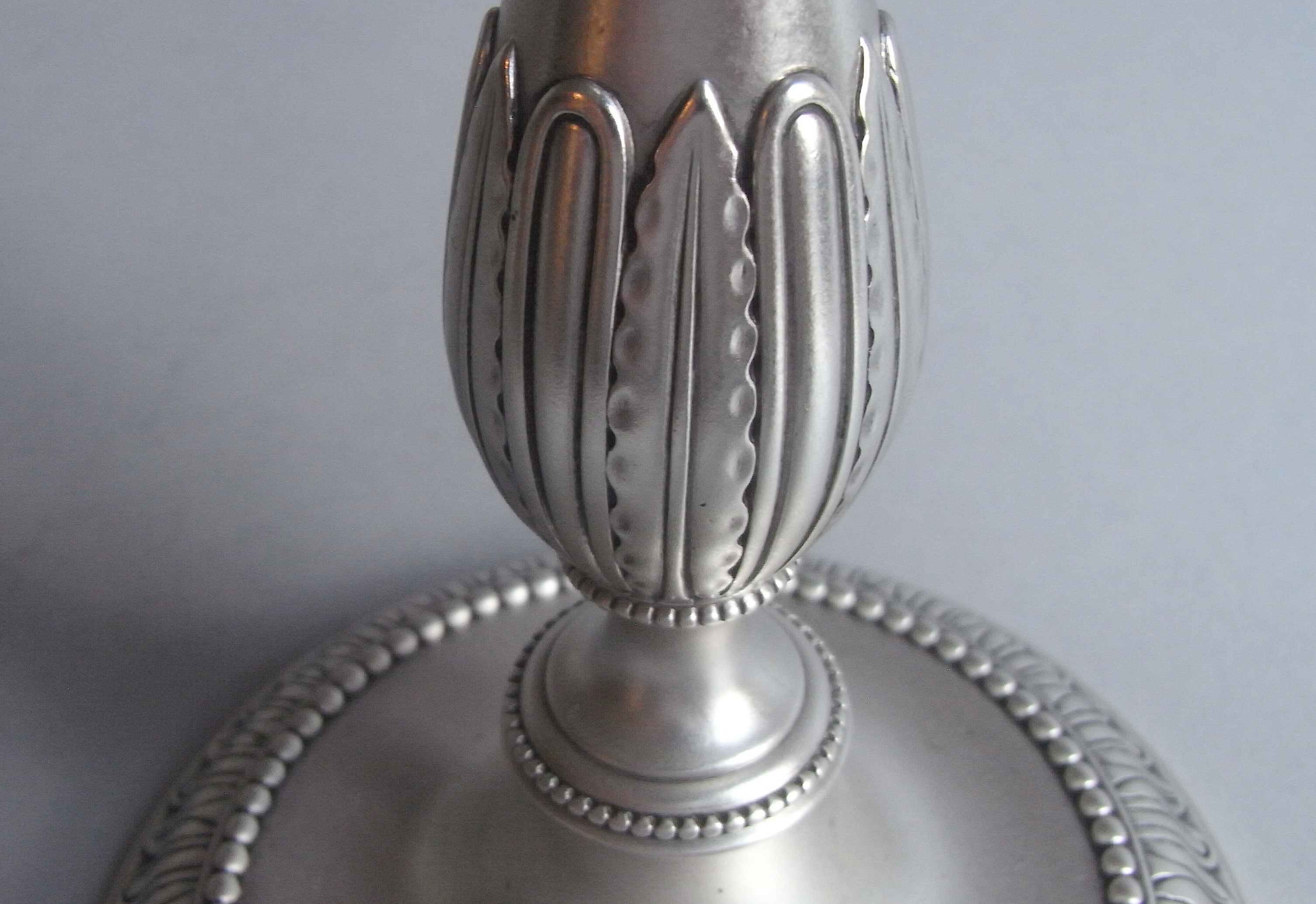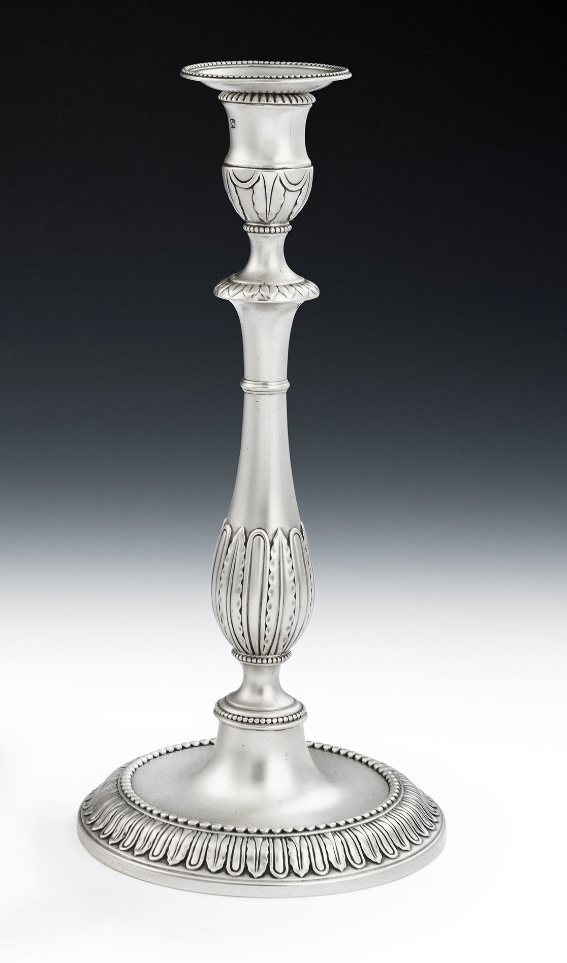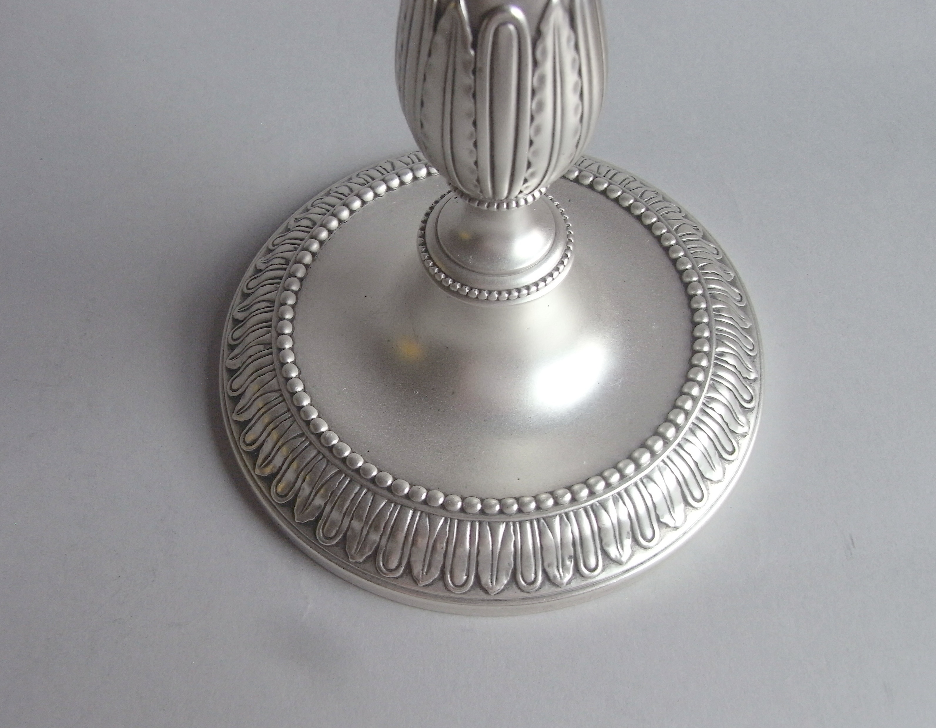 The Candlesticks are cast and stand on a circular foot, with plain sunken well, and an outer band decorated with lobes, acanthus spears and raised beading. The baluster stems are decorated with horizontal beading, as well as the acanthus spears and lobing seen on the base. The shaped candle sockets display foliate motifs, plain garlands and beading and the circular pull-off nozzles have a raised outer beaded band. The Candlesticks are of the finest quality, being cast, and modelled in a beautiful restrained Classical form. Each is fully marked in the foot and with the sterling mark on the capital and the nozzle. They are in excellent condition.