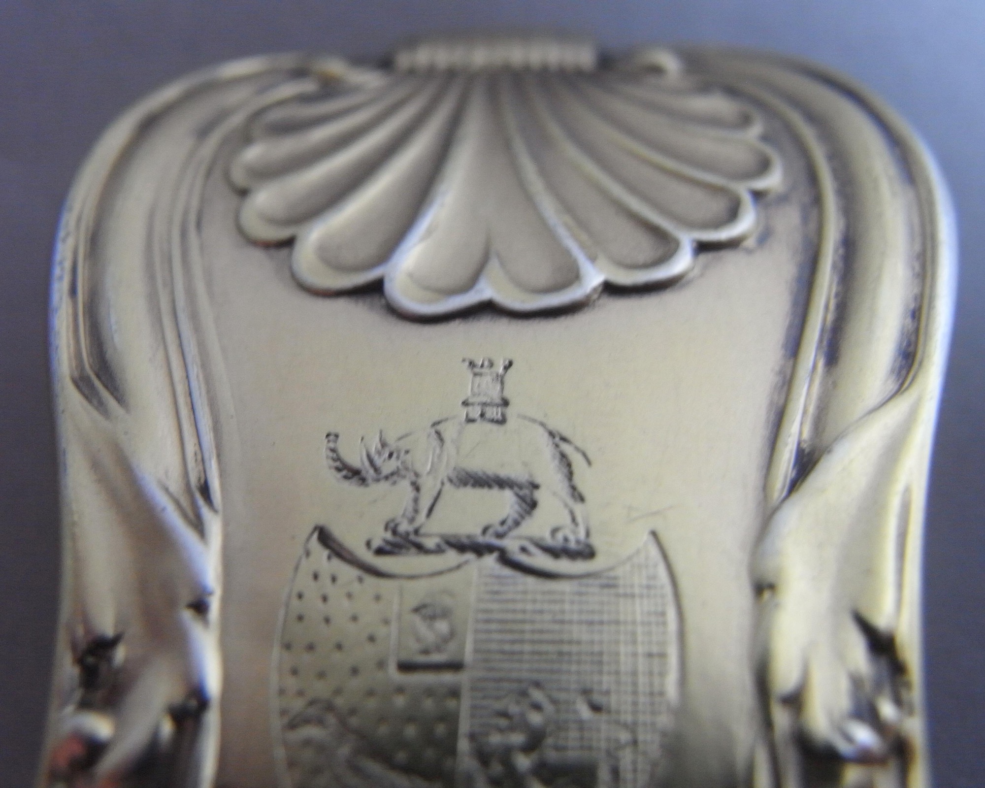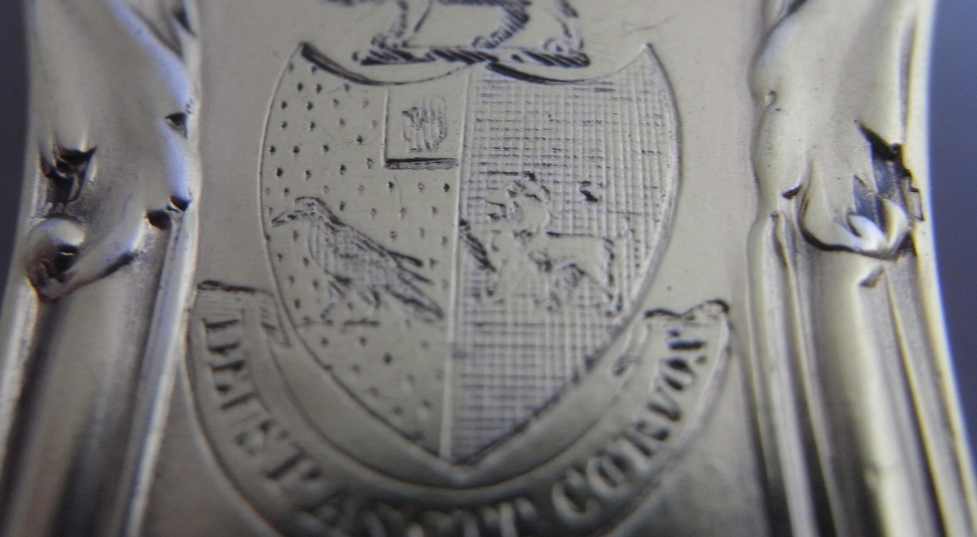 The Spades are modelled in the "Hourglass" pattern, which is double struck, the pattern being on the front, as well as the reverse. Both are of a very good gauge of silver and each is engraved at the top of the stem with a contemporary Armorial, with Crest above and Motto below, engraved on a banner. The Arms are those of Corbet impaling Taylor, with an augmentation of the red hand of Ulster for a Baronet. They are, therefore, those of Sir Andrew Corbet ( 1766-1835), 1st Baronet of Moreton Corbet, who married Mary Taylor of Lymm Hall, Cheshire, in 1790. Sir Andrew and Lady Corbet lived at Acton Reynald Hall, not far from the spectacular ruins of the ancestral seat of Moreton Corbet Castle, an Elizabethan manor house of remarkably sophisticated and ambitious design - now an English Heritage property. We have attached images of the house, and the ruin today.