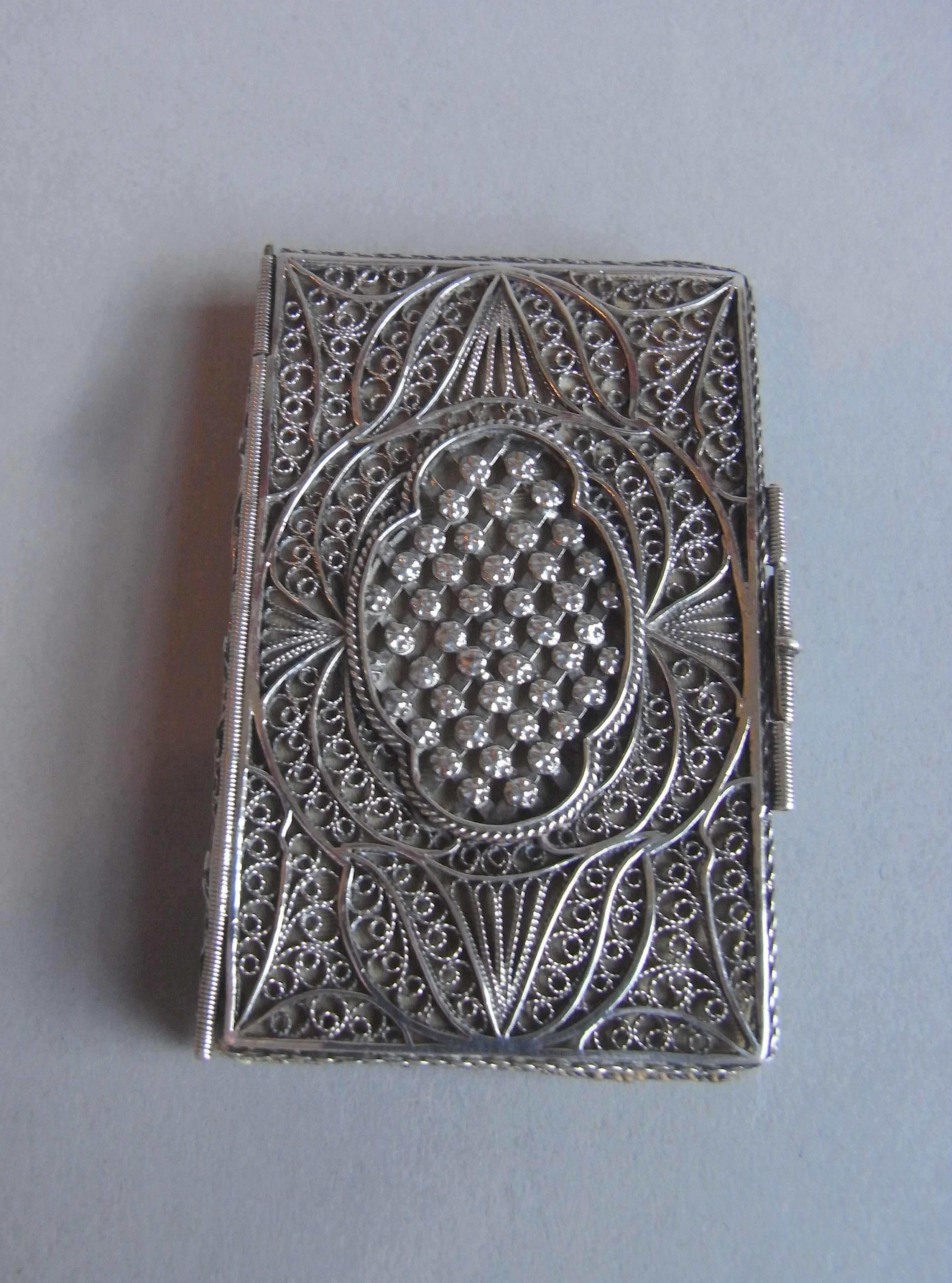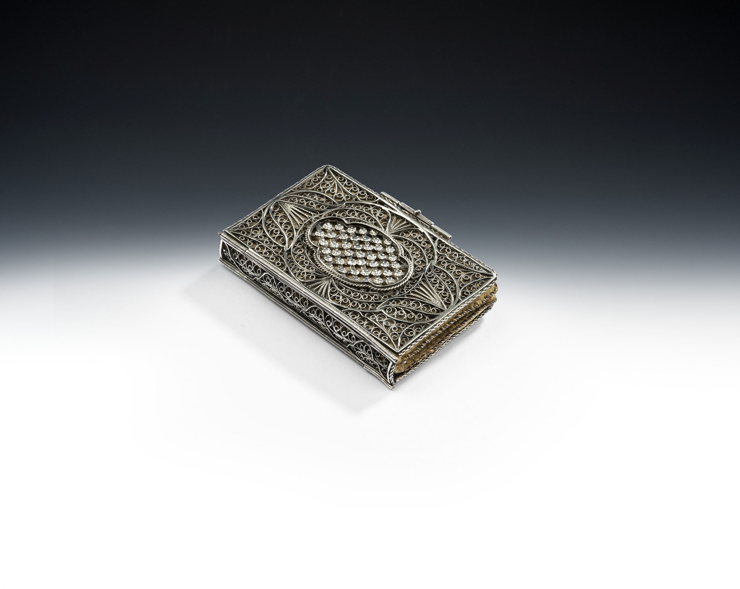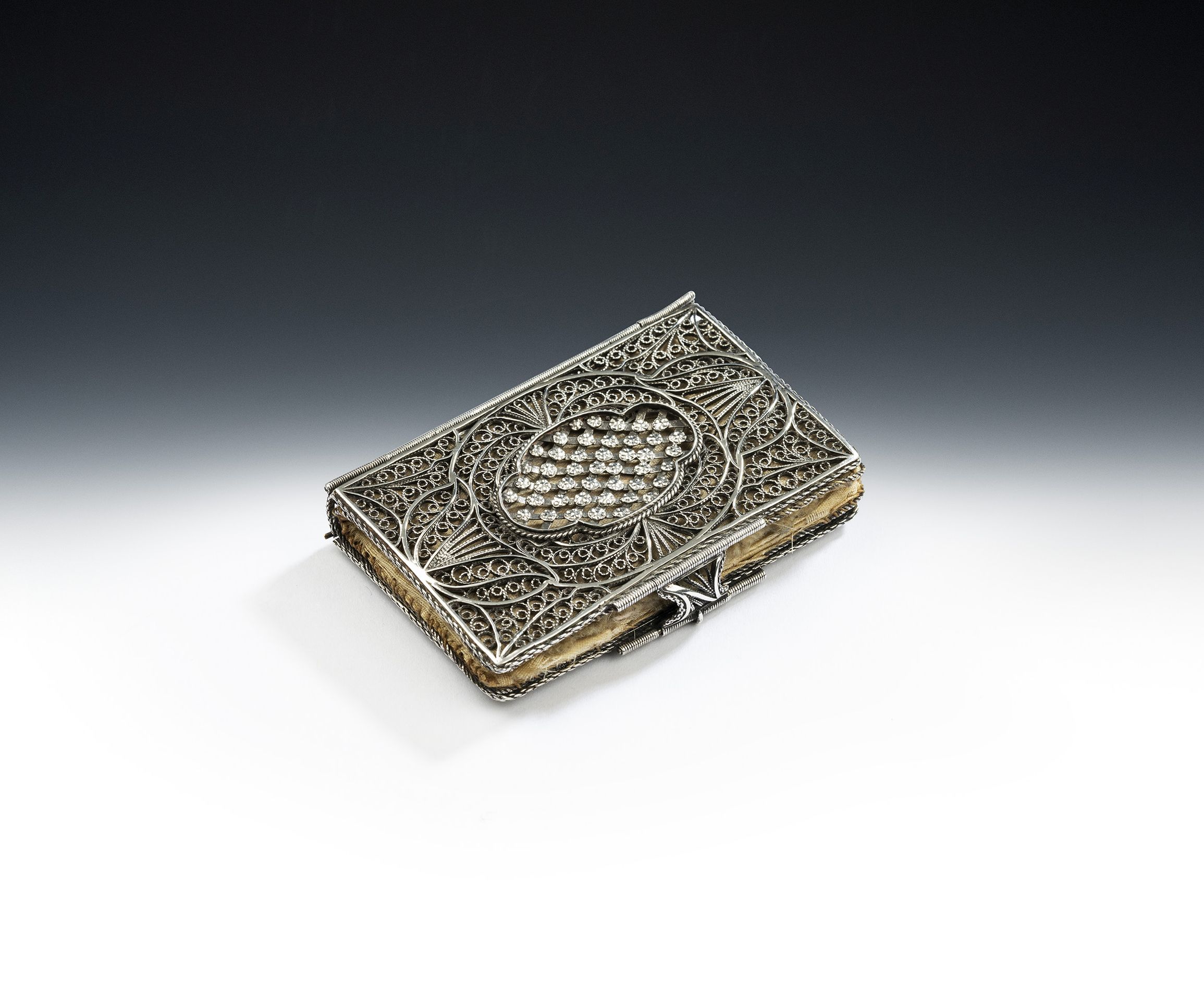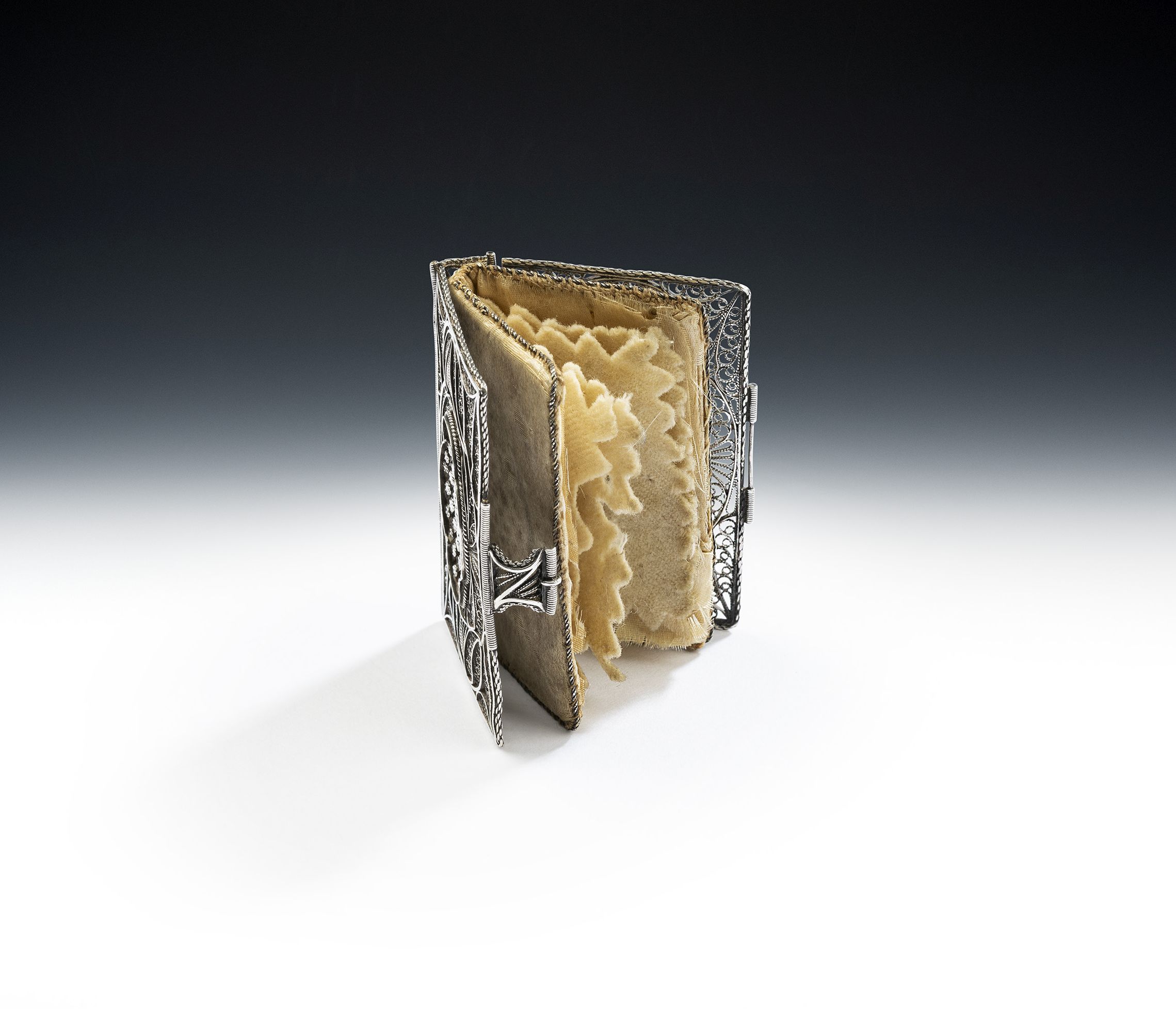 This beautiful case is modelled as a book with divided spine and two filigree fastening clasps and was used to carry needles in. It also contains its original felt, braid lined, leaves for pinning the needles to. These are also bound as a book. The centre of the front and the back displays a central raised shaped oval panel decorated with roundels. This piece is in quite excellent condition and the quality of the filigree modelling is exceptional.