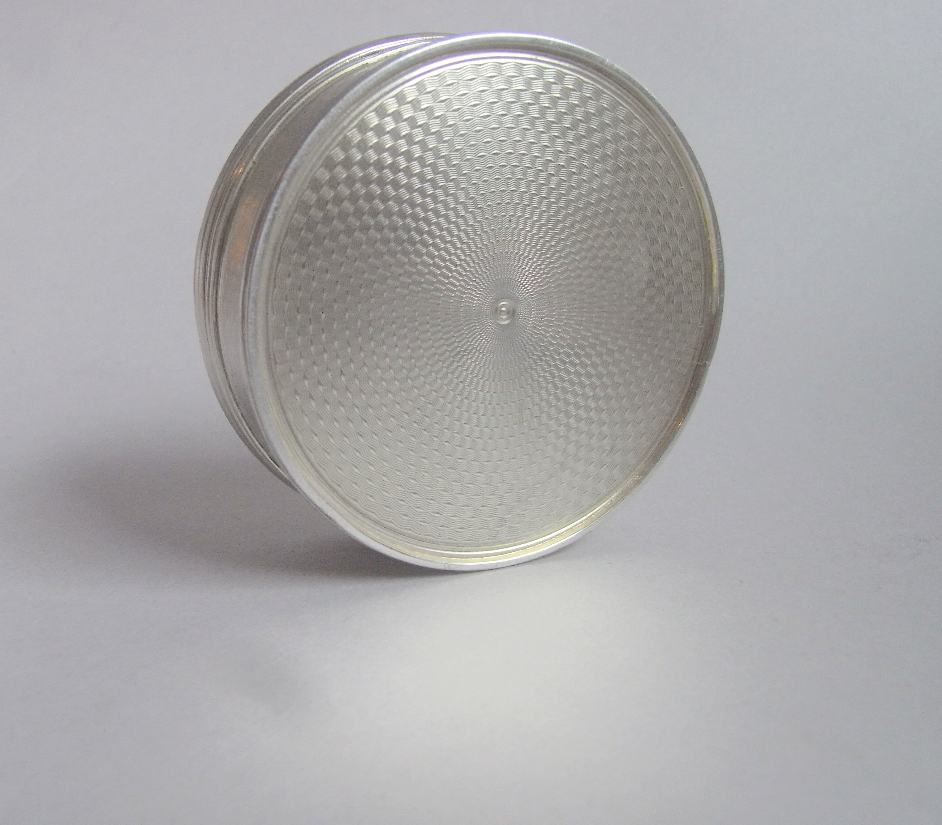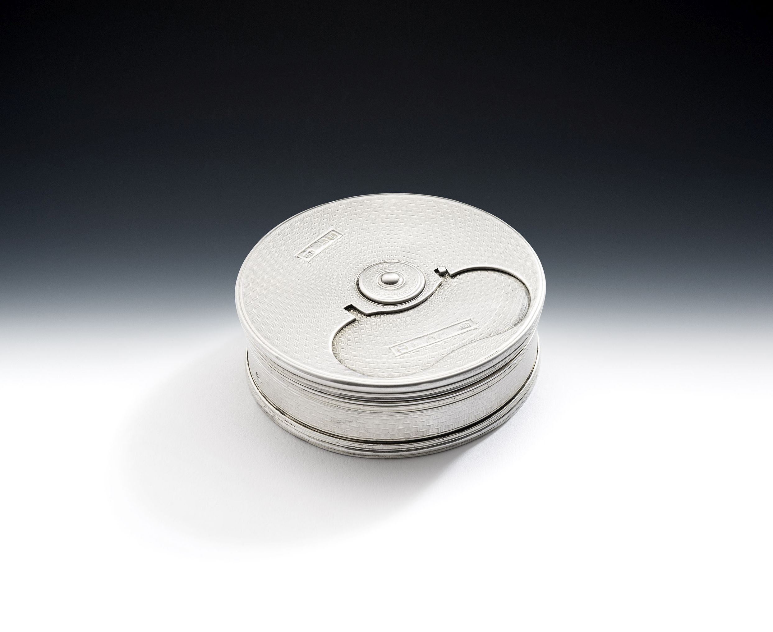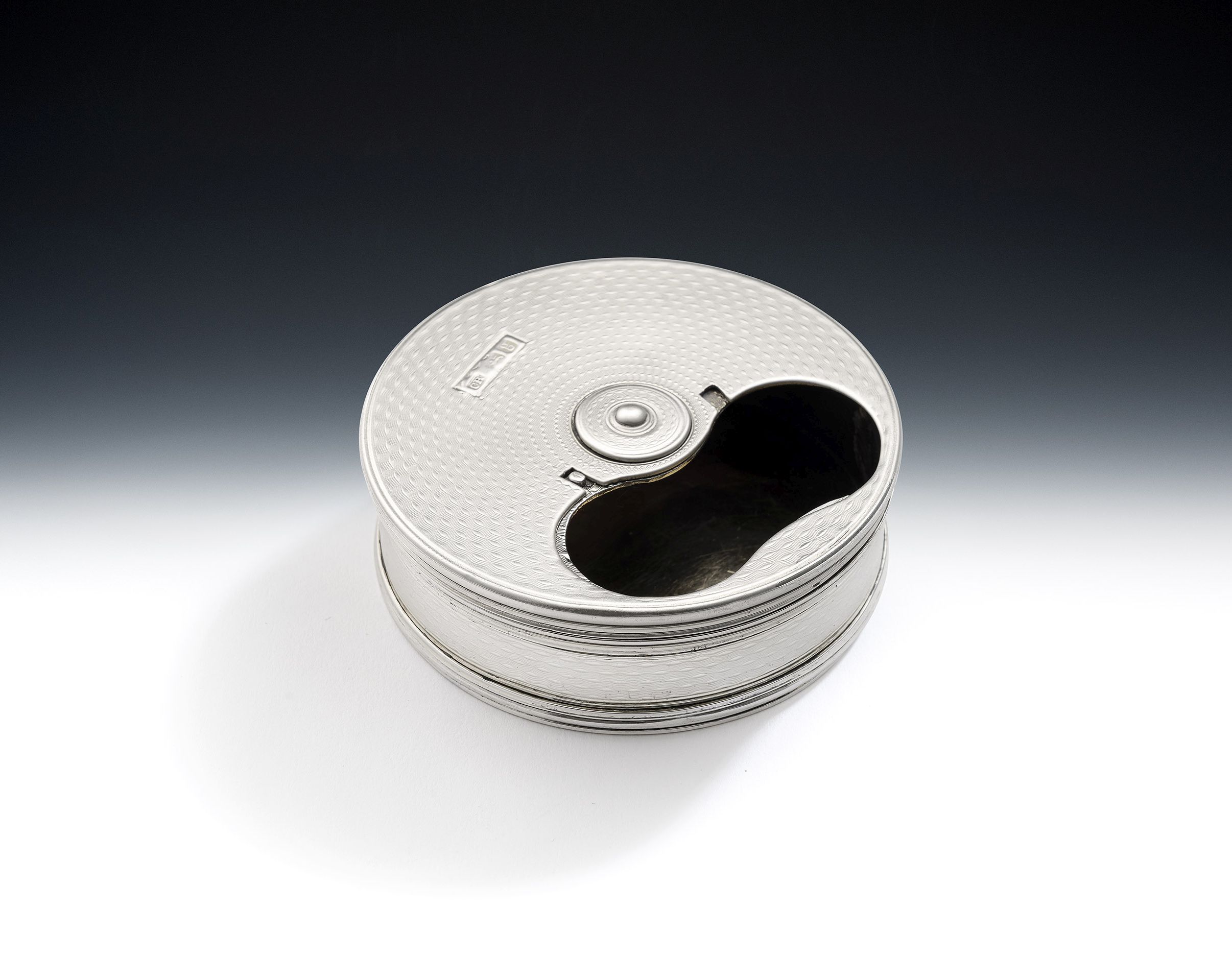 This is the first time we have seen this type of box made in silver. This example is circular in form and decorated on the cover and base with concentric engine turning. The sides are also engraved with engine turned designs, enclosed by plain, protruding, horizontal bands. This is an exceptionally well made box, as the cover rotates around to reveal a small shaped opening, so that a reduced amount of snuff can be taken when offered around to others. This is why they are referred to as a "Miser's" Snuff Box. The Box is in excellent condition and has a finely gilded interior. It is marked in no less than four different places, such is the superior attention to detail. Charles Rawlings was one of the finest box makers of this period and this is shown in the quality of this piece.