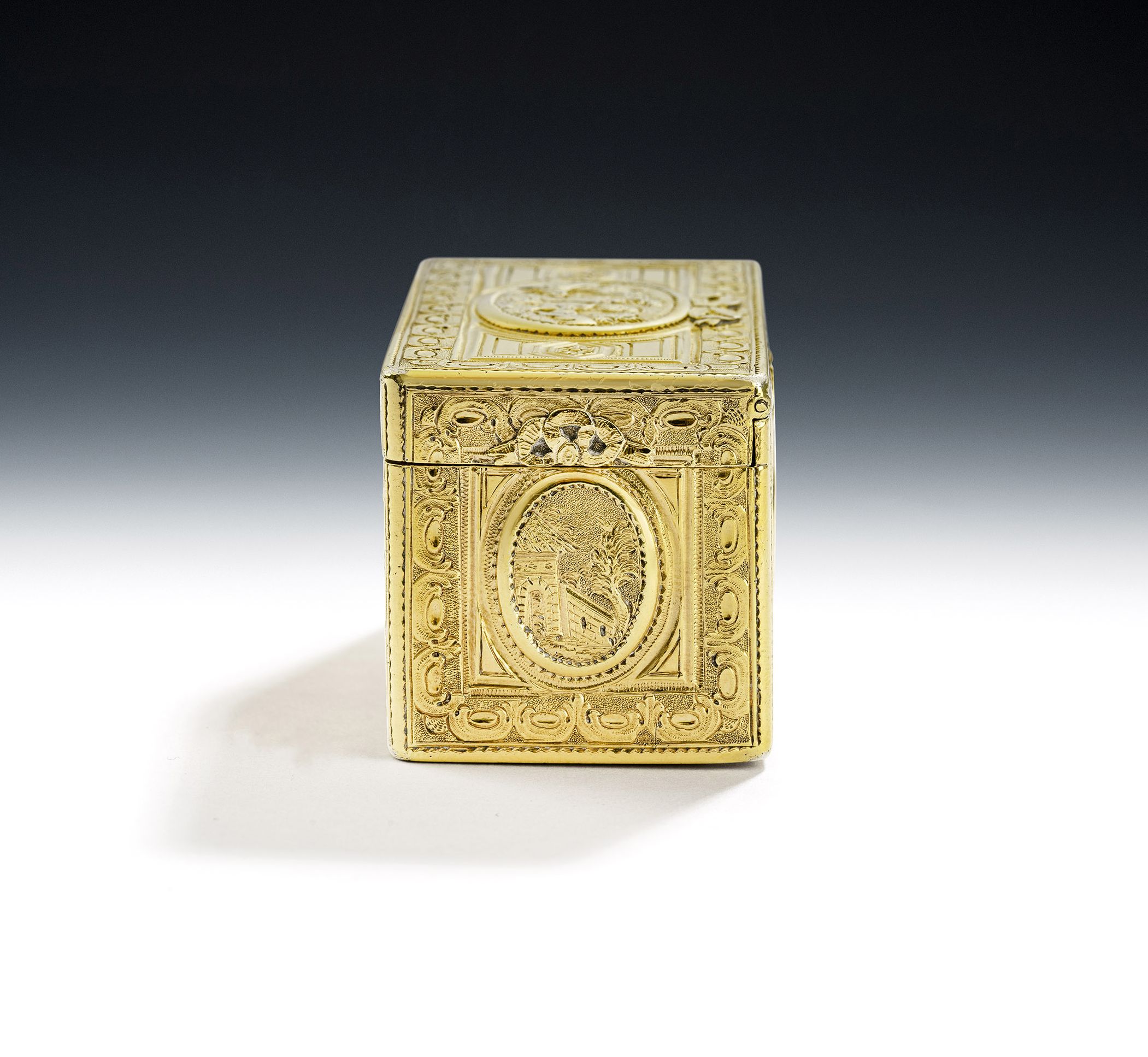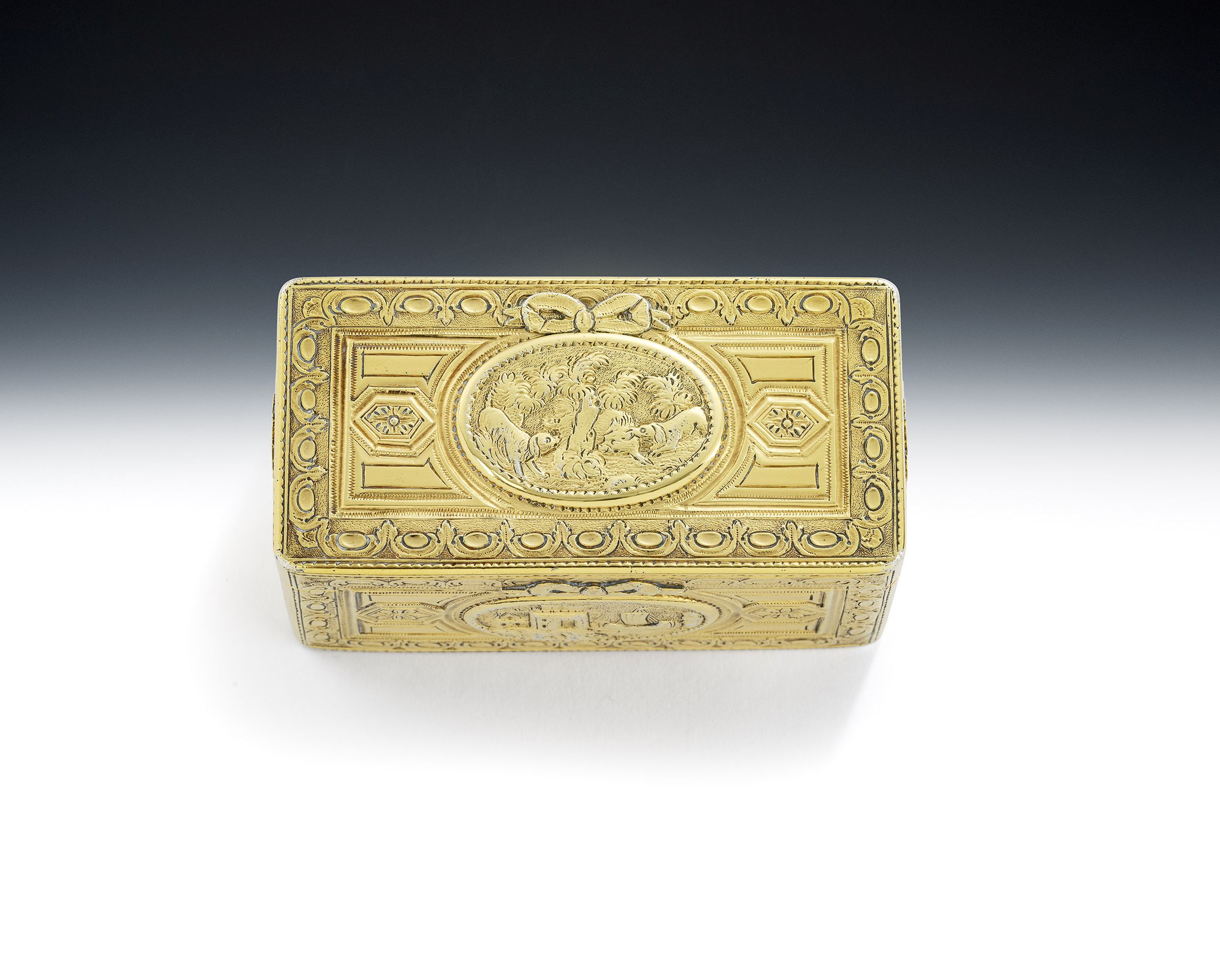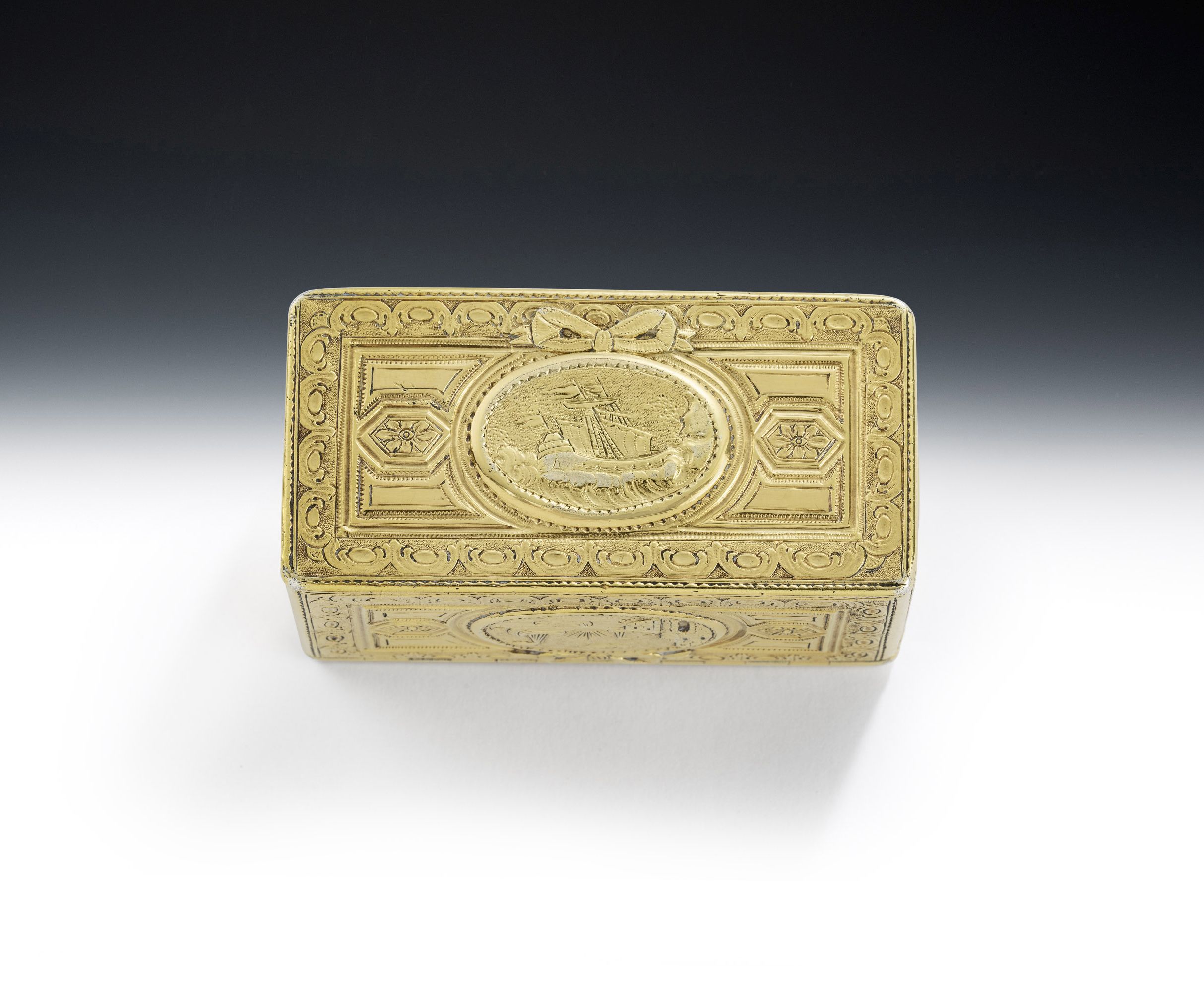 This very rare box is silver gilt and cast and has an unusual deep, broad rectangular, form. Each of the sides display an outer frame decorated with roundels and bright cutting on a matted ground. The larger sides also display unusual geometric designs including flower heads in hexagonal cartouches. Each of the sides also displays an oval medallion, three depicting ships in sail, some in harbours and some out at sea. The medallion on the cover depicts two running dogs in a rural landscape. The two smaller side medallions show buildings in a rural landscape. The quality and weight of this box is quite exceptional, as would be expected from this special maker. We feel that John Linnit is copying the designs of similar boxes of the period which were made of gold. This piece is in excellent condition and is very well marked in the base and on the underside of the cover.