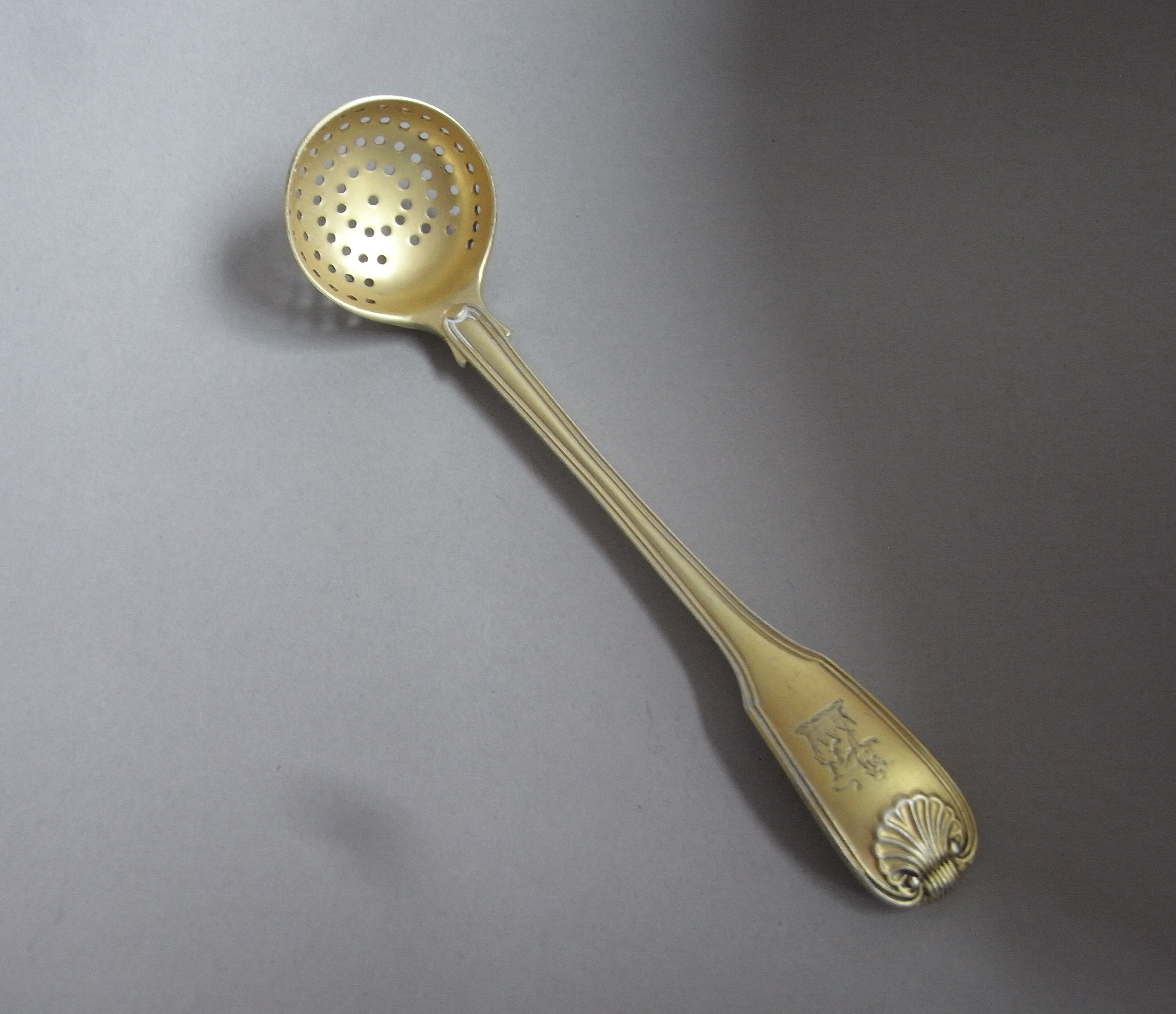 The vases come with a pair of associated sifter spoons made in the fiddle thread and shell pattern, with pierced bowls and engraved with a contemporary Crest.