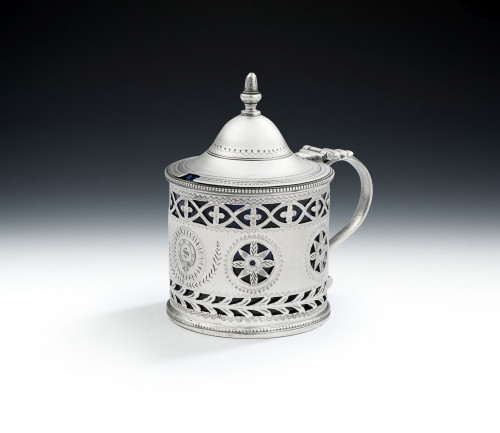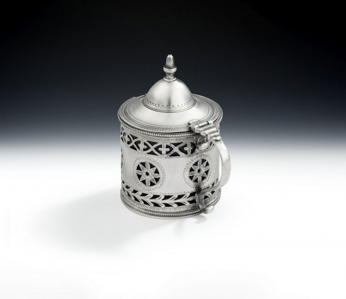 The Sauceboat stands on an oval pedestal foot decorated with applied beading and a band of bright cut designs. The high, elongated, main body also displays a beaded rim and is engraved with an upper border of unusual crisp bright cut and prick dot designs. Both sides of the main body are engraved with an oval cartouche containing a set of contemporary script initials. Unusually, this example has a high loop handle, also decorated with beading, which is seldom seen on sauceboats of the period. The sauceboat is very well marked in the foot, is in excellent condition and is of a very good gauge and weight.
