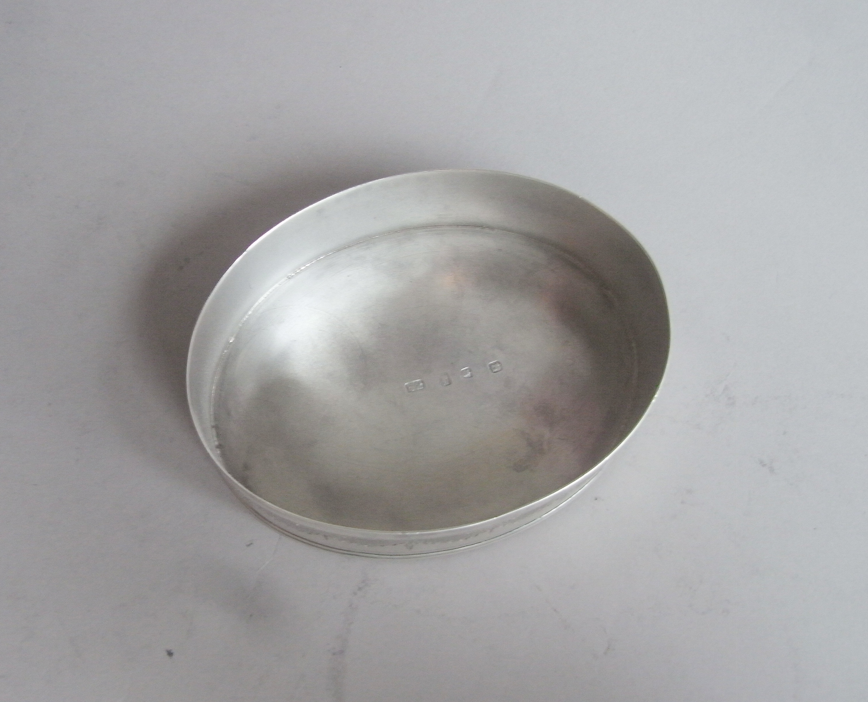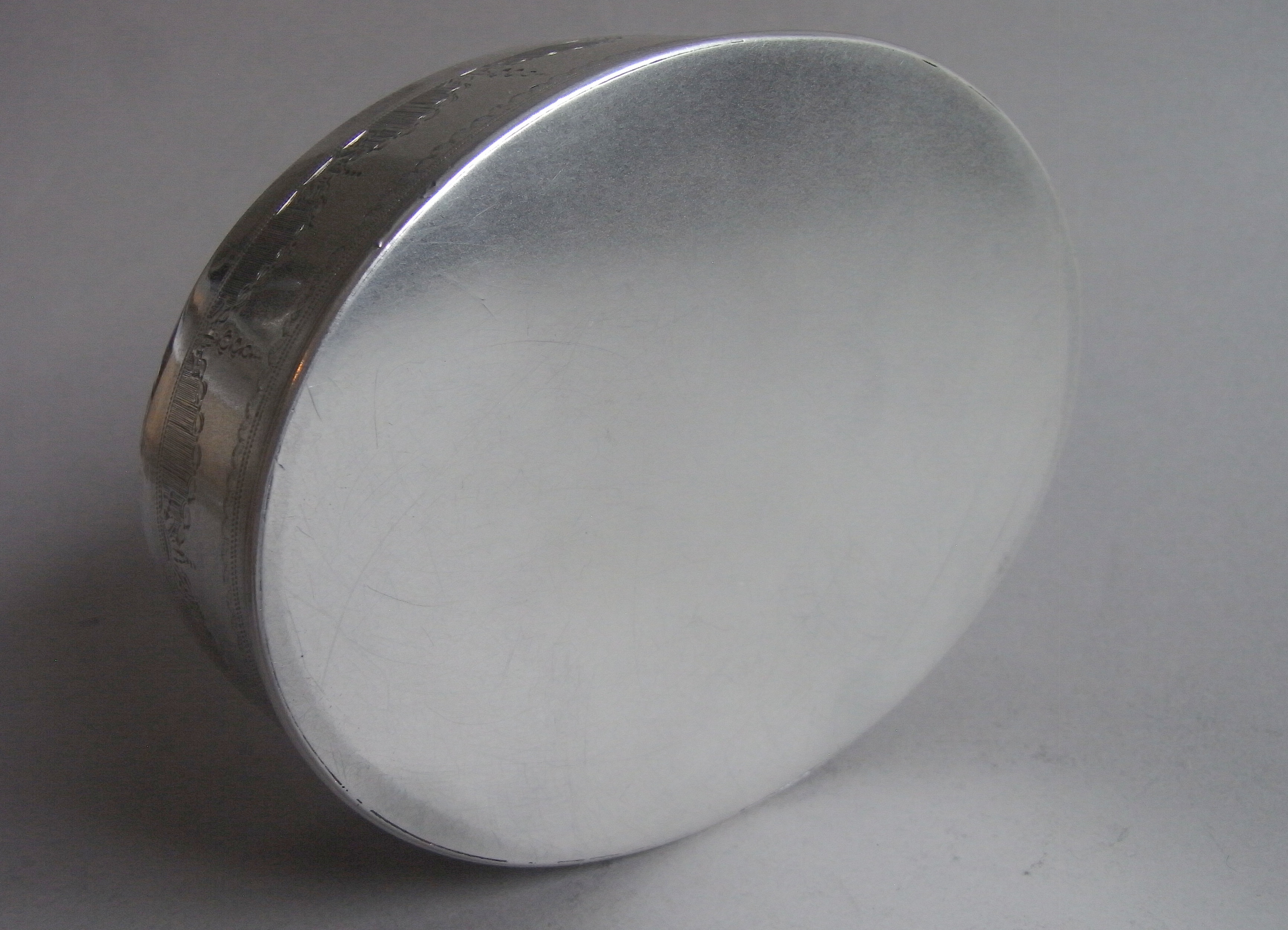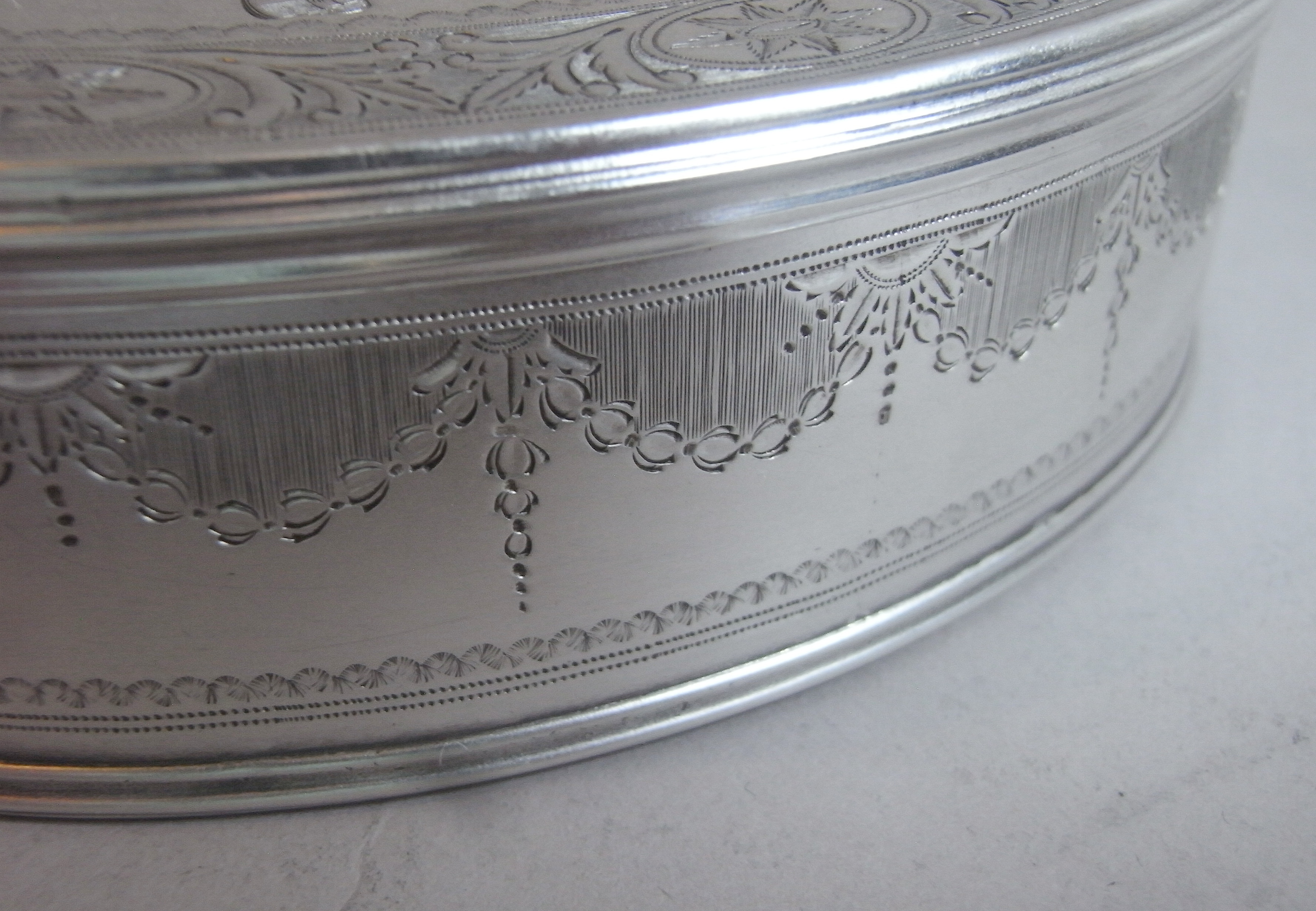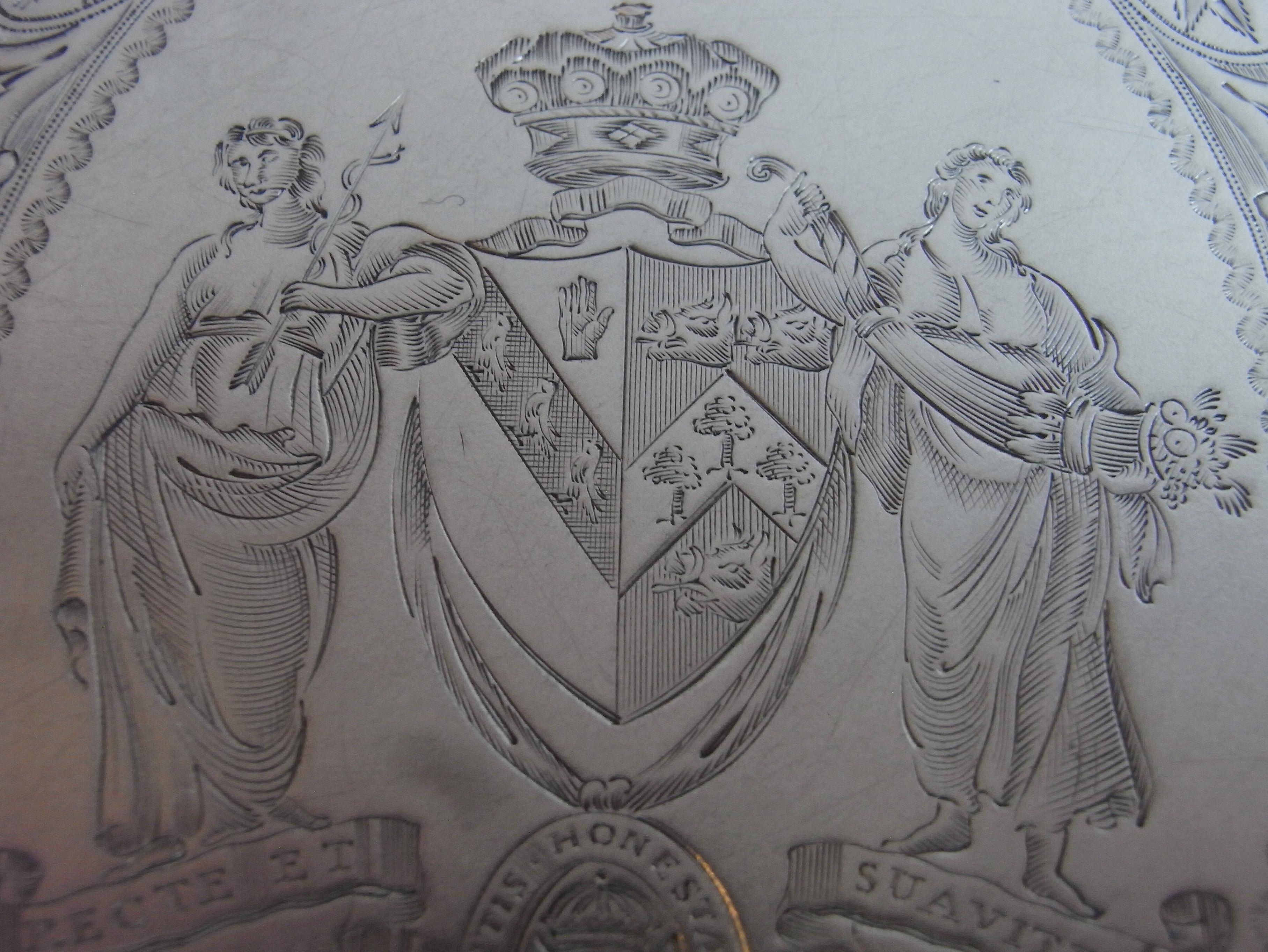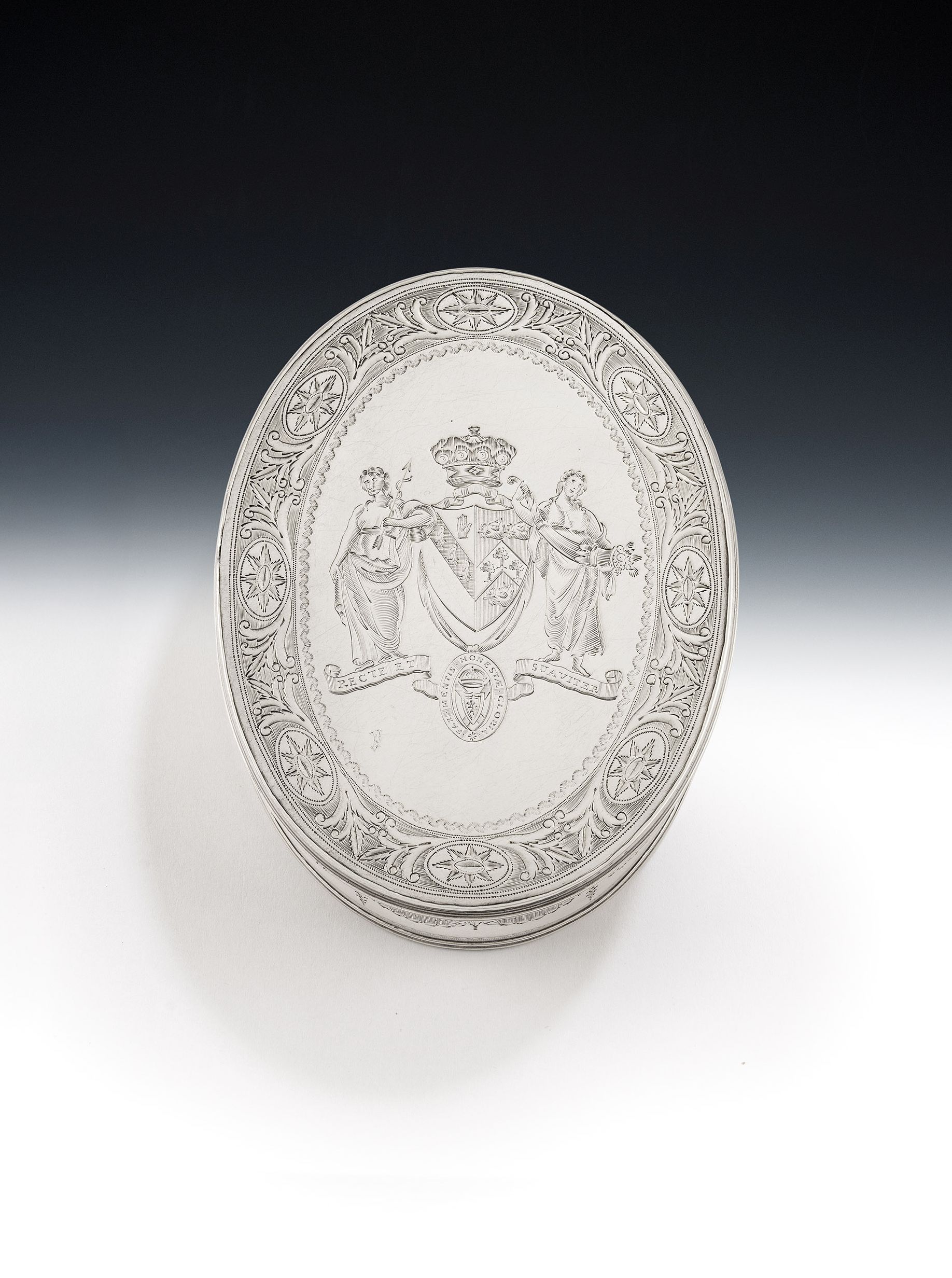 The Box is modelled in a large oval form with a reeded base and cover. The sides are beautifully engraved with bright cut blue-bell swags and flower head details, as well as prick dot wavy bands and linear panels. The pull off cover displays a beautiful outer band of raying flower heads in ovals, flanked by trailing foliate scrolls , all on a linear ground. The centre is exceptionally engraved with a contemporary Armorial, with Motto below and the coronet of a baron above. The Arms are flanked, on each side, with very finely detailed female supporters dressed as Greek Goddesses one holding an arrow with a serpent coiled around it and one holding a cornucopia of fruit. The engraving has been executed to the highest standard and is in very crisp condition. This piece has a plain base and when opened displays a full set of marks in the base and the maker’s mark and sterling mark on the cover. Hester Bateman did not make very many boxes during her career.