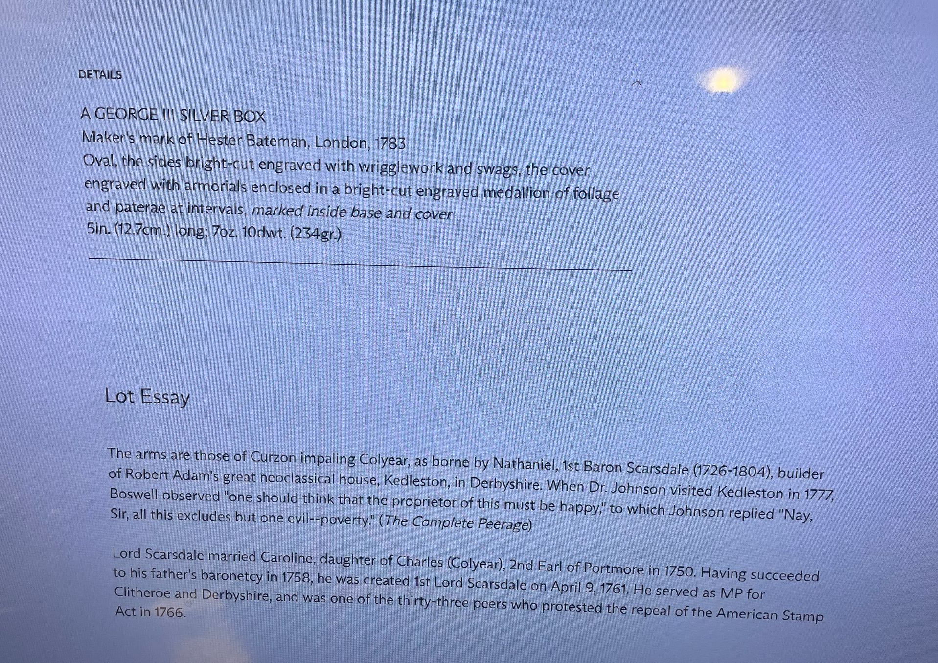 The Provenance is also very important as the Armorial Motto and Coronet are those of Curzon impaling Colyear, for Nathaniel, 1st Baron Scarsdale ( 1726-1804). Curzon was elected in 1747 as Member of Parliament for Clitheroe, holding the seat until 1754, when he took over his father's seat for Derbyshire. In 1758 he succeeded his father to the baronetcy and the fabulous Kedleston Hall and in 1761 was created Lord Scarsdale. He later served as Chairman of Committees in the House of Lords.
