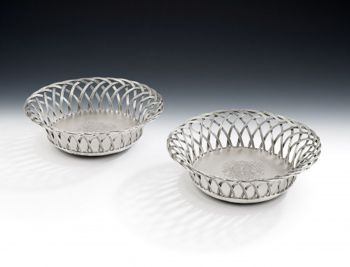 The Wine Coasters are modelled in a very unusual circular form, with high fluted, everted, sides decorated with raised trailing vines and grapes. The turned fruitwood bases are centred by a silver boss engraved with a contemporary Crest. The Crest is that as used by the Brattle family. Both are in excellent condition and are very well marked on the rim of the base. As you will appreciate, as well as being used as bottle or decanter stands, their deep form allows them to also be used on the table as baskets for a variety of uses, such as biscuits for cheese, grapes etc. Matthew Boulton was an exceptional silversmith and silver from his workshops is much sought after.
