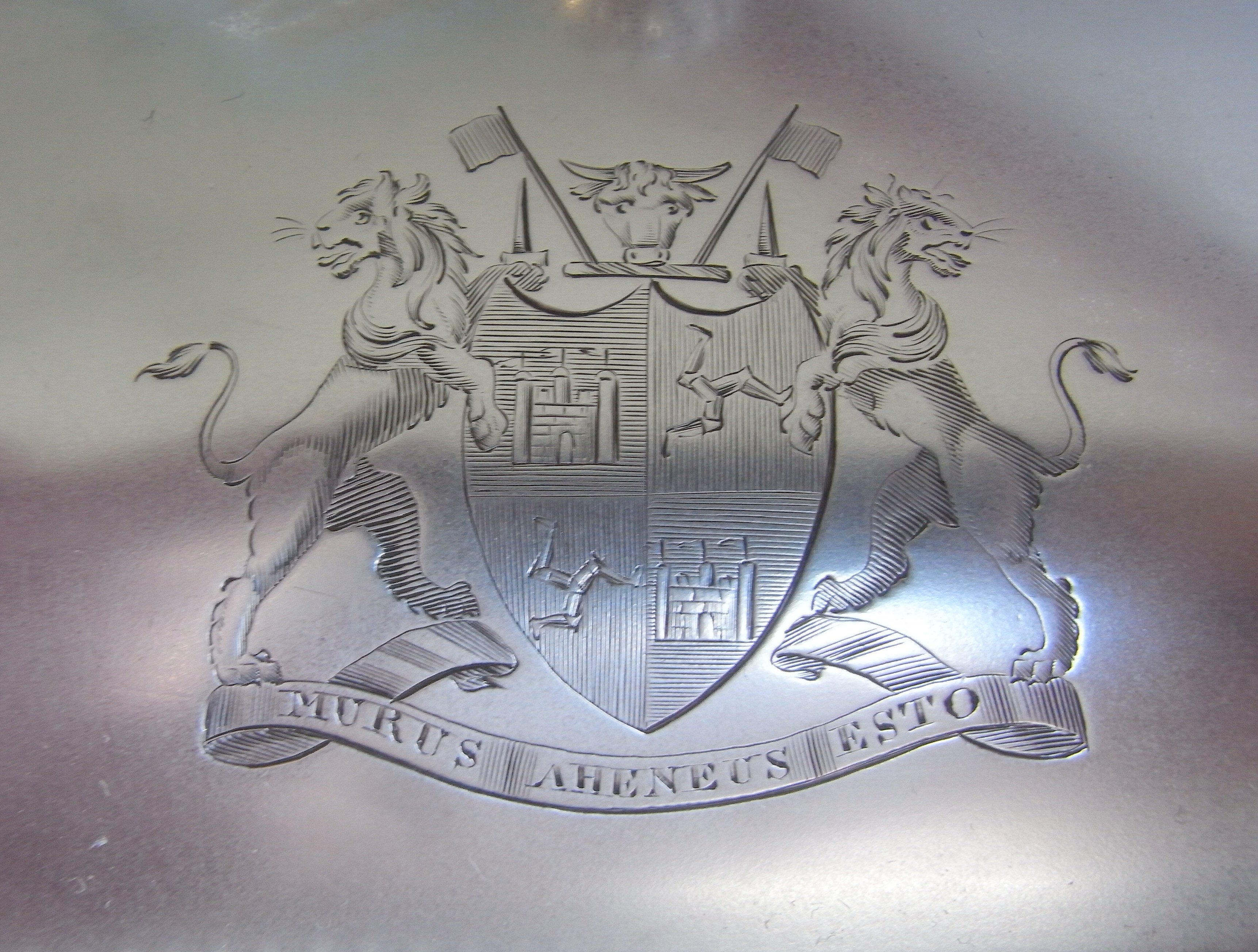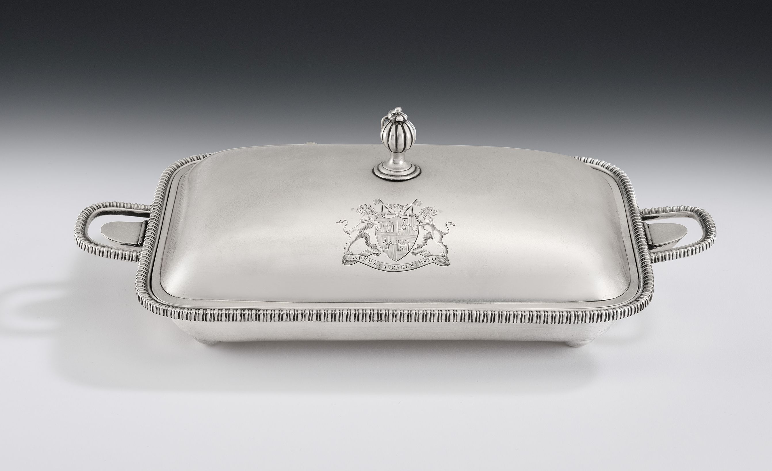 The Dish is rectangular in form with a rim, and side handles, decorated with gadrooning. Each side also displays hinged sections, by which the hot water compartment, below, can be filled. The domed cover terminates in a lobed, globe, finial standing on a stepped platform. The Dish stands on four bun feet and the cover can be removed by taking out the hinge pin. The front of the cover is also engraved with a contemporary Scottish Armorial, with supporters each side, and motto below, engraved on a banner. The piece, unusually, also has its rectangular interior pans, where the toasted cheese would have been placed and which would be presented when ready for eating. Each pan has a side handle, is fully marked, and engraved with the family Crest, with the Motto above. Cheese Dishes are seldom found intact, with their original pans. The Dish is fully marked on the base and with the maker's mark, town mark and sterling mark on the inside of the cover, where the finial is attached. As we have intimated, all of the interior pans are fully marked. This piece is in quite excellent condition and is of an exceptional weight.