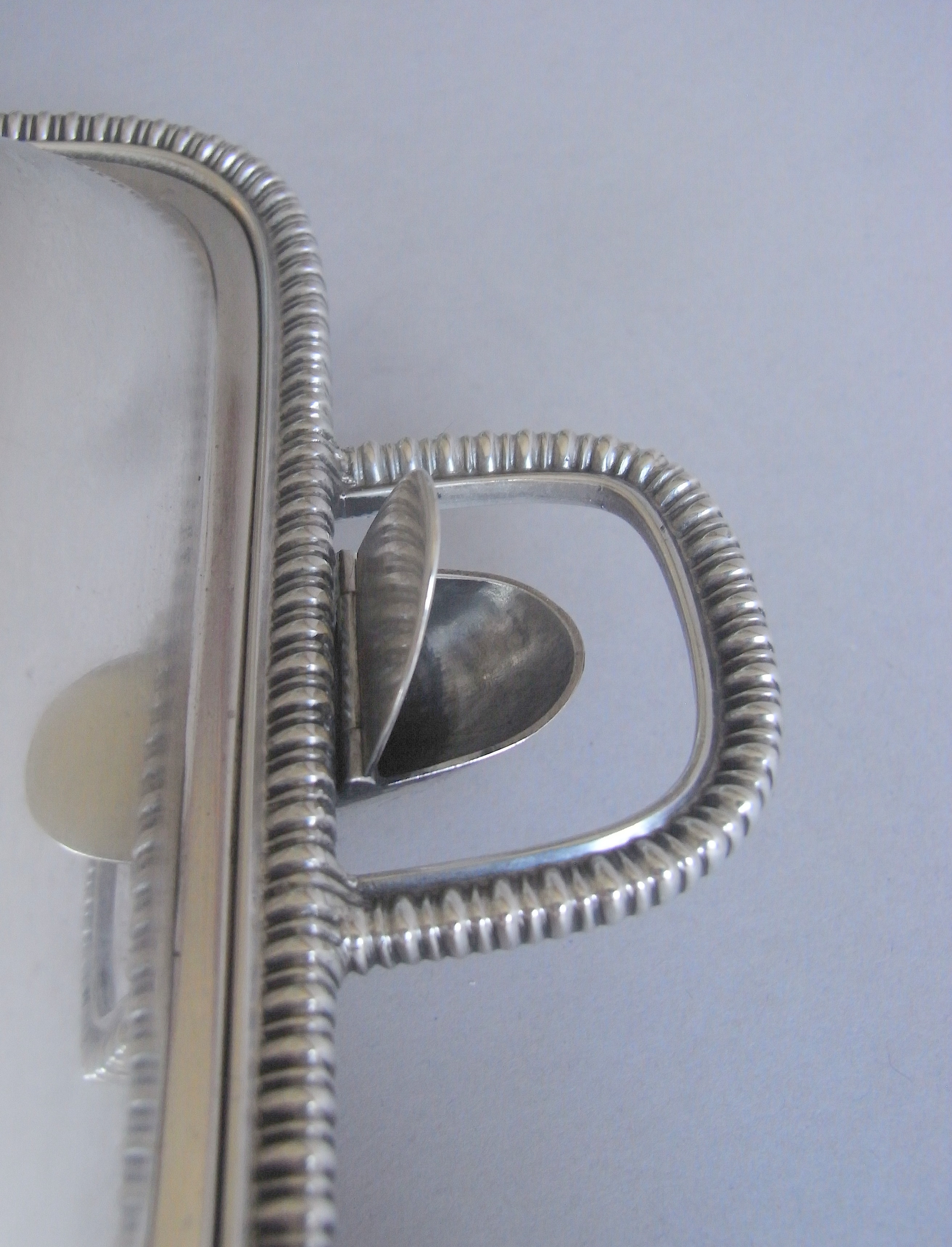 Among the innovations of the last quarter of the Eighteenth Century were specialised dishes for melting cheese on toast. The cheese toaster is equipped with a base hot water jacket, which can be filled on both sides. Squares of toasted bread were thereby kept warm while the cheese layered on top melted and bubbled by the heat of an open fire. The cover was raised to an angle and secured with a silver chain affixed to a ring on the finial and hooked to another ring at the rear. The reflective interior of the cover aided the process of melting the toasting cheese.