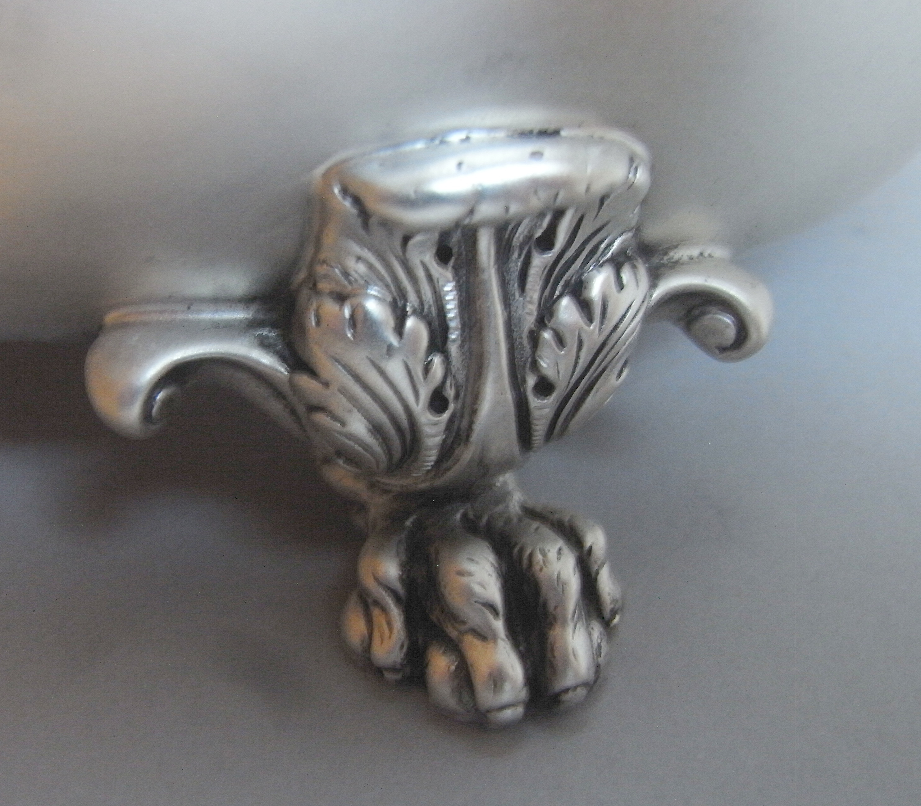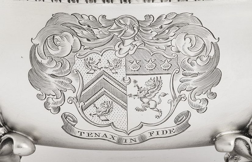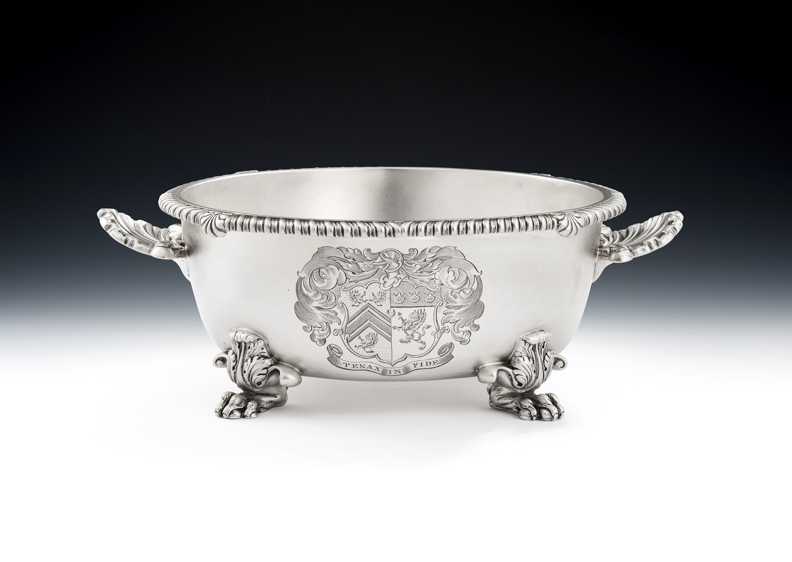 The Dish has a deep circular form and stands on four winged paw feet, decorated with leaf capping. The sides of the dish rise to an everted rim decorated with gadrooning and anthemion motifs. The side carrying handles are modelled as raying Rococo shells, with foliate scroll ends. The front of the main body is engraved with a contemporary Armorial, with Motto below engraved with the Motto "Tenax In Fide", this is all surrounded by a pluming scroll cartouche. The dish is in quite excellent condition and is fully marked on the side of the main body.