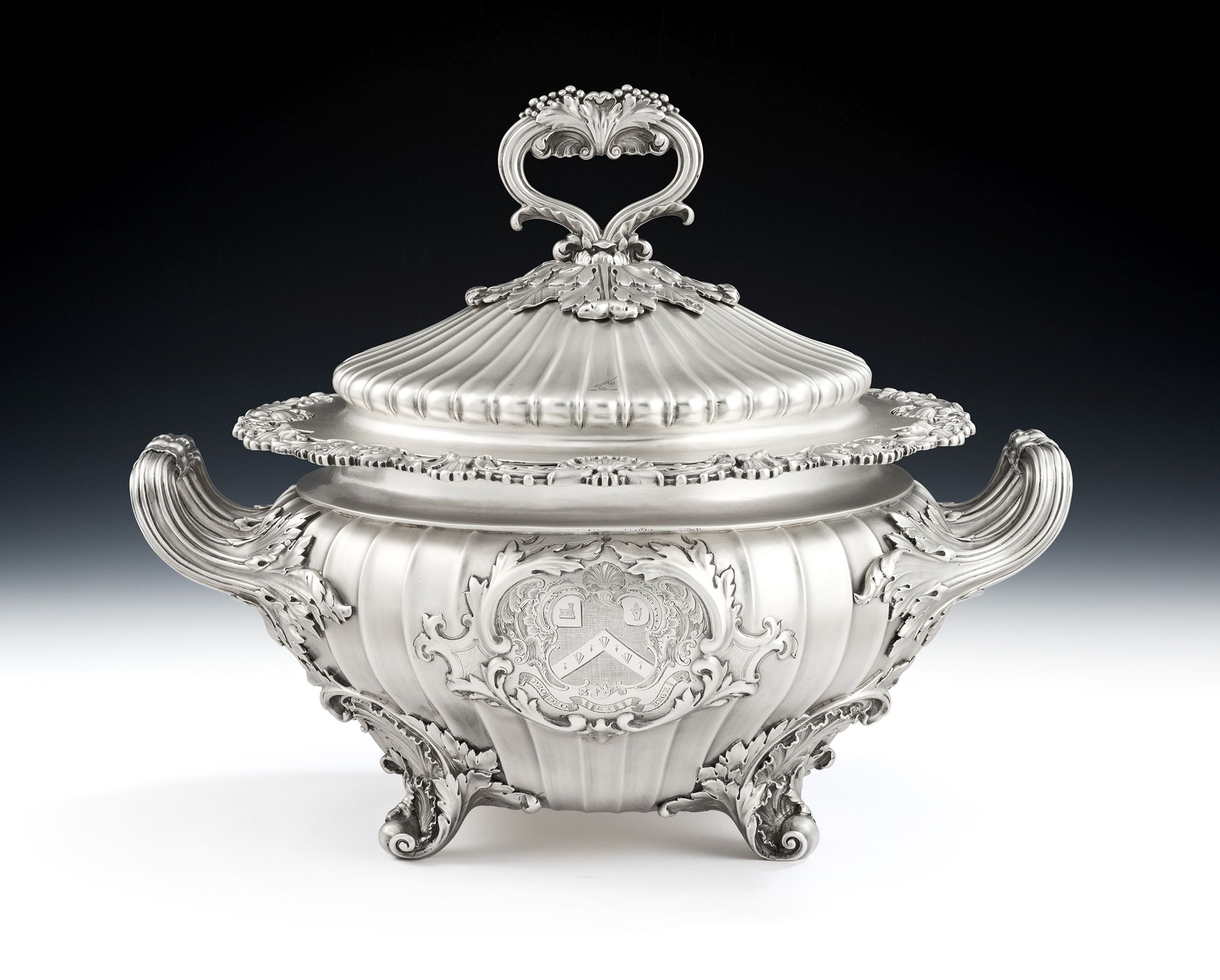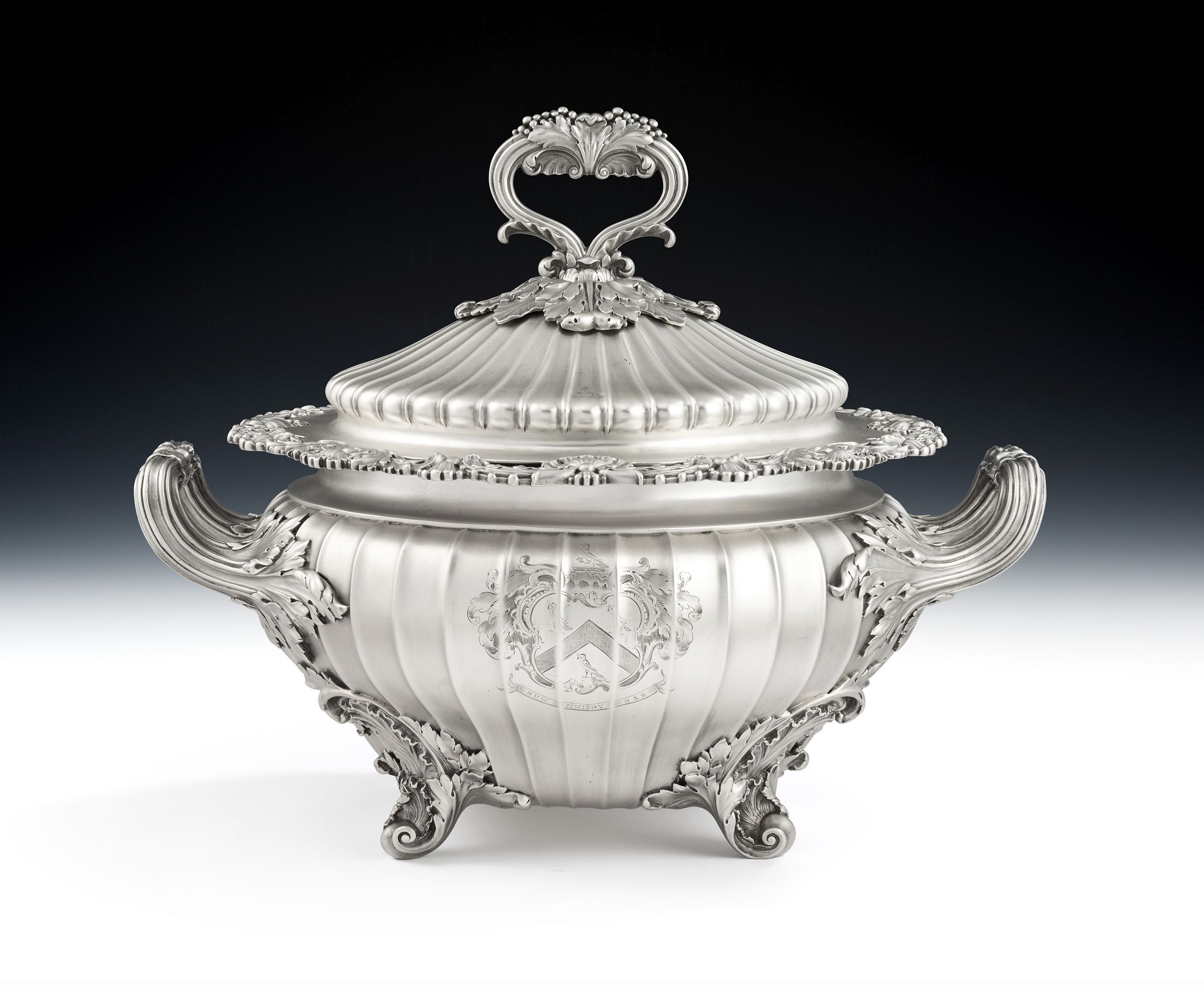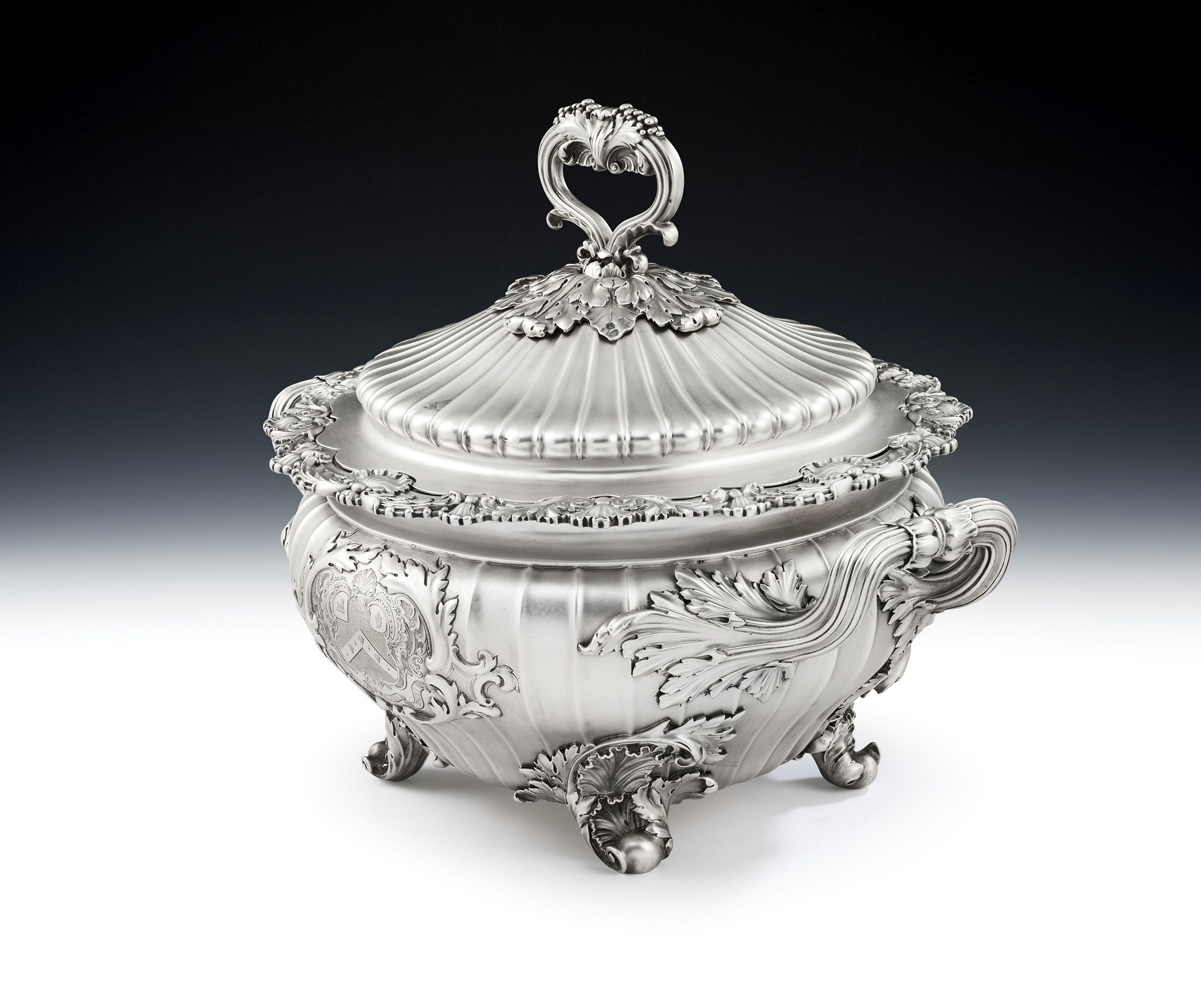 The Soup Tureen has a shaped circular form and stands on four scroll feet decorated with shells and displaying acanthus leaf mouldings where they are attached to the main body. The baluster shaped body is decorated with flat fluting and rises to an everted rim beautifully decorated with shells, acanthus scrolls and anthemion motifs. The bound, reeded, side handles also have acanthus mouldings and the front of the main body is engraved with a contemporary Armorial surrounded by a foliate scroll cartouche. The rear of the main body is also engraved with a contemporary Armorial. The conforming domed, pull-off, cover is also decorated with fluting and terminates in a reeded loop handle decorated with fruiting vines and shells. The handle sits on a platform of acanthus leaves in sizes. The cover is also engraved with two Crests. The Tureen is in excellent condition and is of the finest quality in design and production. It is of an exceptional weight and gauge.
